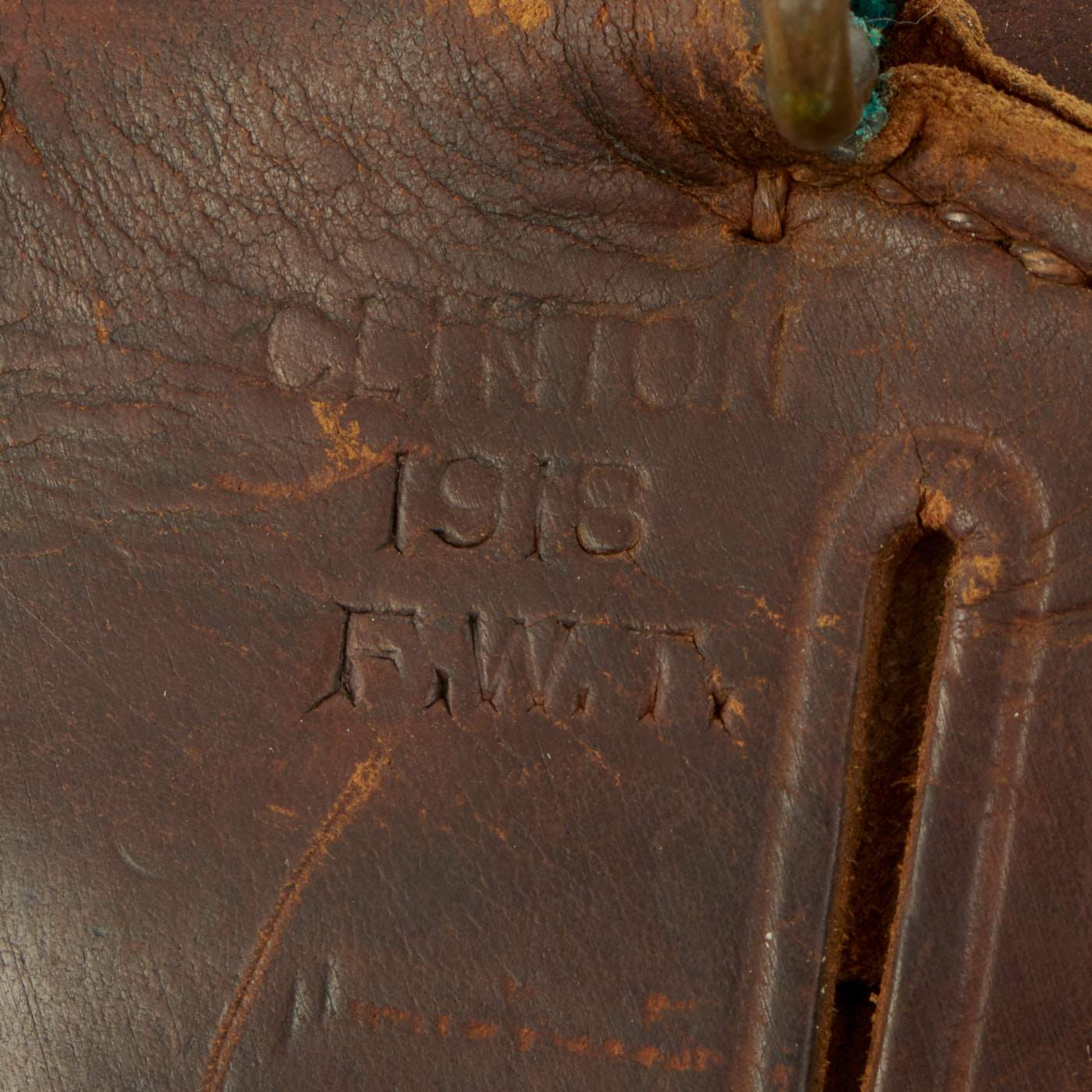 Original Item: Only One Available. This is a very rare totally original WWI Model 1916 holster for the .45 auto. This holster is maker marked CLINTON, for Clinton Saddlery of Clinton, Iowa. This holster was made in 1918 and inspected by F.W.T.. Clinton made many of these holsters for WWI only, and the date along with the brass belt clip indicates this is definitely a WW1 holster over 100 years in age.