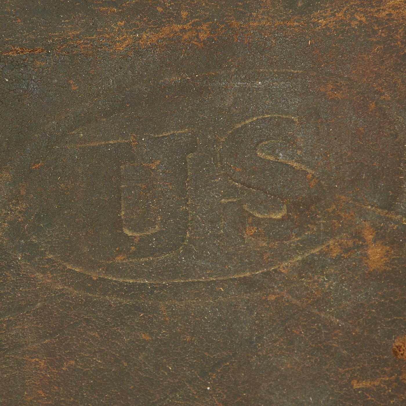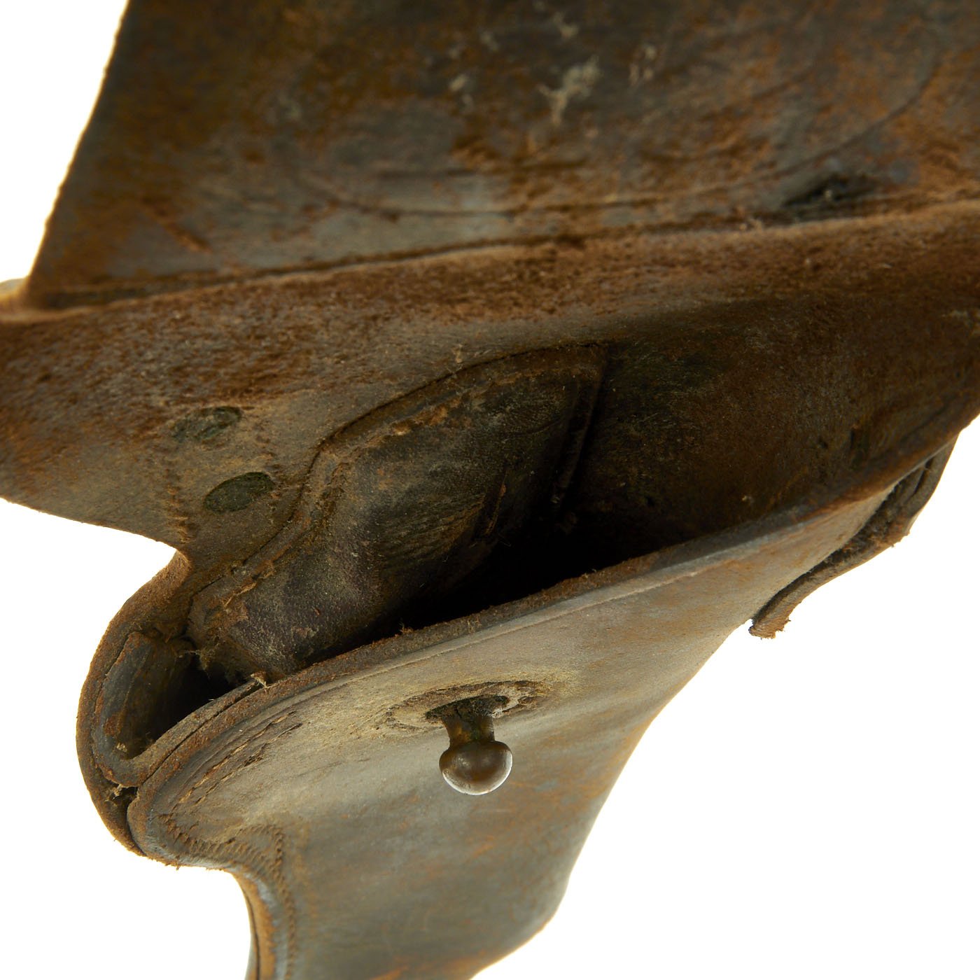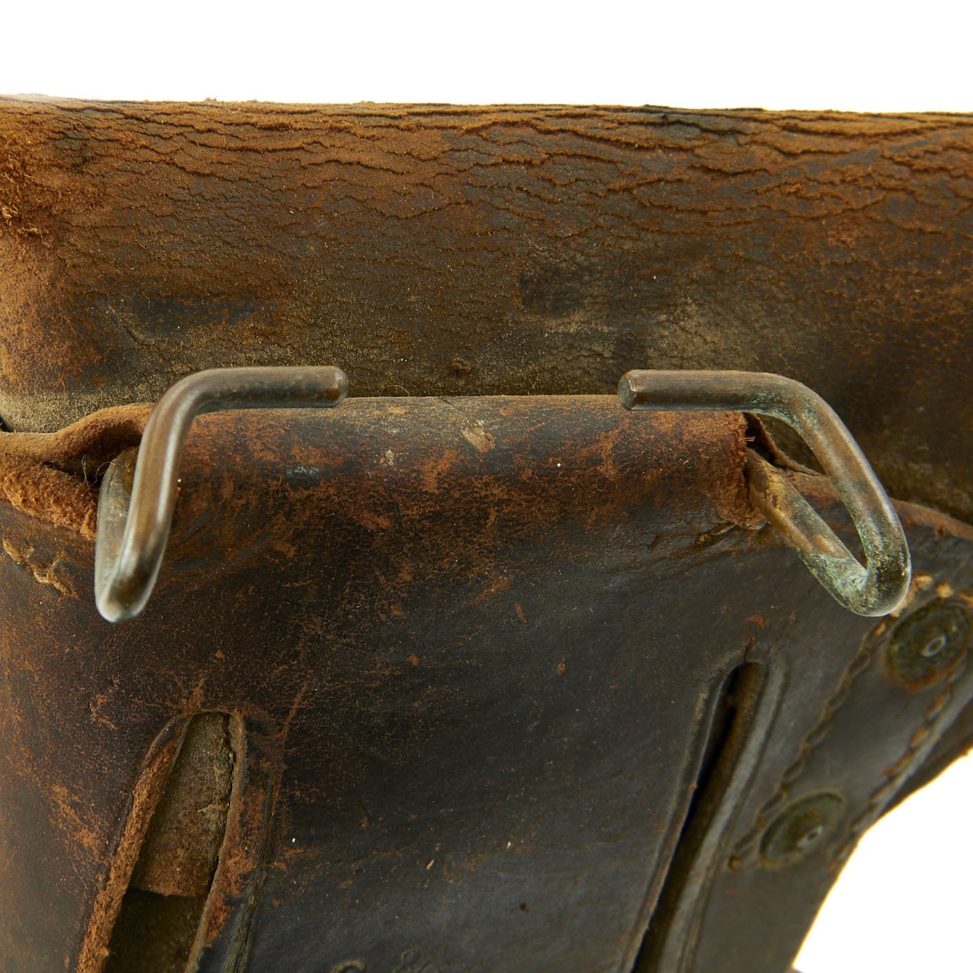 This M1916 holster in very good condition, with a deep russet brown color to the leather, with no major damage, and just wear and marks from age. All stitches still intact, with all brass parts still present, though there is some verdigris buildup around the rivets and hanger.