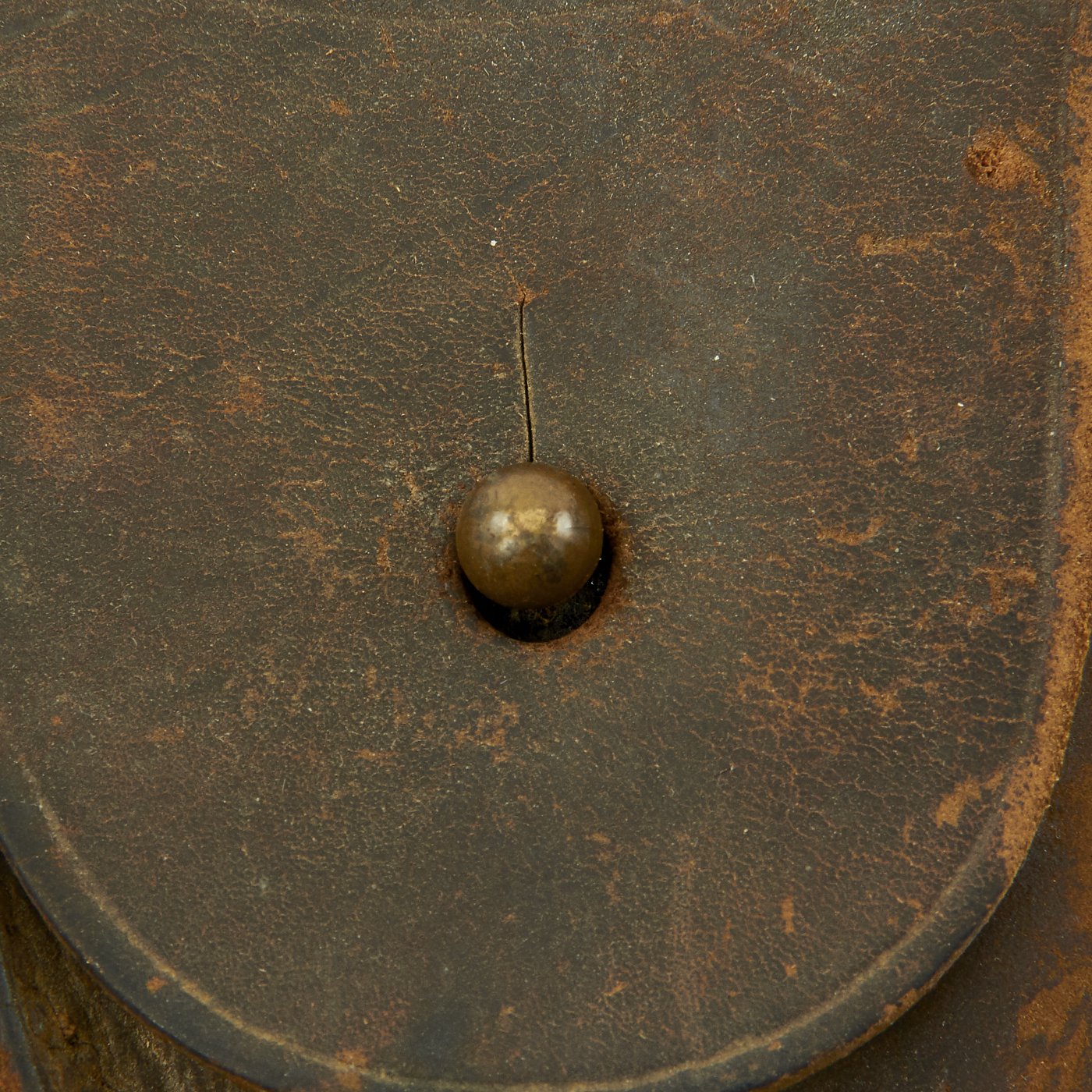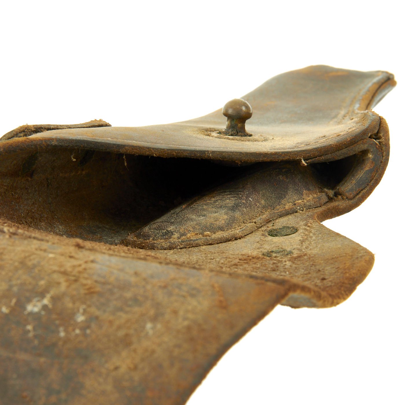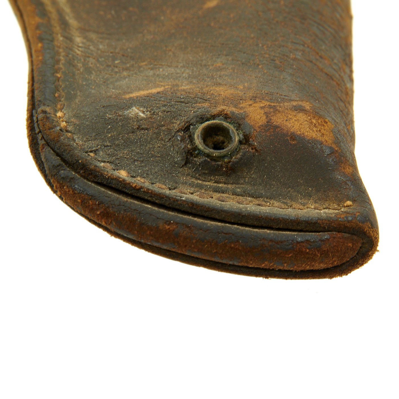 This M1916 holster in very good condition, with a deep russet brown color to the leather, with no major damage, and just wear and marks from age. All stitches still intact, with all brass parts still present, though there is some verdigris buildup around the rivets and hanger.