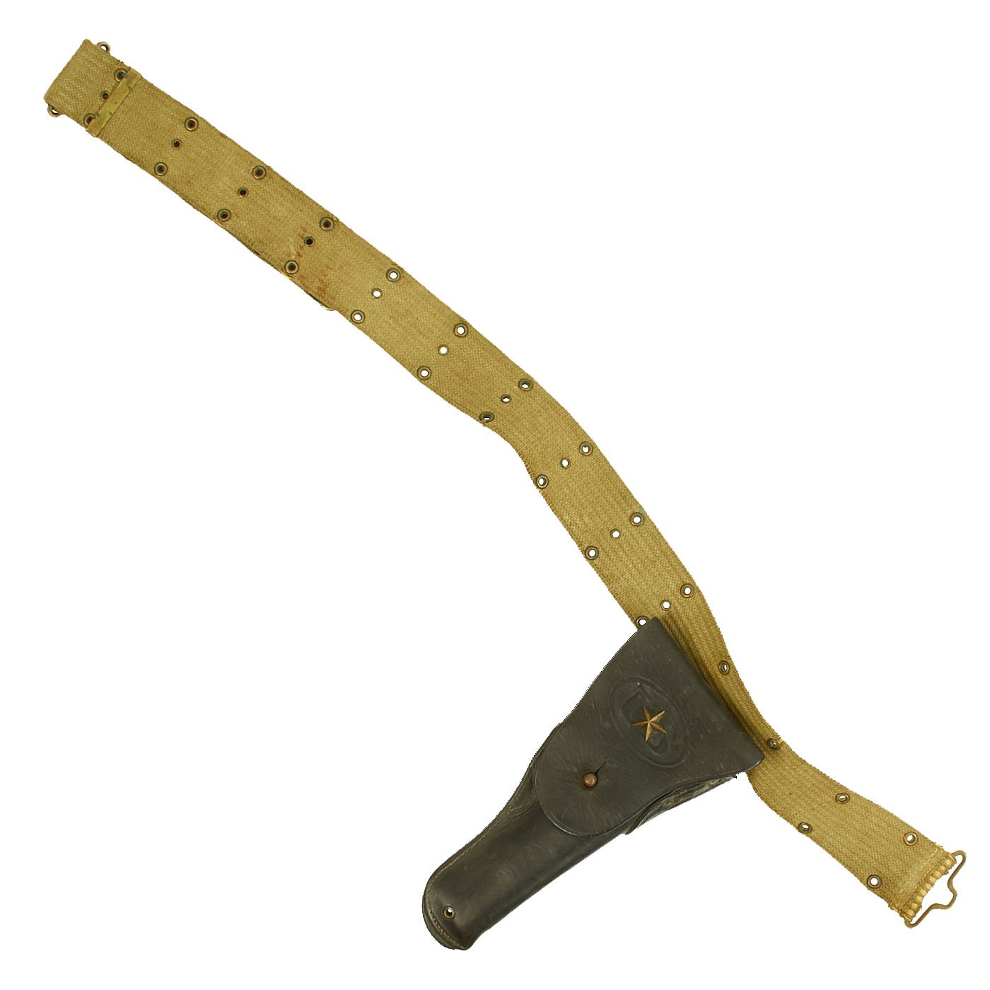 The belt and pistol are in good condition, but do show much wear. This is a set that saw long service in the field. There is a brass star attached to the holster flap, and there also appears to be a name inside, but we can't quite make it out.