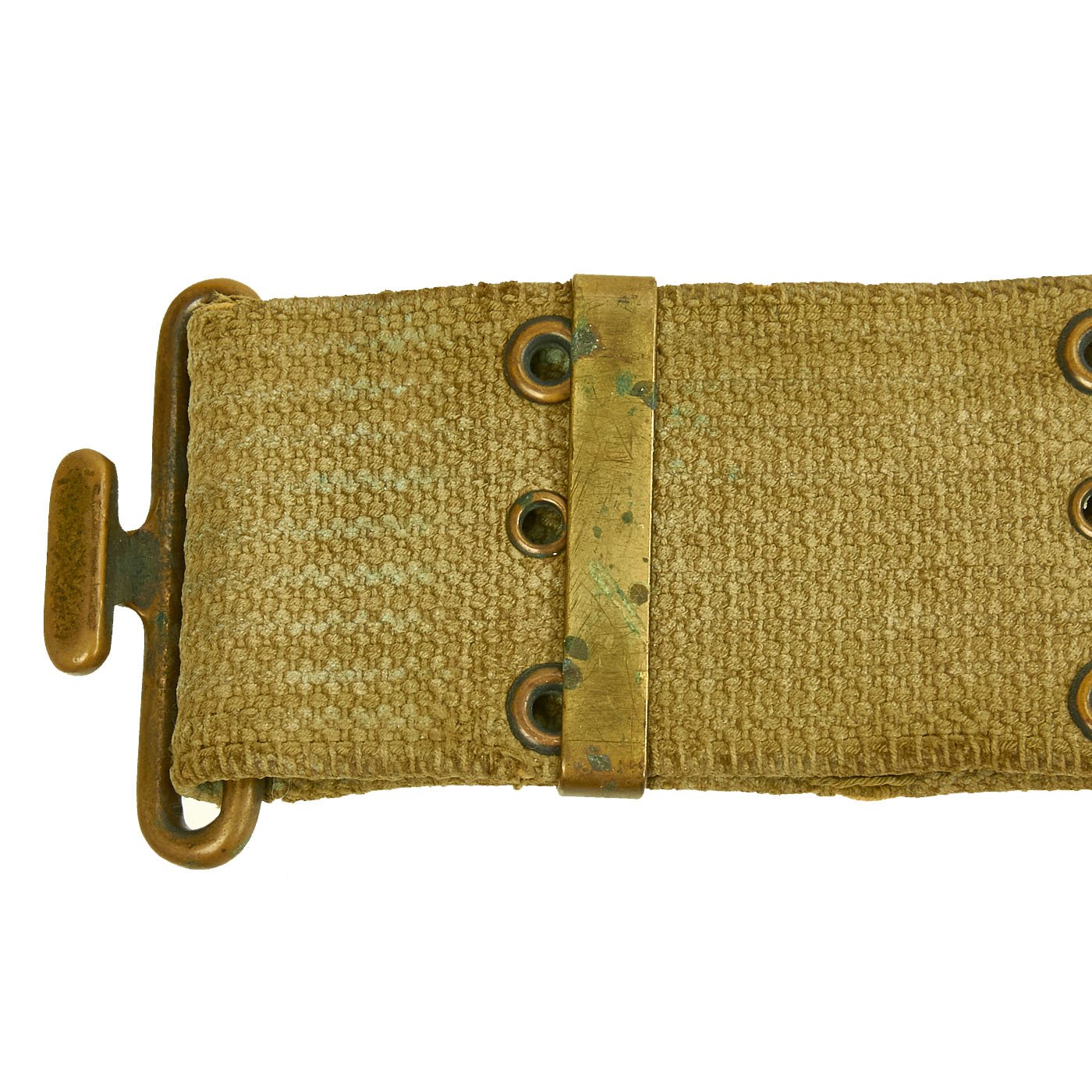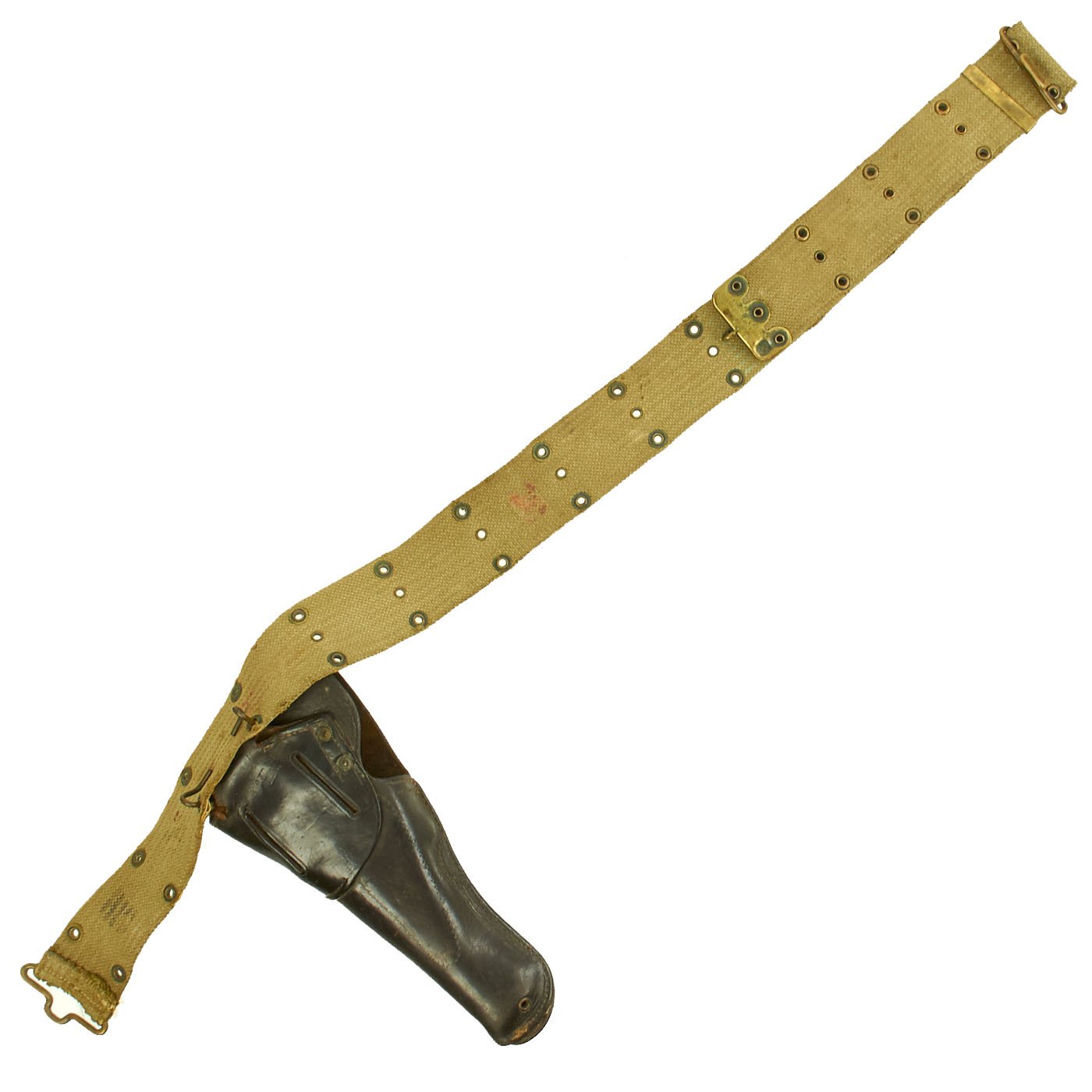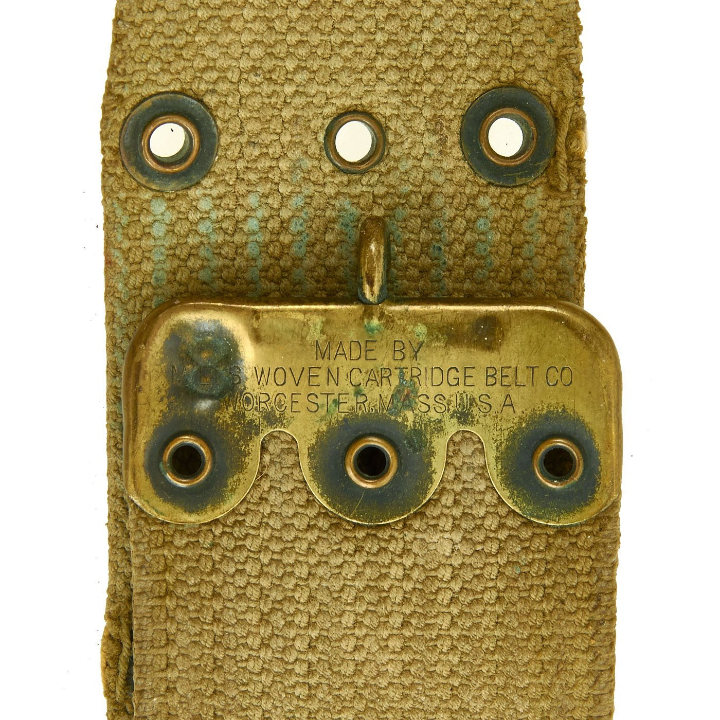 The belt is the typical brass fit Model 1910 pistol belt, which has the Mills "bullet" logo as well as a 1901 Patent Date on the end fitting. The other side has the MILLS WOVEN CARTRIDGE BELT CO address marking.