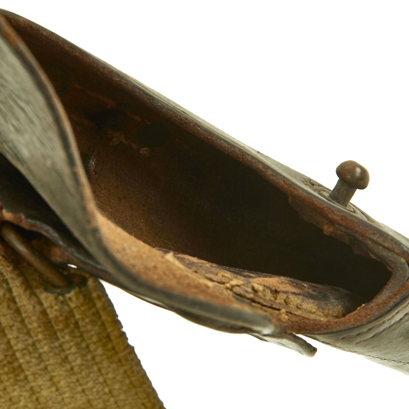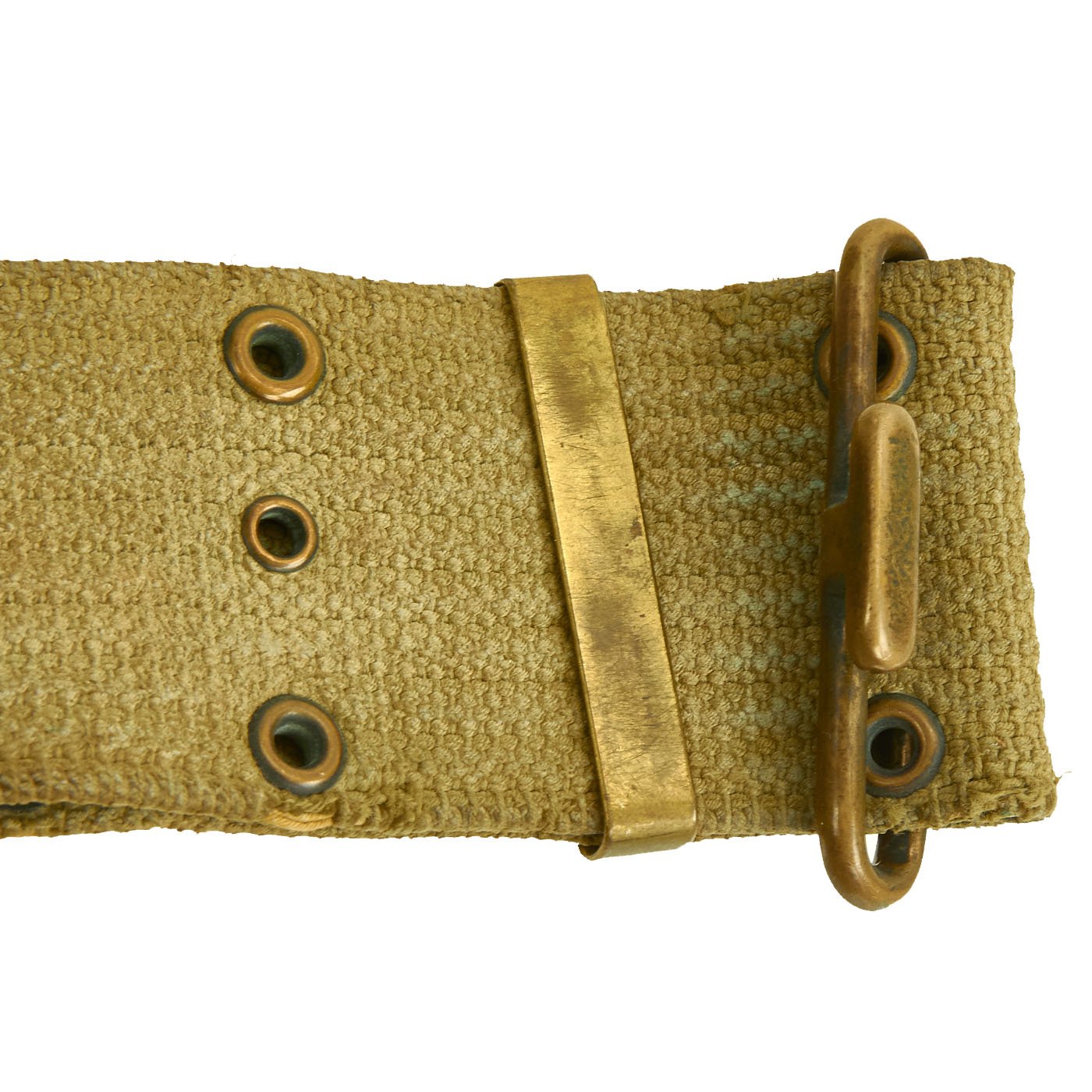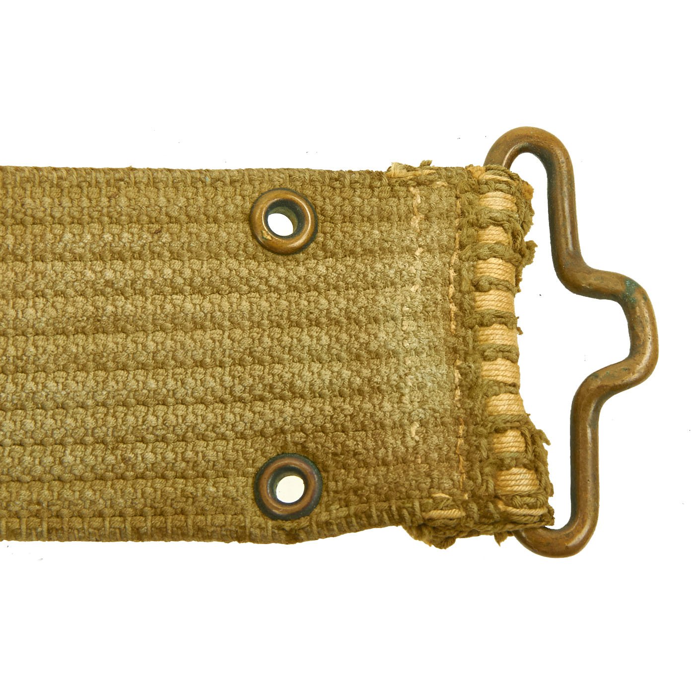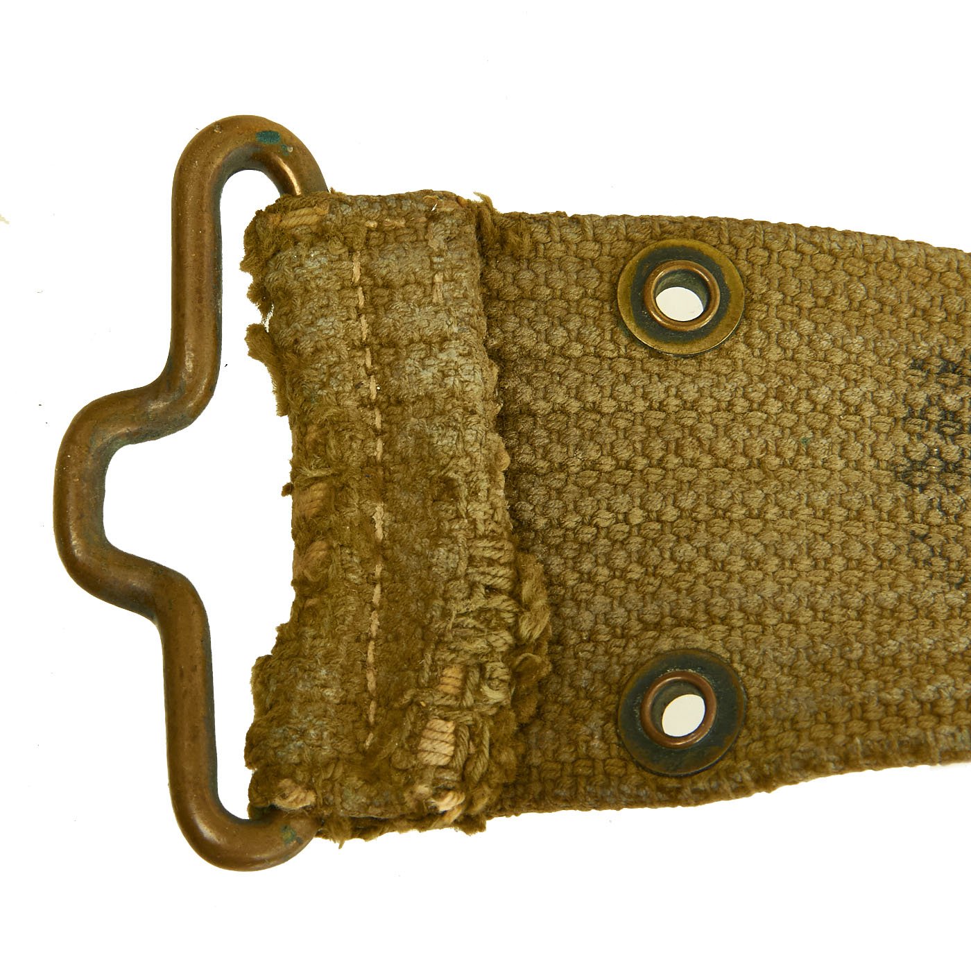 The belt is the typical brass fit Model 1910 pistol belt, which has the Mills "bullet" logo as well as a 1901 Patent Date on the end fitting. The other side has the MILLS WOVEN CARTRIDGE BELT CO address marking.