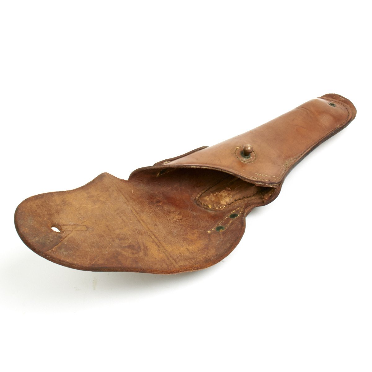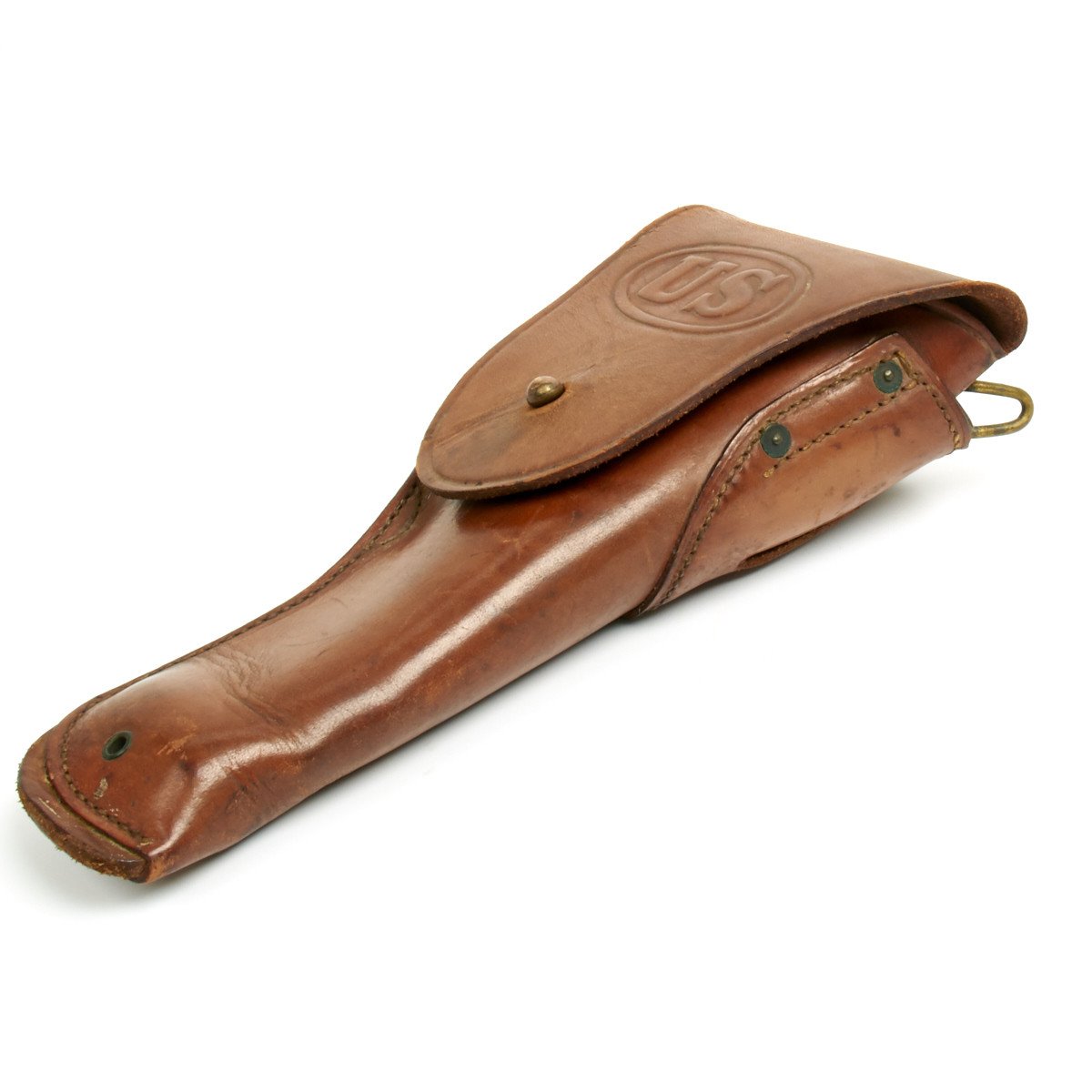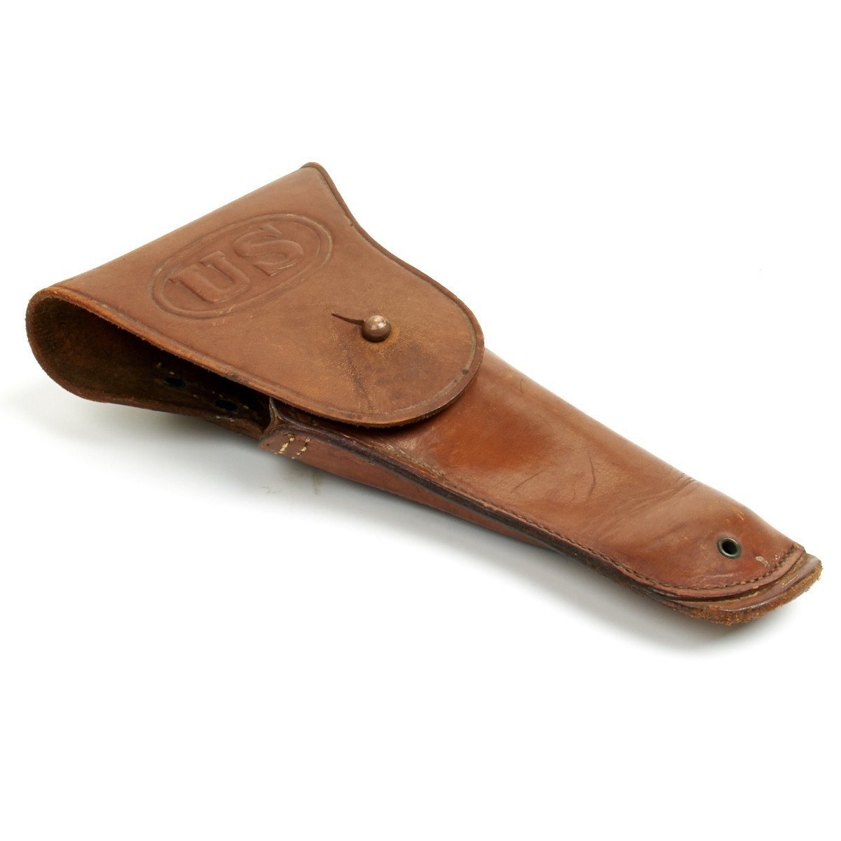 The M1916 holster was then put back into production and almost 3 million were made by 18 different commercial firms between 1941 and 1945. These holsters were embossed with a large U.S. on the cover flap, with the name of the maker and year of production on back.