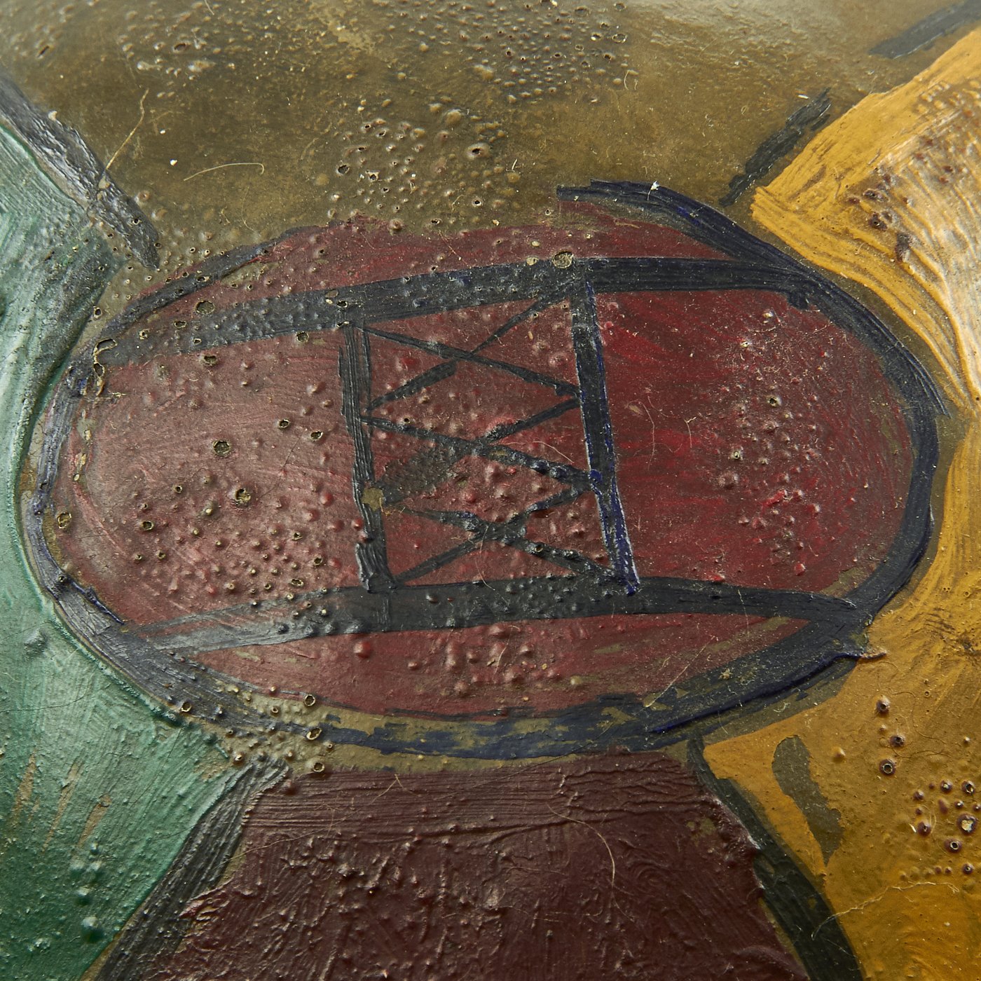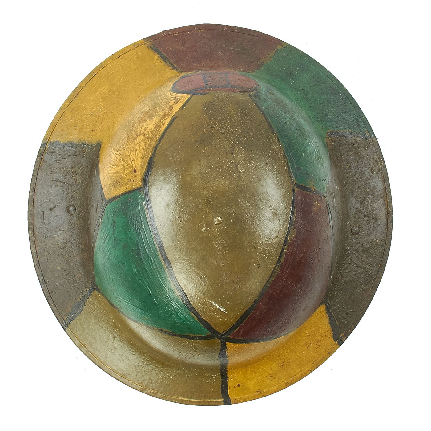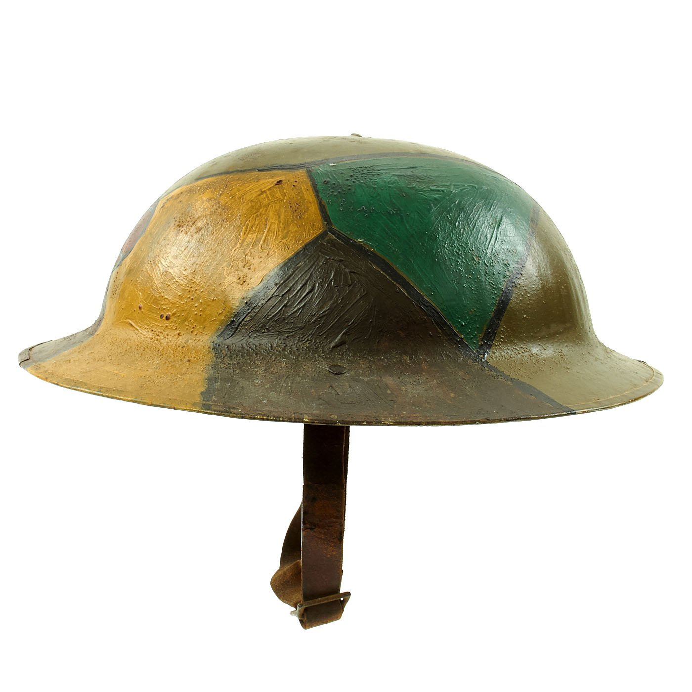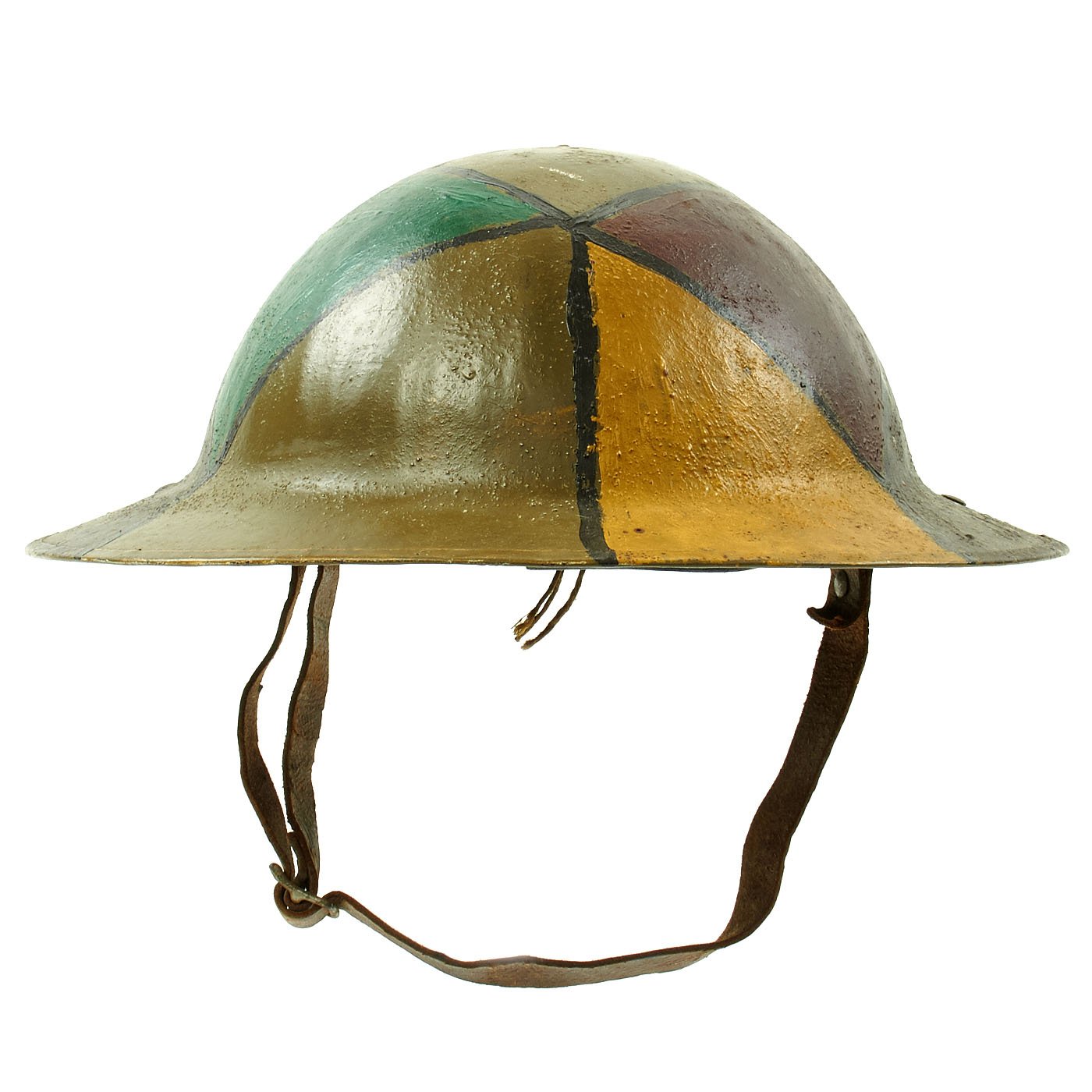Original Item: One-of-a-kind. This is a fantastic genuine Great War 30th Infantry Division hand painted camouflage helmet complete with its original liner. The helmet features original period colored panel camouflage paint in various shades of green, brown, red, and yellow. This was a very popular design for camouflage during WWI.