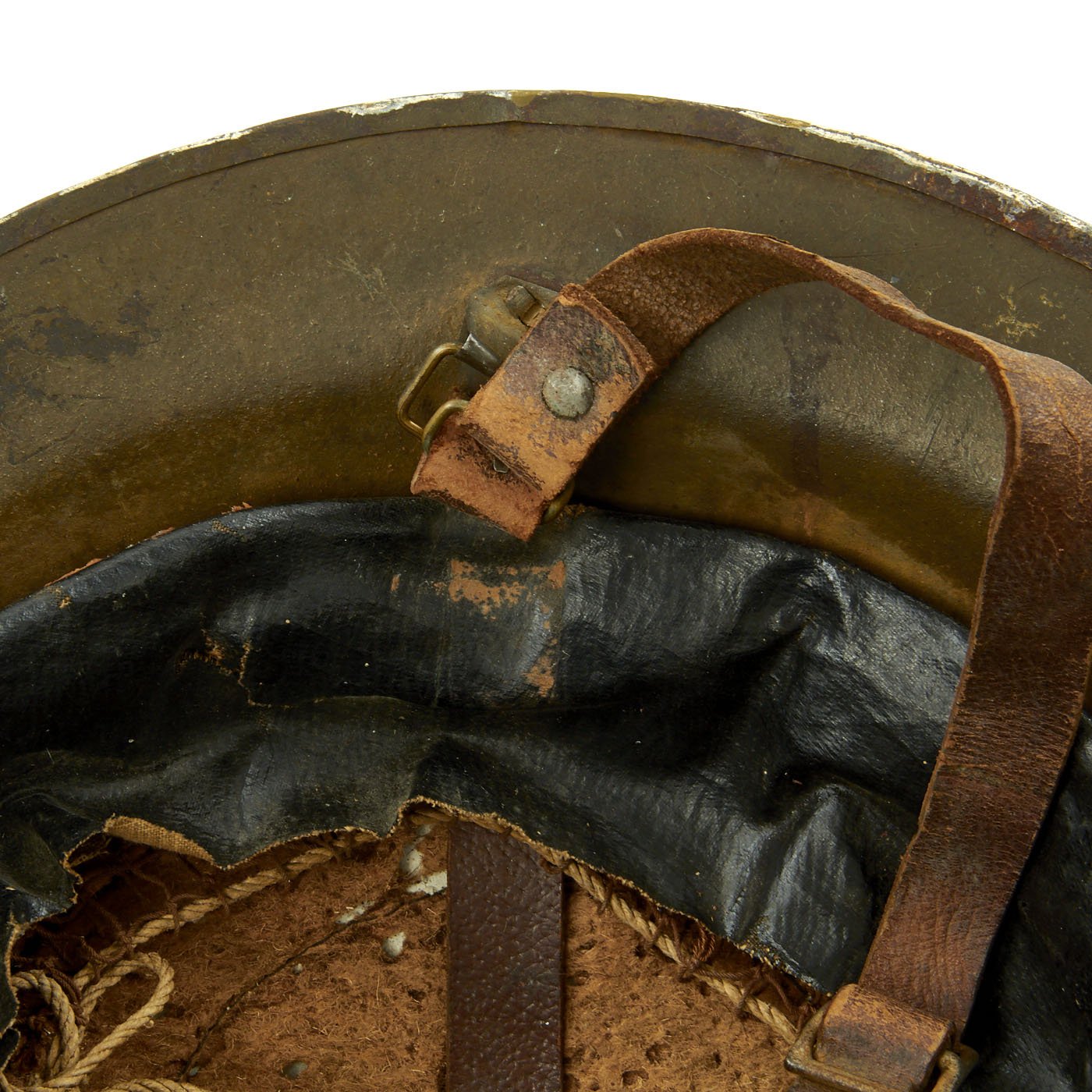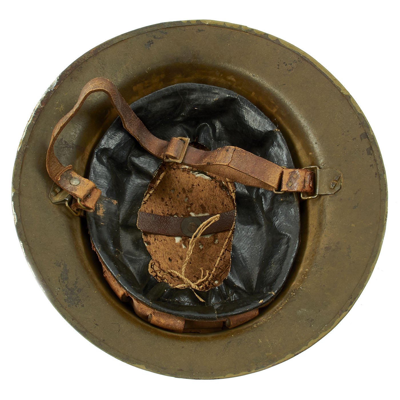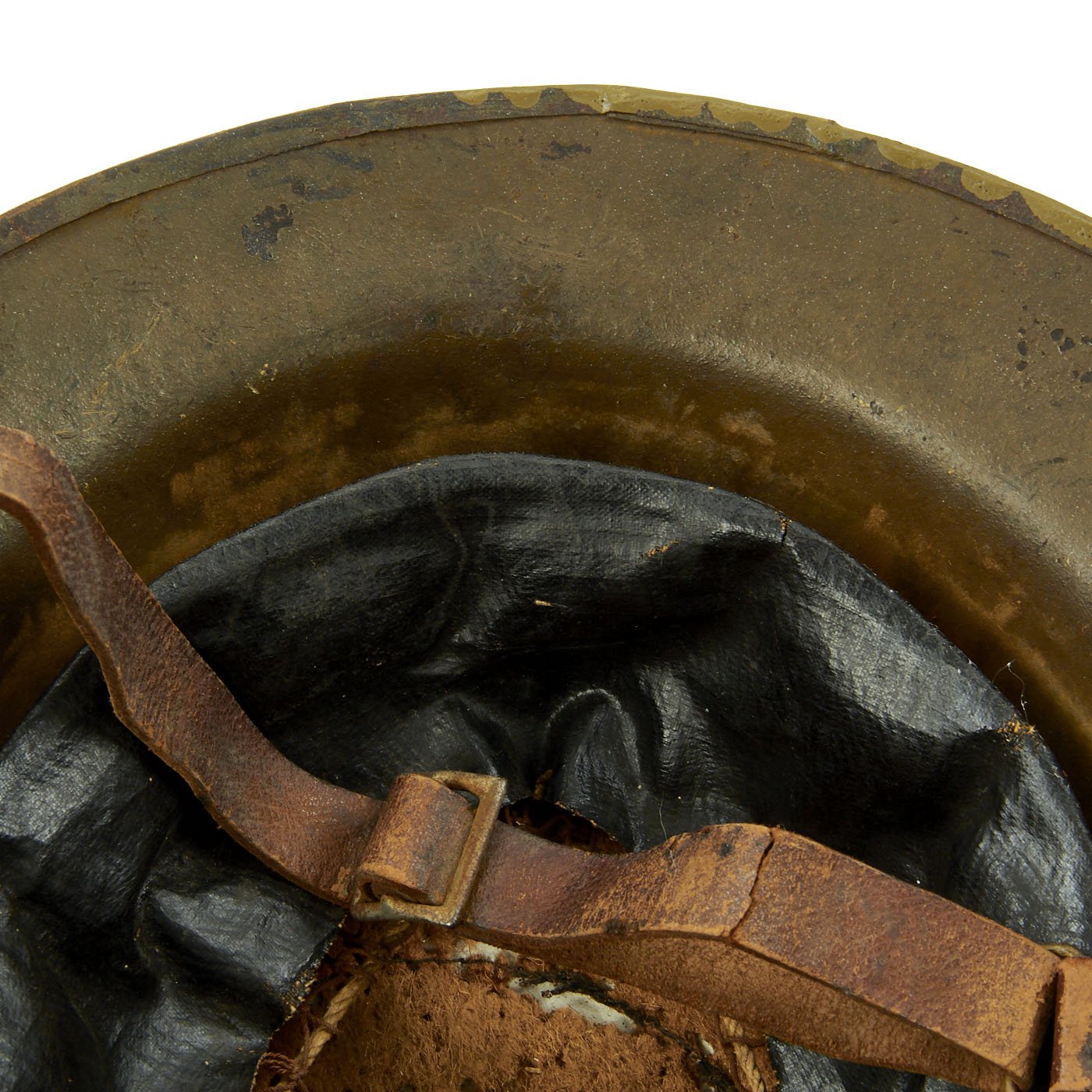 The paint is very nice and vibrant, with great color retention, and a nice patina of age. It was applied over the original textured camouflage paint, and much of the original texture is still easily seen. There are some scratches and oxidation, as expected of a helmet that went through war over 100 years ago, but it still presents very nicely! The liner is present, and is in very good condition, with great looking oil cloth and netting. The original felt top pad unfortunately has suffered moth damage, as shown. The original chin strap is also still present, though it is in delicate condition, with some tearing.