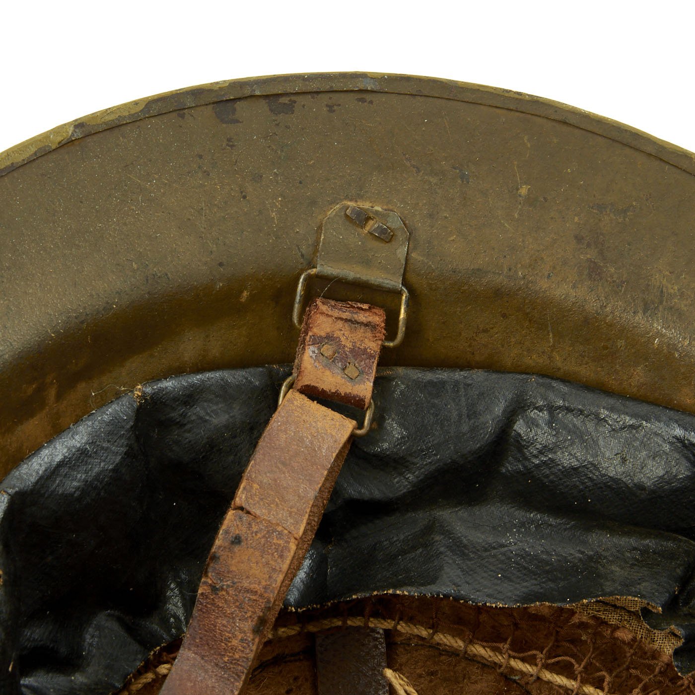 The underside of the rim is stamped F S 2, indicating that the shell is one of the 400,000 British manufactured helmets supplied to the U.S. at their entrance into the war. The split pin rivets attaching the chin-strap bales further confirm this. F S is one of the standard markings used by T. Firth & Sons Ltd of Sheffield.