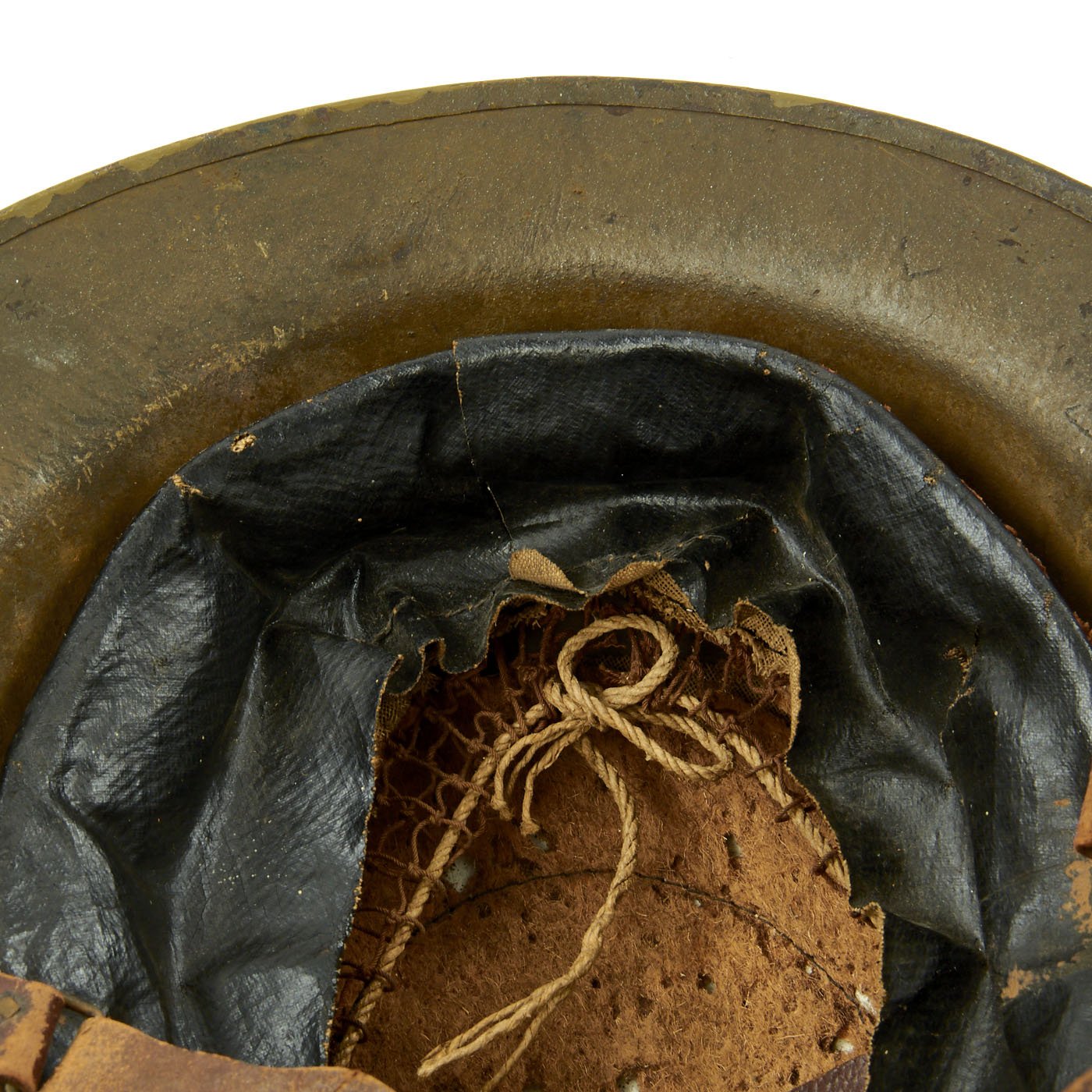 M1917 helmet liners typically show a paper label at the crown and the dome rivet head. The liner is set up as on the British versions, with an oilcloth band and net configuration, attached to a leather strap, riveted to the shell. The chinstrap is leather with steel buckle.