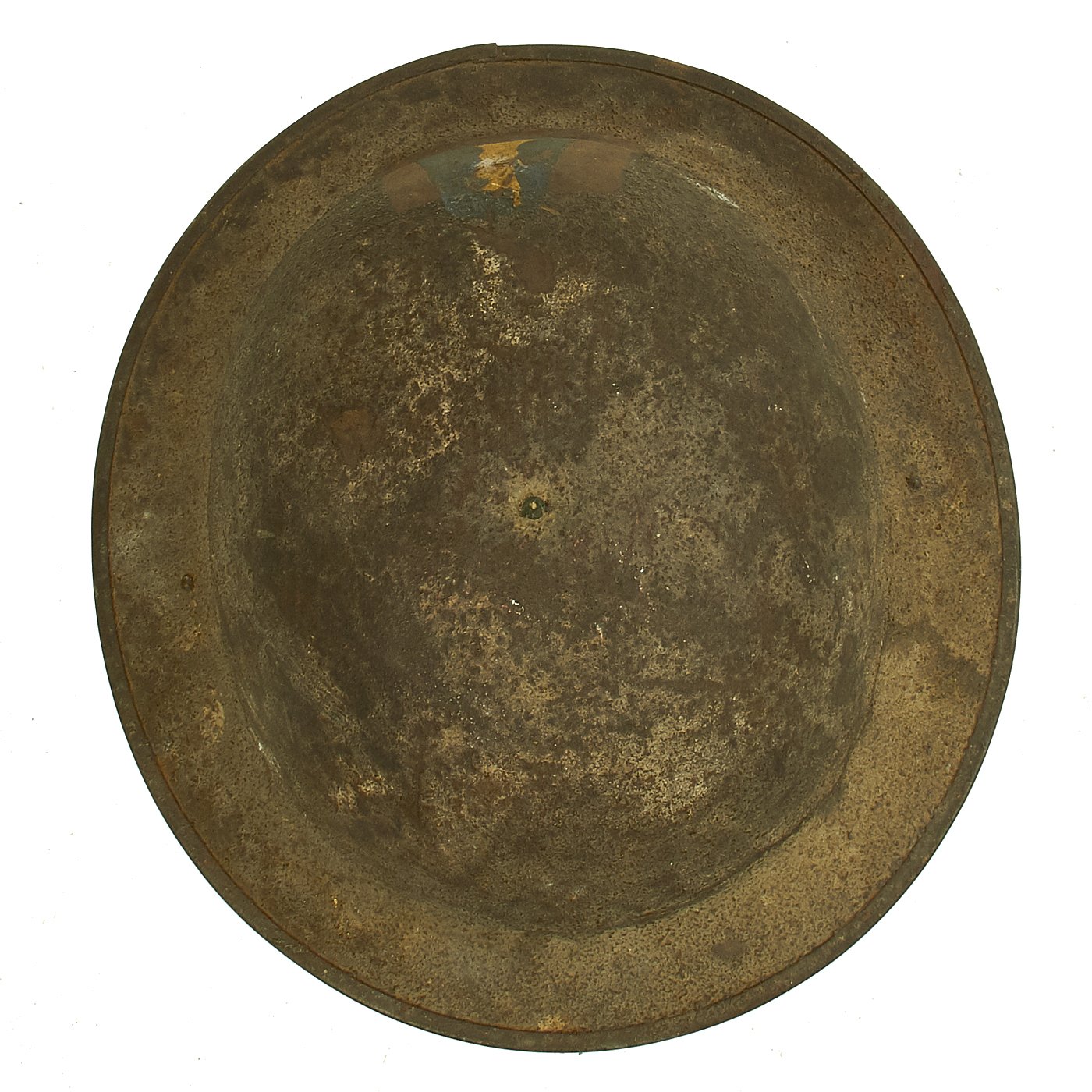 • Original Item: Only One Available. This is a very nice example of a U.S. M1917 "Doughboy" helmet with original liner, and compete chinstrap. It also features a great original period textured OD Green paint on the top side, and is marked on the front to the 77th Infantry Division - Statue of Liberty.