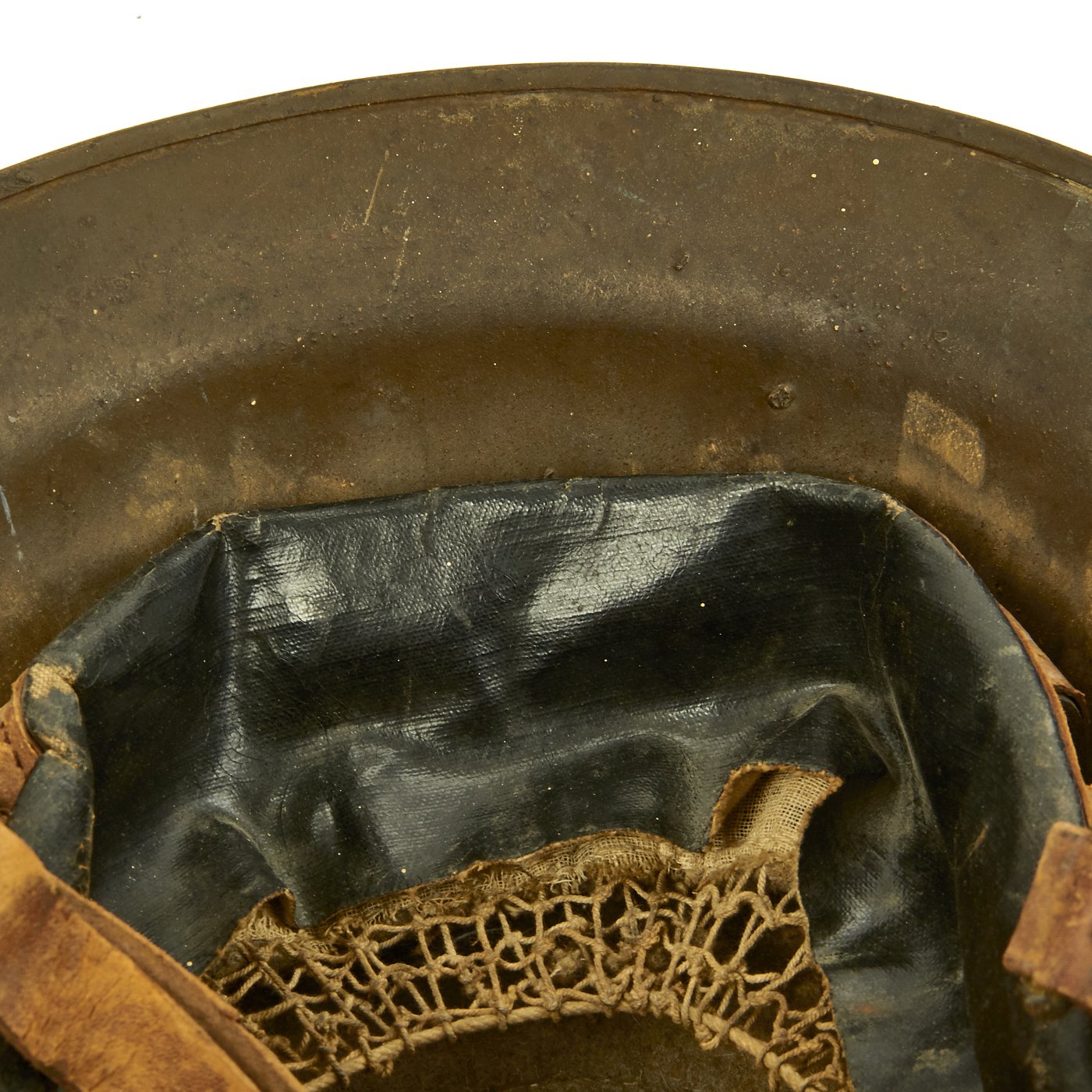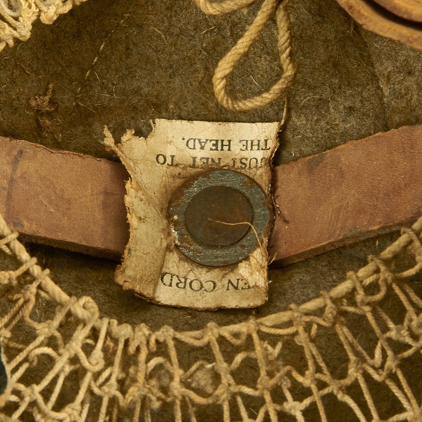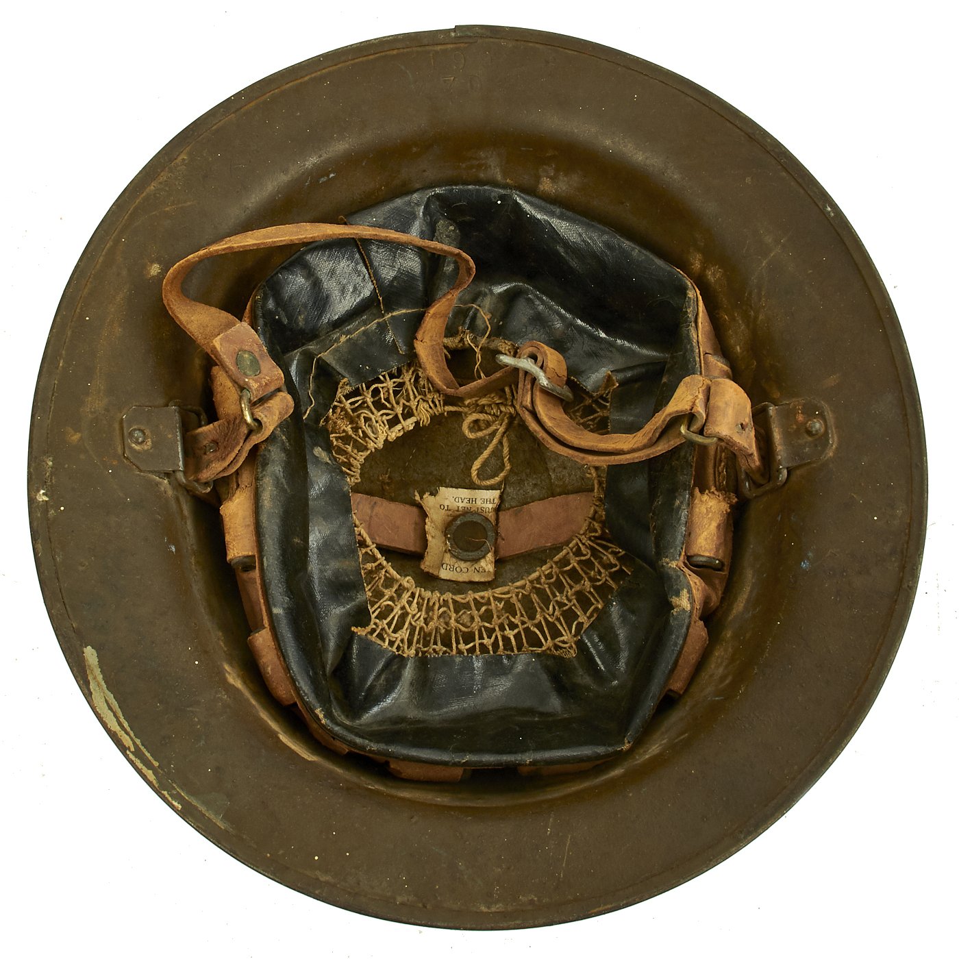 M1917 helmet liners typically show a paper label at the crown and the dome rivet head. The liner is set up as on the British versions, with an oilcloth band and net configuration, attached to a leather strap, riveted to the shell. The chinstrap is leather with steel buckle.