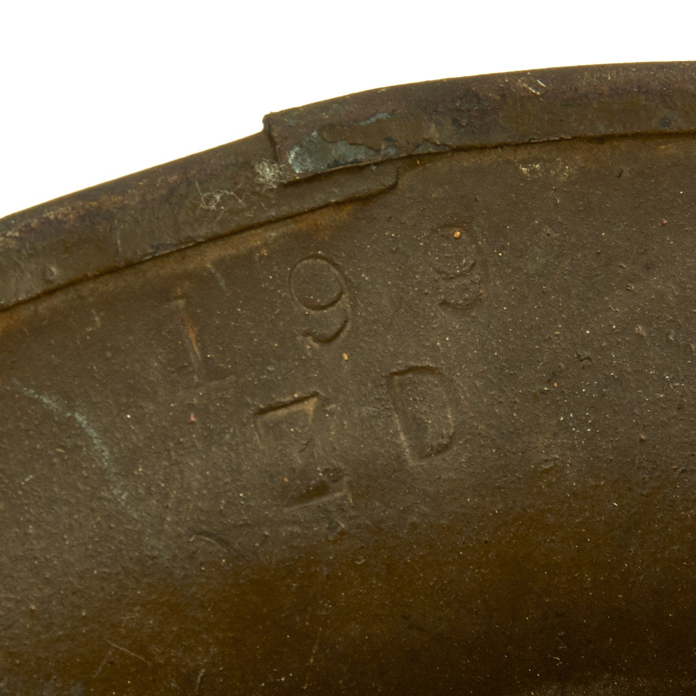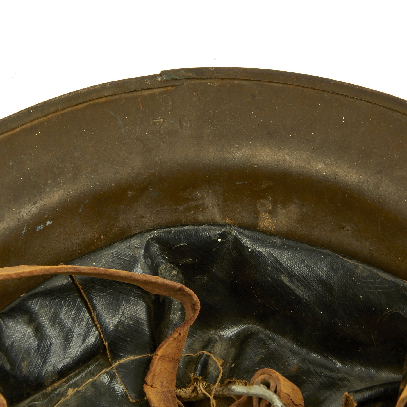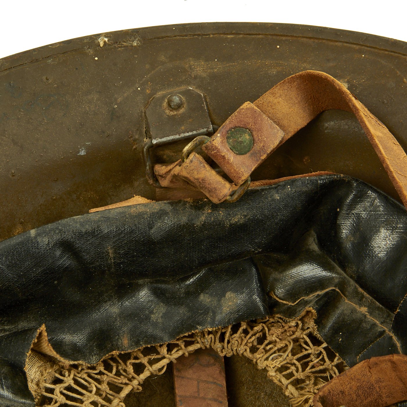 The shell is maker marked with a stamping on the underside of the rim that reads 199 / ZD. The solid rivets and heat lot number indicate that this helmet shell was produced in the United States. The paint is in very good condition both inside and outside the helmet. The liner is also in quite nice shape, with a very good oil cloth liner, and intact felt top pad. It is marked size 7 3/8 on the support strap in the middle, and still has most of the original top label. The chin strap is intact and functional, with no tears that we can see, though there definitely are some worn spots.