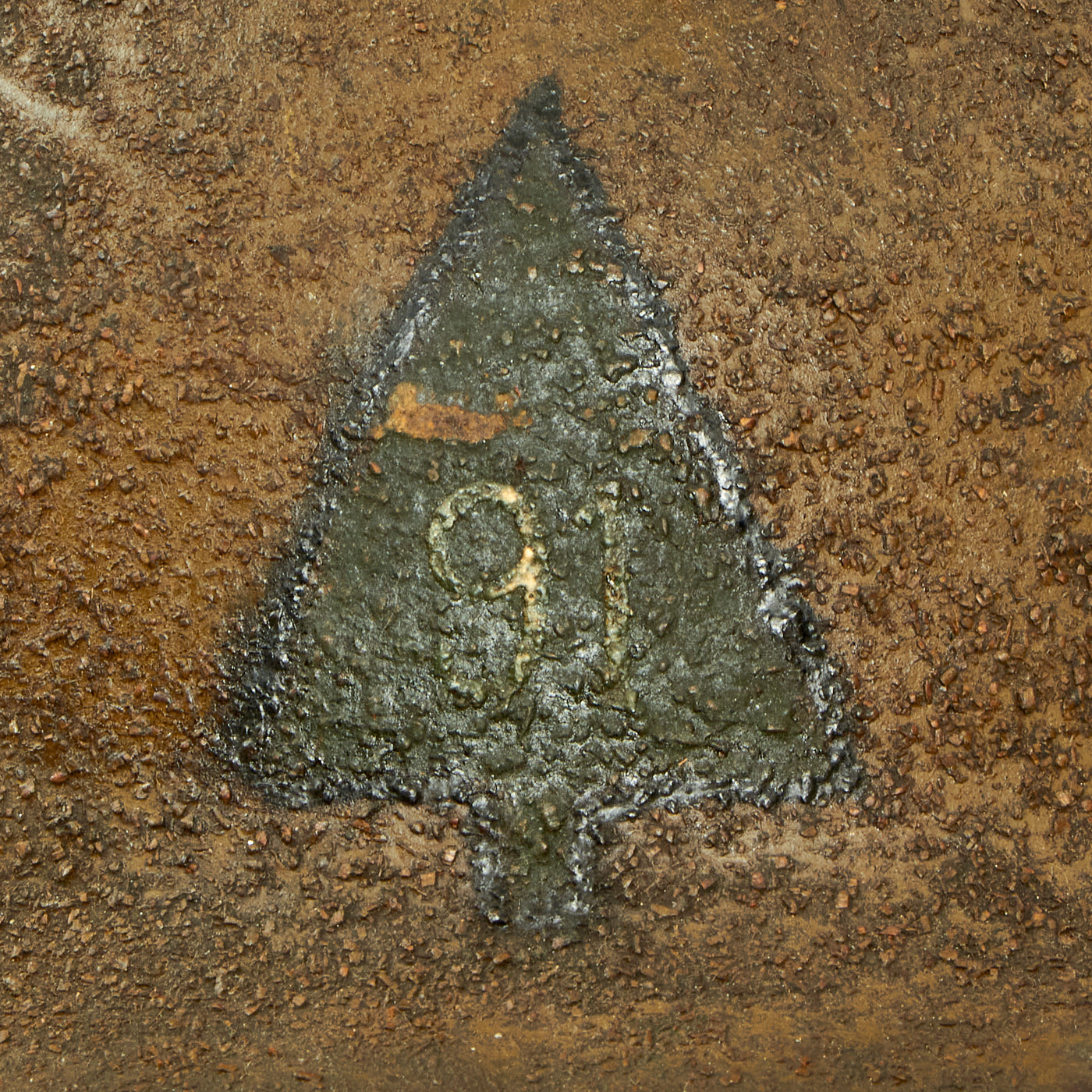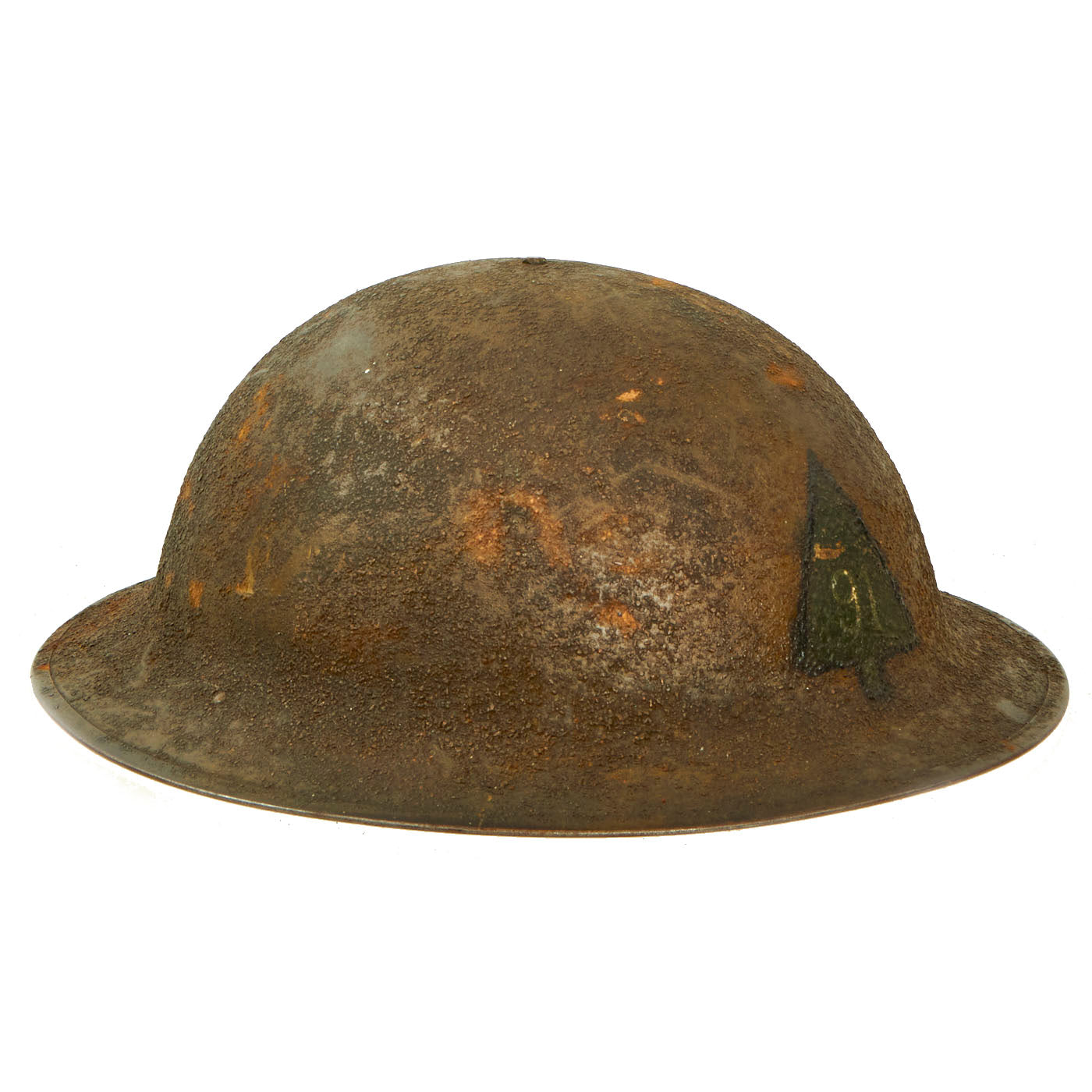 The best feature of this helmet is definitely the original hand painted 91st Infantry Division - The Wild West Division emblem in the center of the shield. The Division Insignia maintains most of the original paint and is somewhat hard to see due to dirt and wear. It is the standard "Fir Tree" with a white "91" in the middle.