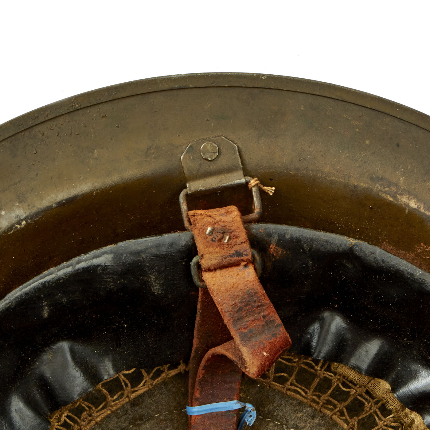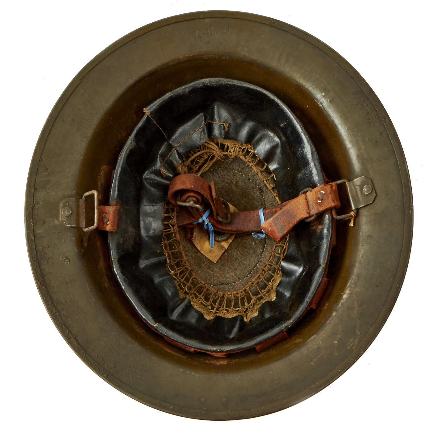 M1917 helmet liners typically show a paper label at the crown and the dome rivet head. The liner is set up as on the British versions, with an oilcloth band and net configuration, attached to a leather strap, riveted to the shell. The chinstrap is leather with steel buckle.