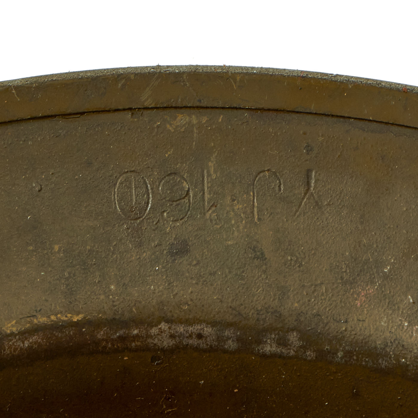 Original Item: Only One Available. This is an excellent example of a U.S. M1917 "Doughboy" helmet, which features original period textured OD Green paint and a painted Unit Insignia. The shell is maker marked with a stamping on the underside of the rim that reads YJ 160. The solid rivets and heat lot number indicate that this helmet shell was produced in the United States. The paint is in very good condition both inside and outside the helmet.