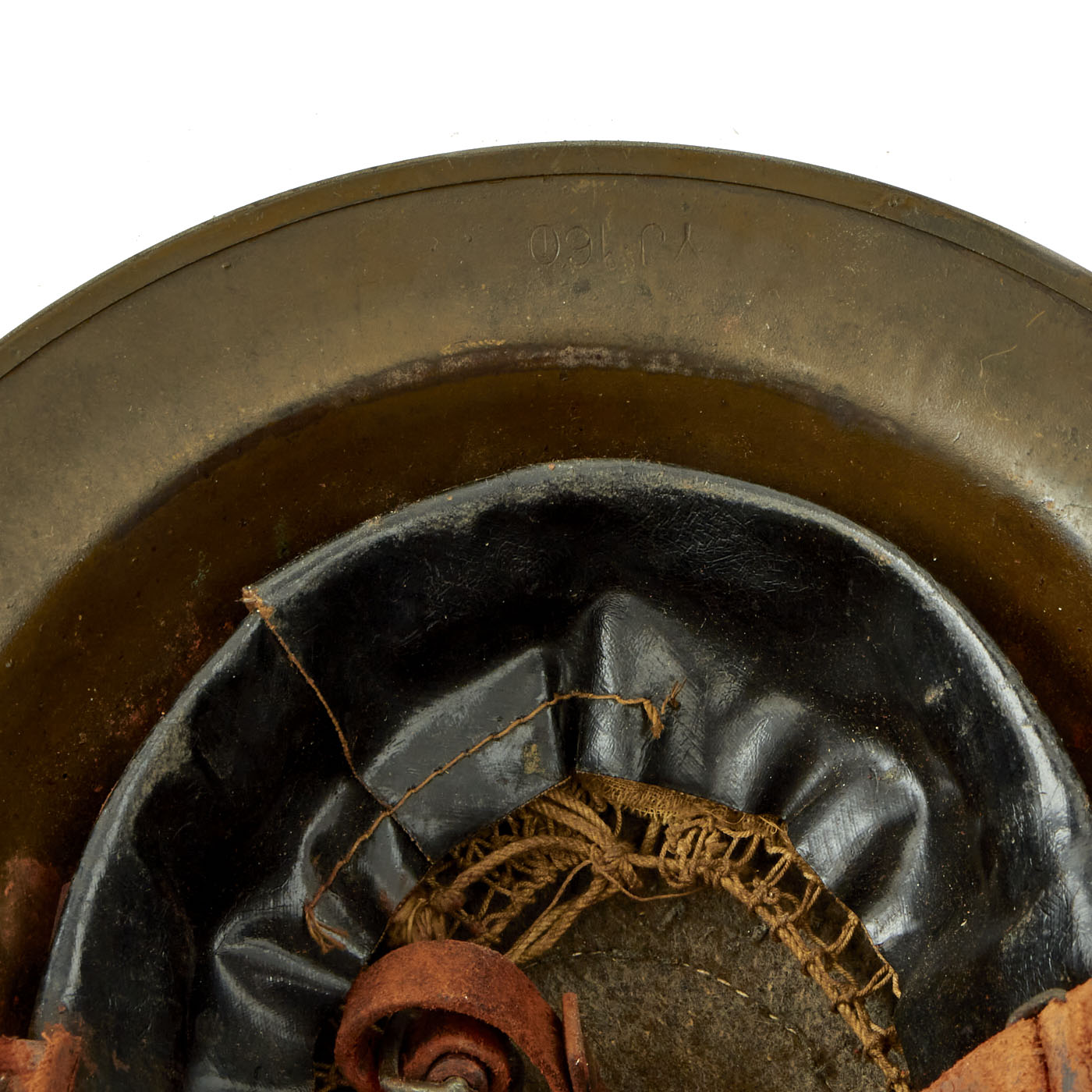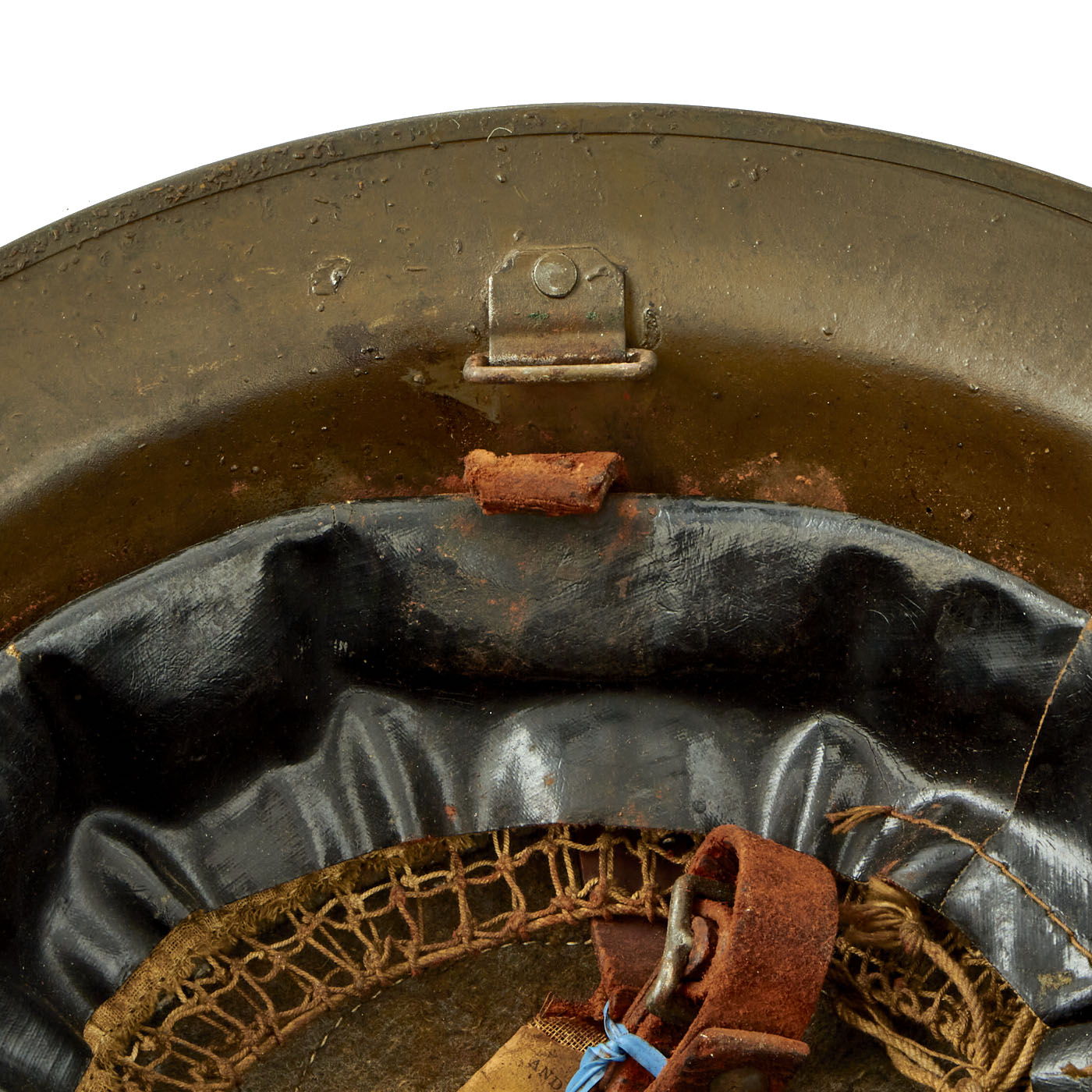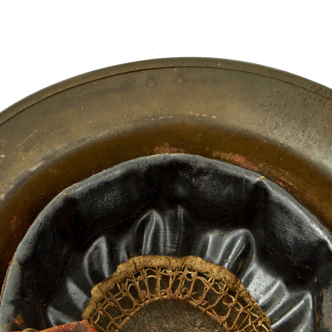 The liner is present, though it has suffered somewhat to age. The felt top pad is somewhat worn due to age and use, however the original tag is still present. The oil cloth is in similar condition, and the underlying netting is a bit deteriorated. The chin strap is present, though it is broken in multiple places and now has twist ties holding sections together. Overall it is in delicate condition.