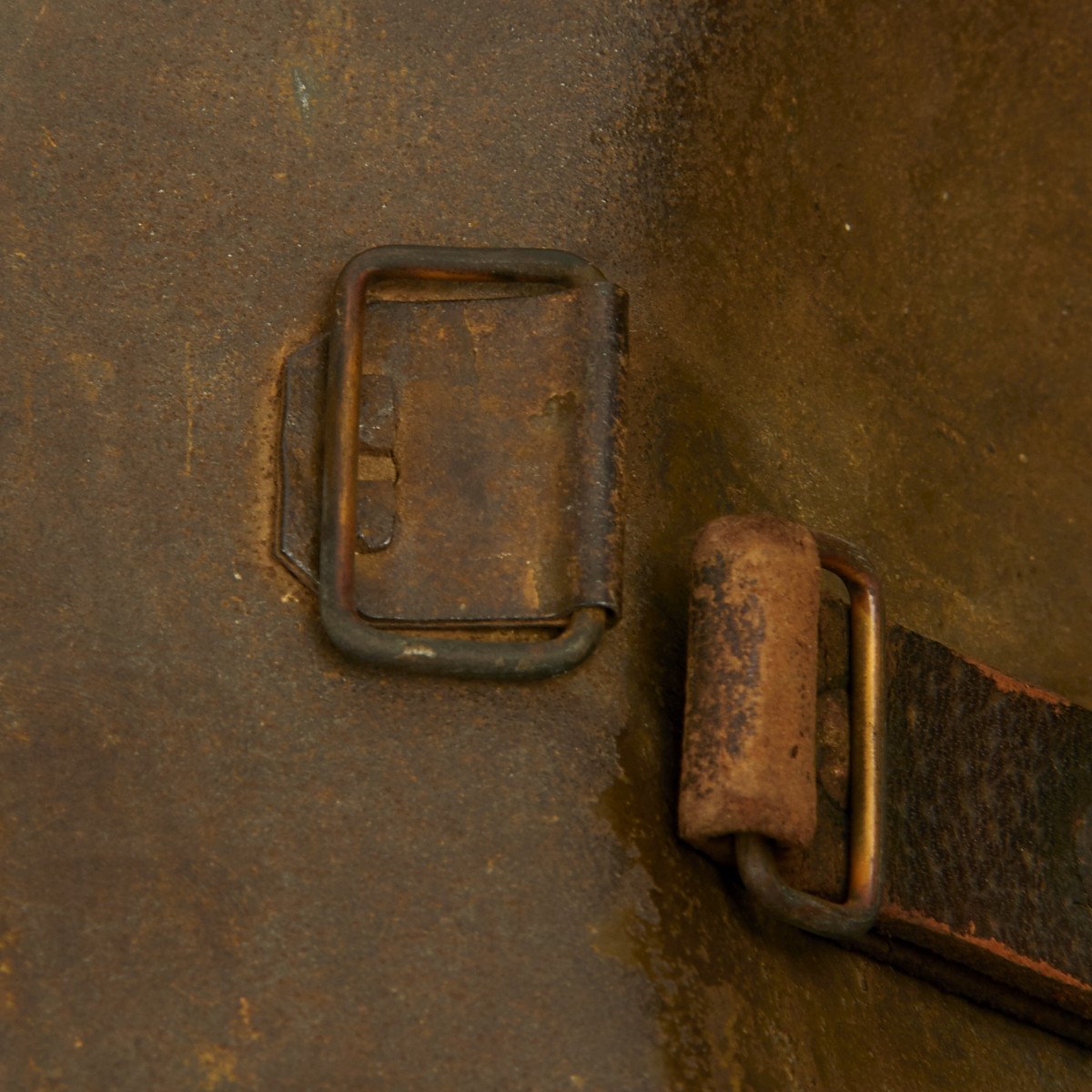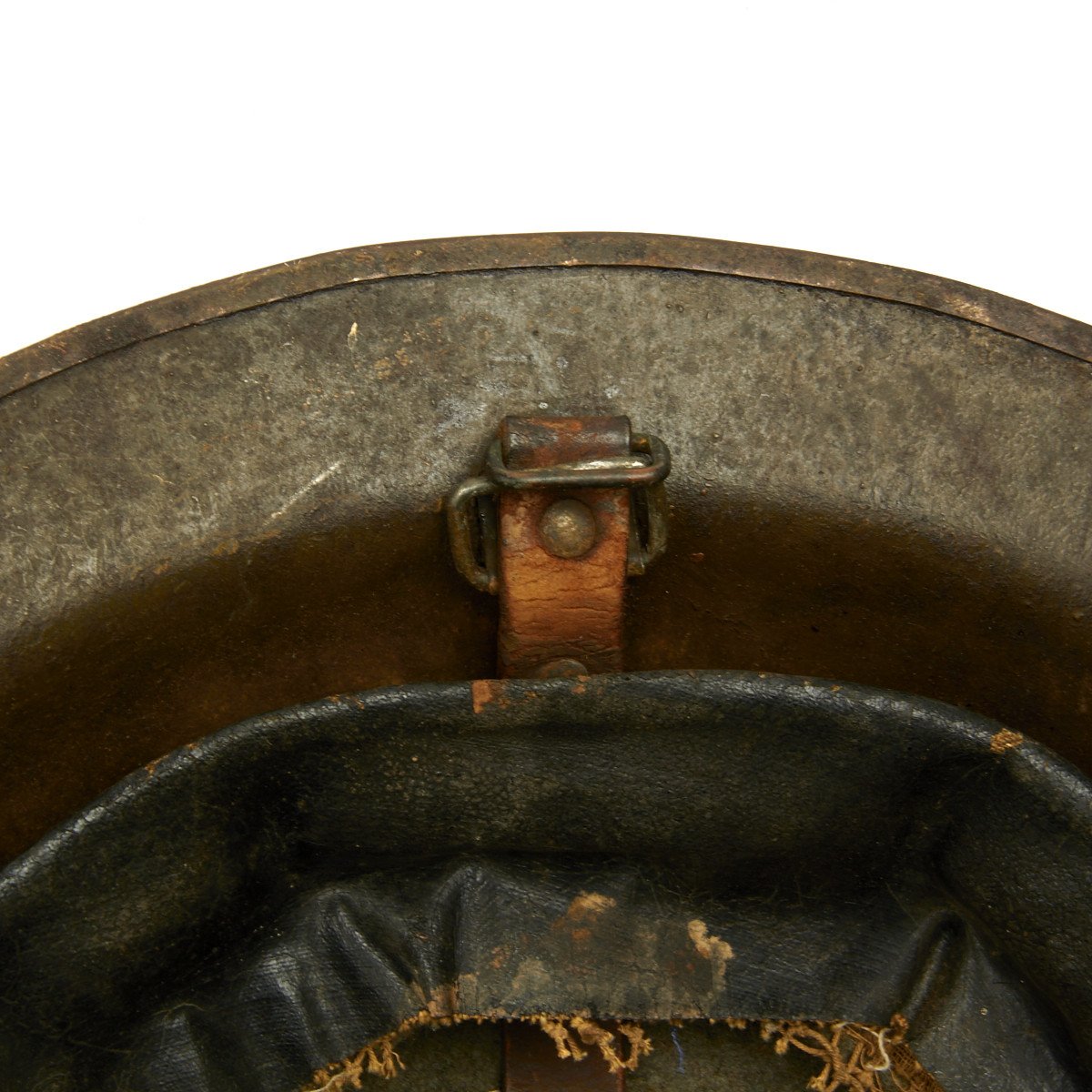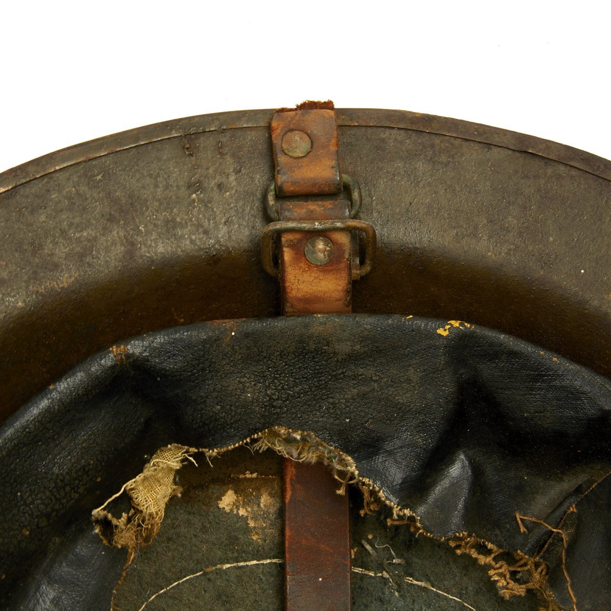M1917 helmet liners typically show a paper label at the crown and the dome rivet head. The liner is set up as on the British versions, with an oilcloth band and net configuration, attached to a leather strap, riveted to the shell. The chinstrap is leather with steel buckle.