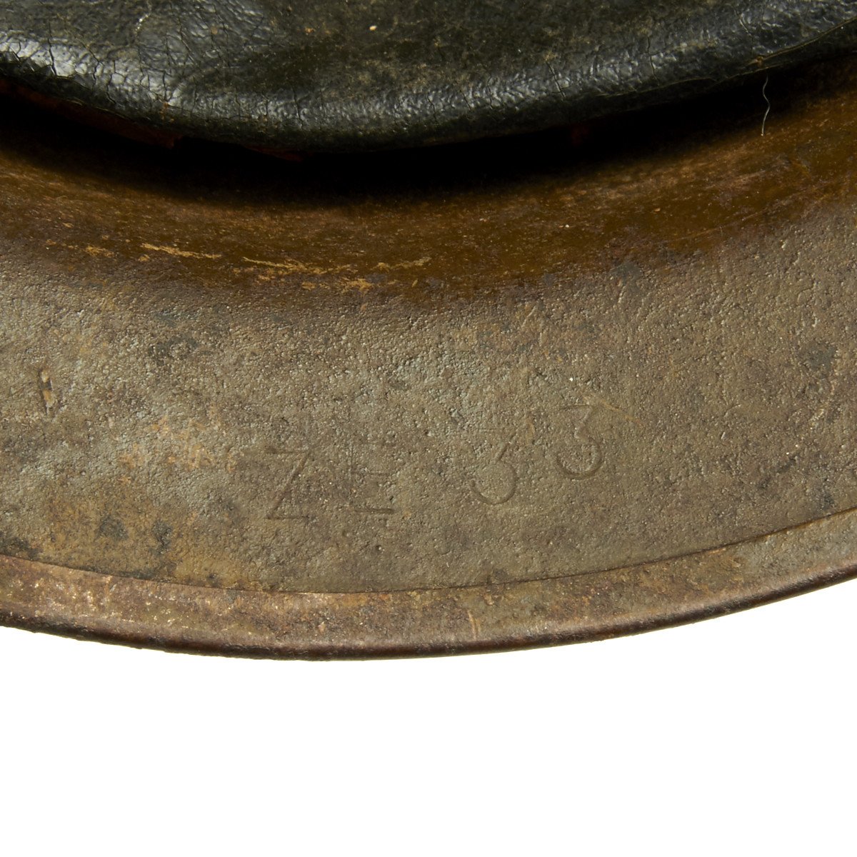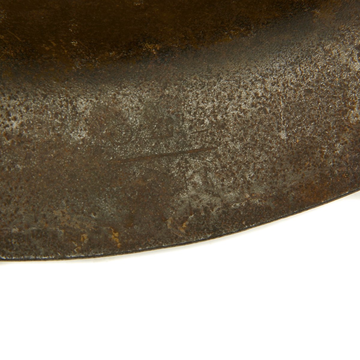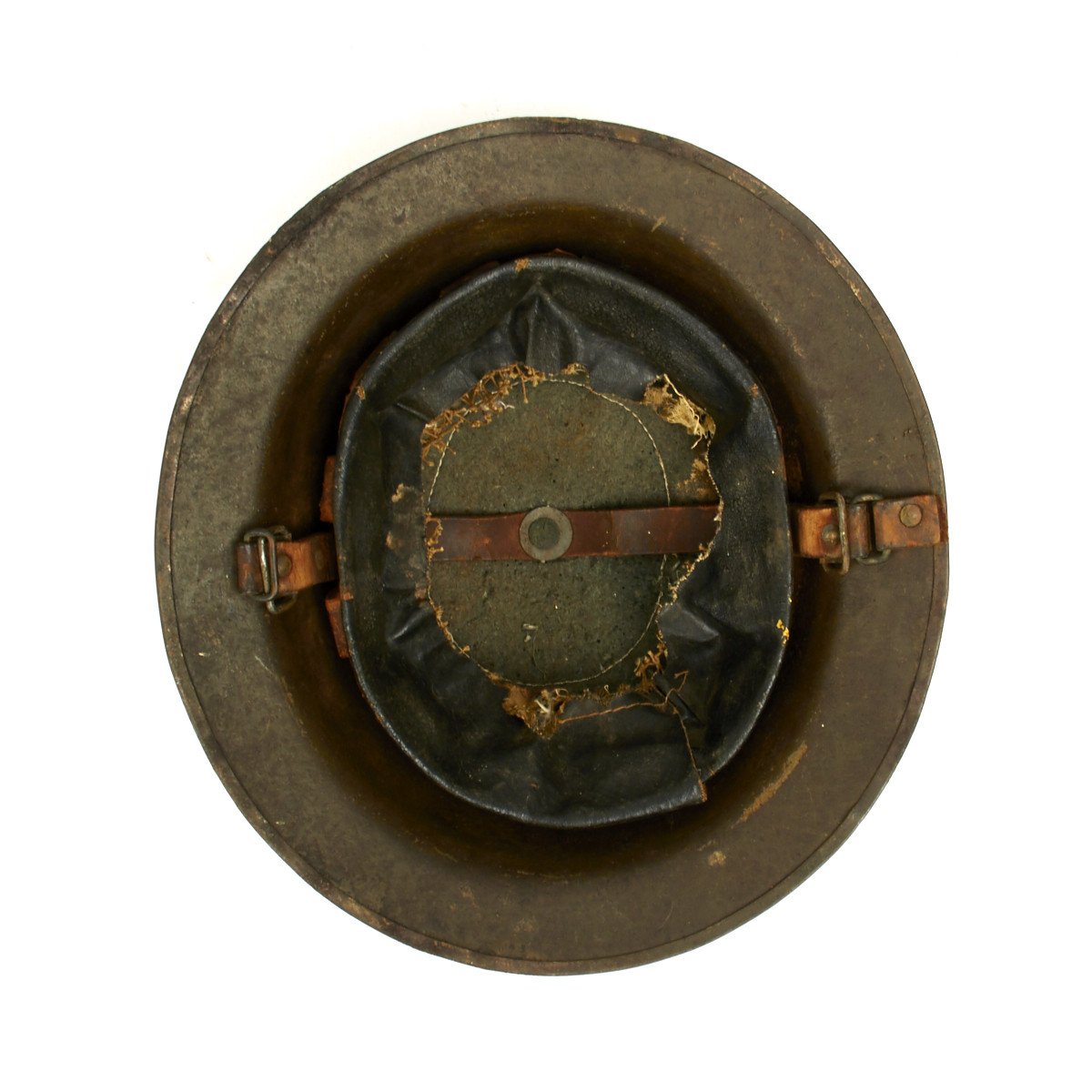 M1917 helmet liners typically show a paper label at the crown and the dome rivet head. The liner is set up as on the British versions, with an oilcloth band and net configuration, attached to a leather strap, riveted to the shell. The chinstrap is leather with steel buckle.
