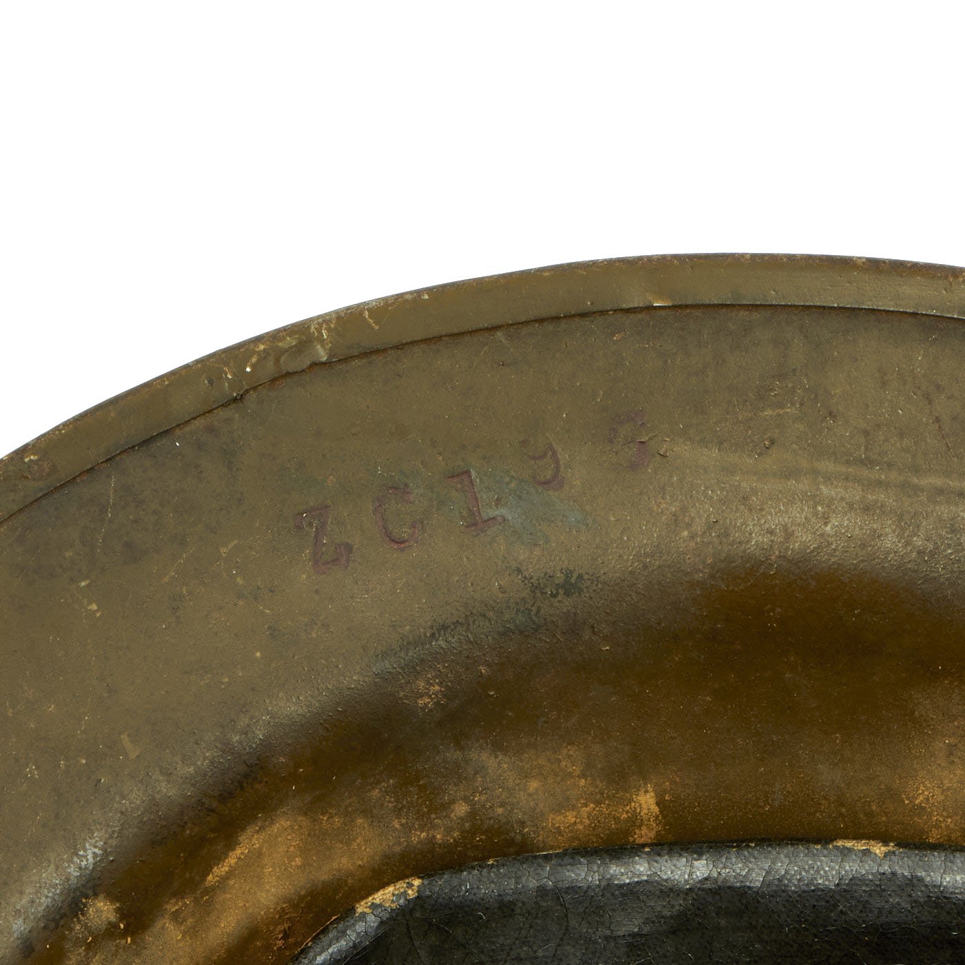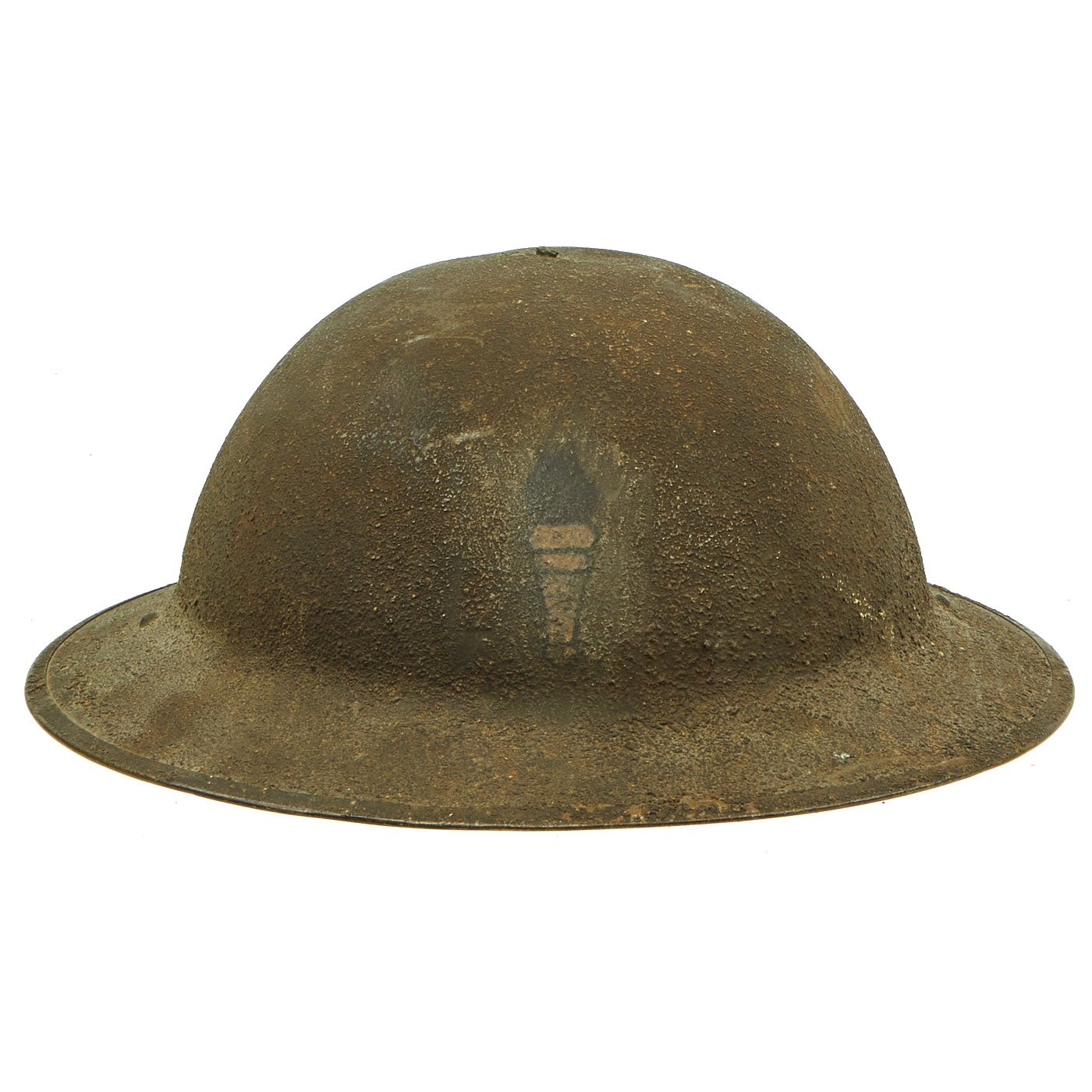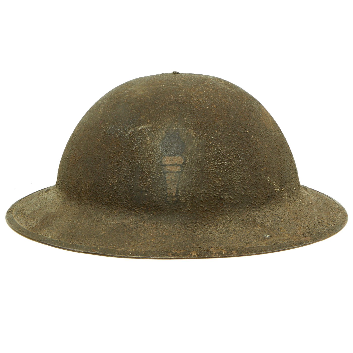 • Original Item: Only One Available. This fine extremely RARE example with complete liner and chinstrap with wonderful original period textured green/brown paint. The shell is maker marked with a stamping on the underside of the rim that reads ZC193. Also on the inside rim is a hand painted YD Yankee Divison insignia with  initials. This is an wonderful example of a genuine USGI Great War helmet from an well known infantry regiment of the US army. The best feature of all is the original hand painted 104th Infantry Regiment is the flaming torch Insignia. This helmet has no dings or dents and maintains approximately 95% of its original finish and texture. The flaming torch insignia maintains approximately 99% of its original paint and remains bold visible and easy to see.