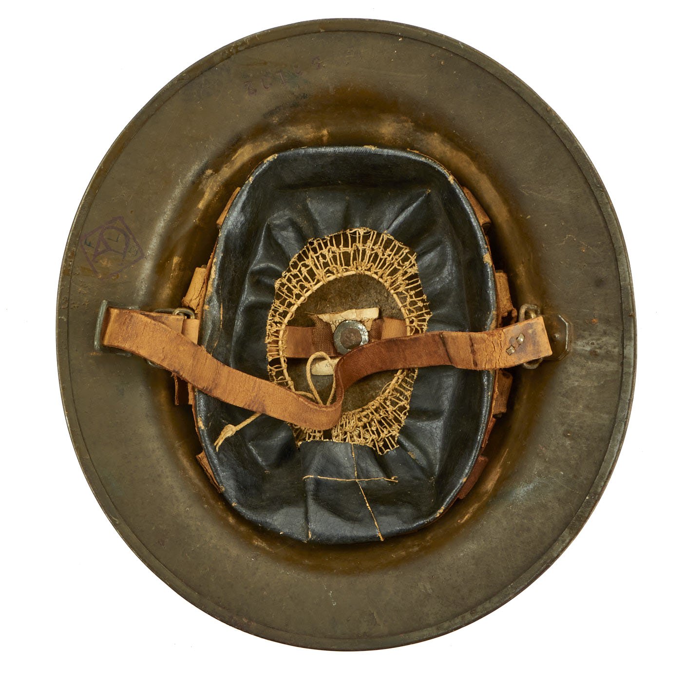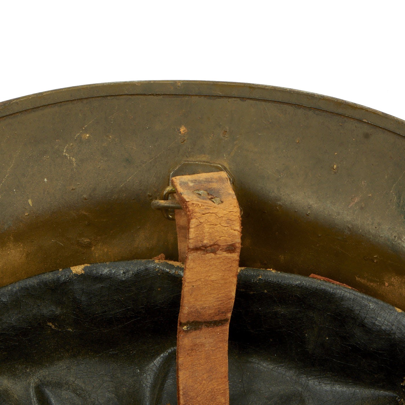M1917 helmet liners typically show a paper label at the crown and the dome rivet head. The liner is set up as on the British versions, with an oilcloth band and net configuration, attached to a leather strap, riveted to the shell. The chinstrap is leather with steel buckle.