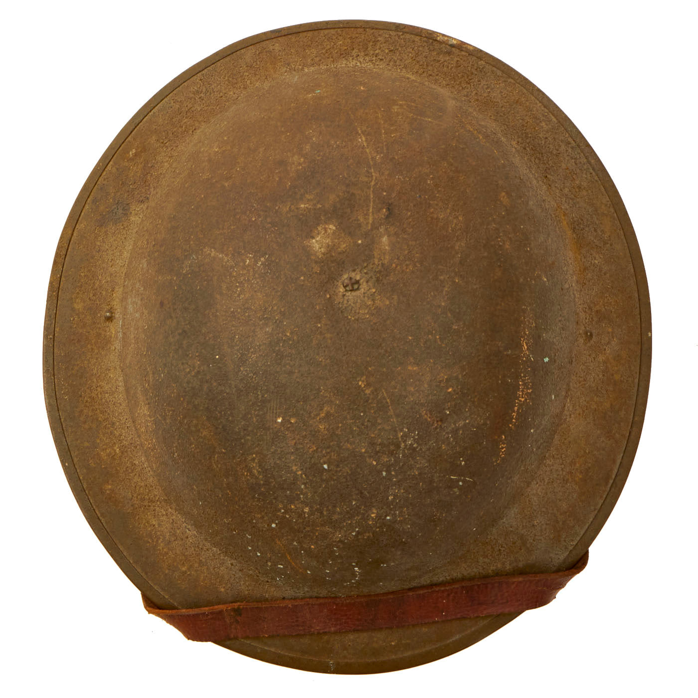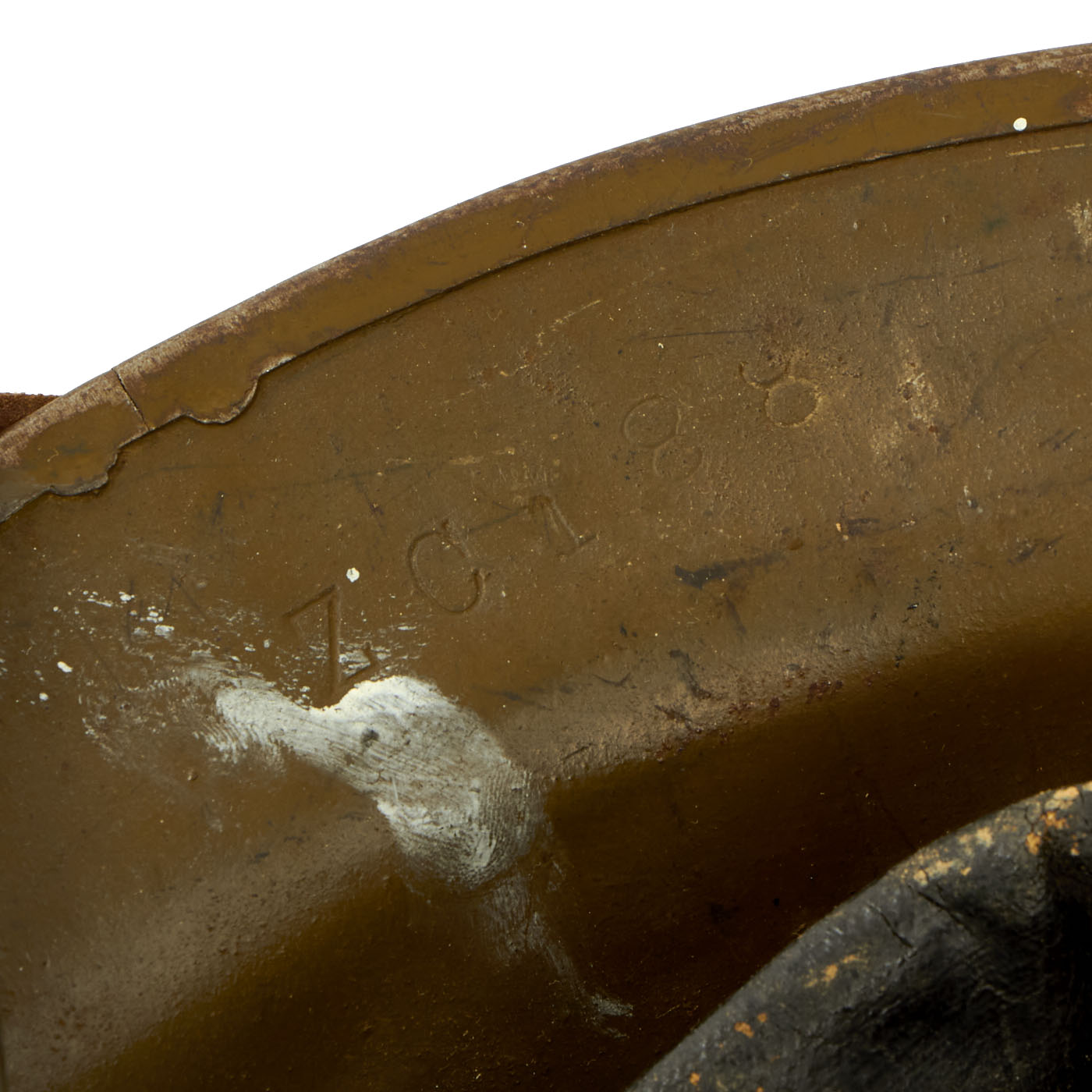 This shell is stamped ZC 188 indicating it was produced in the United States, and can be seen on the underside of the skirt towards the front. The solid rivets on the chin strap bales is another method of identifying the helmet as being American made. The liner and chinstrap is complete and in great condition with minor wear present. The liner still retains the original top felt pad as well as the paper label.