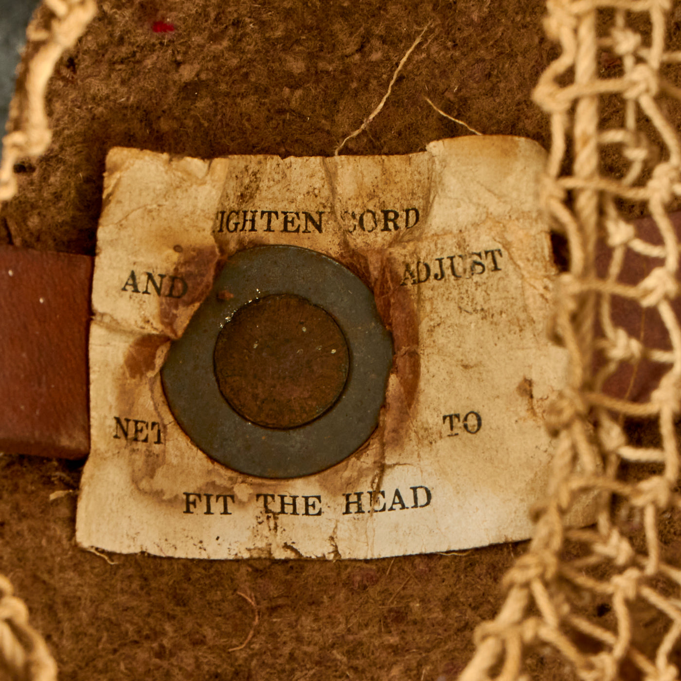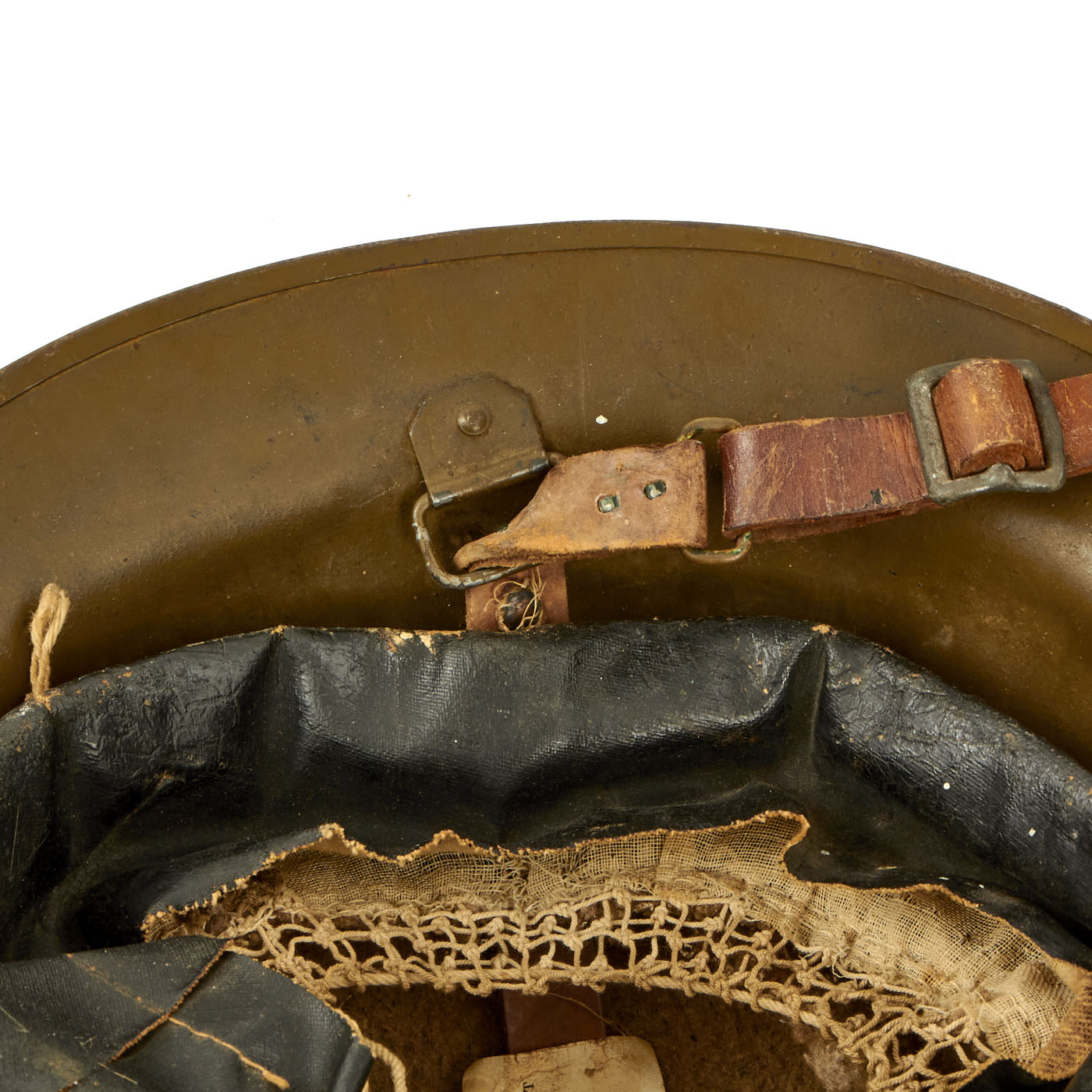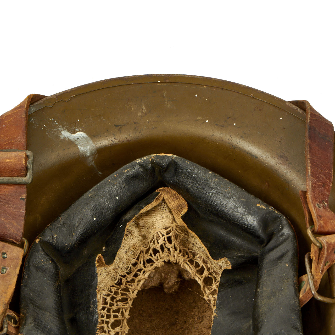 M1917 helmet liners typically show a paper label at the crown and the dome rivet head. The liner is set up as on the British versions, with an oilcloth band and net configuration, attached to a leather strap, riveted to the shell. The chinstrap is made of genuine leather and is complimented by a steel buckle.