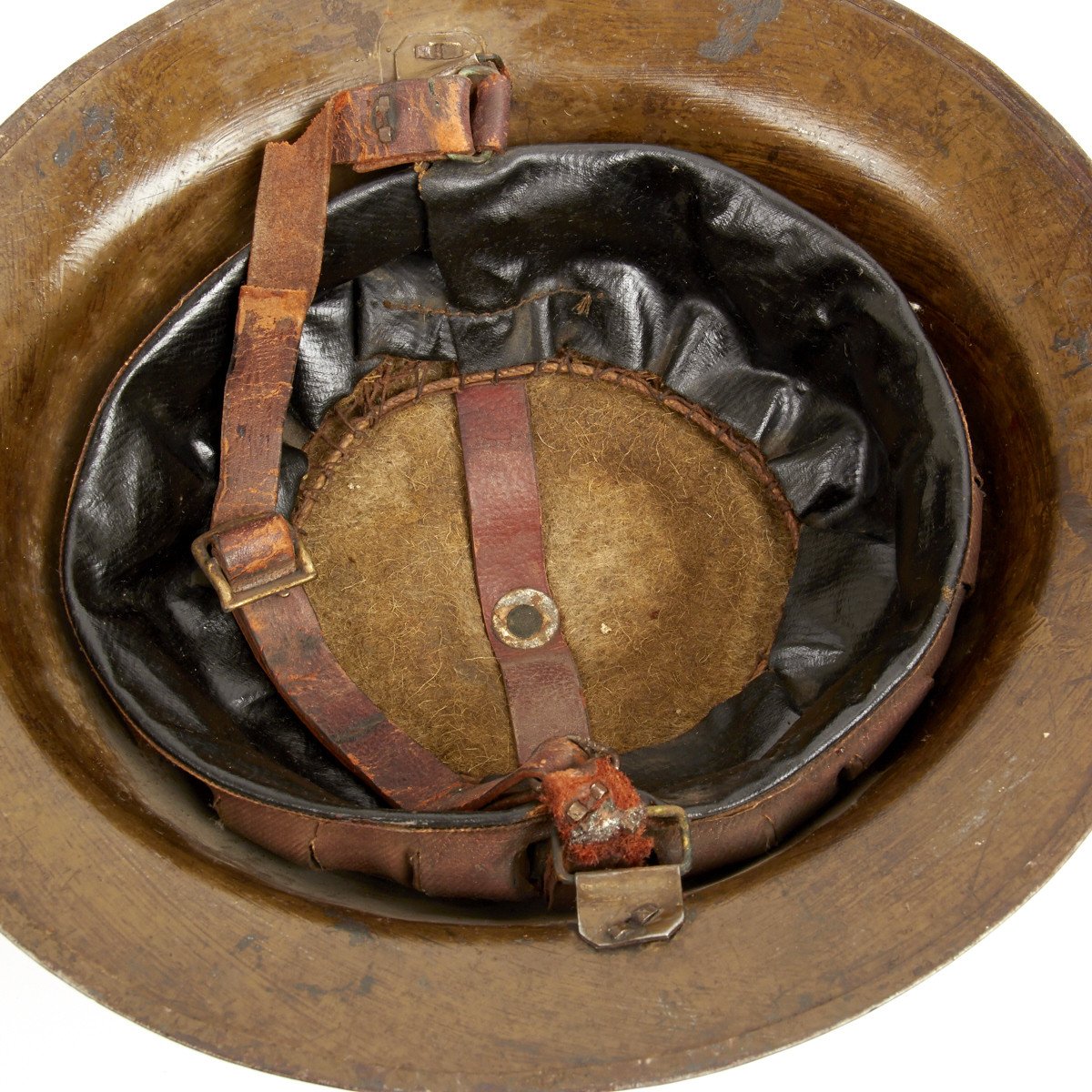 M1917 helmet liners typically show a paper label at the crown and the dome rivet head. The liner is set up as on the British versions, with an oilcloth band and net configuration, attached to a leather strap, riveted to the shell. The chinstrap is leather with steel buckle.