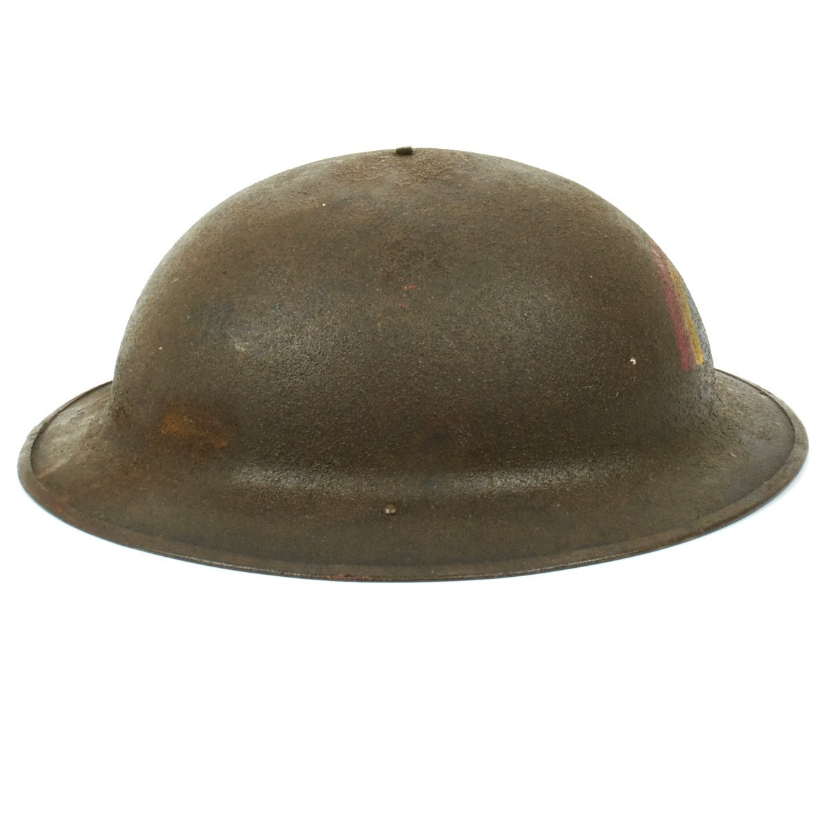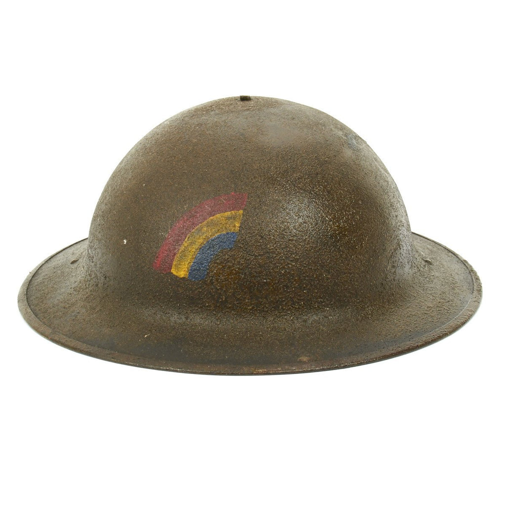 Original Item: Only One Available. This nice example that has original period textured paint green brown. The shell is maker marked with a stamping on the underside of the rim that reads ZD. This is an wonderful example of a genuine USGI Great War helmet from an well known infantry division of the US army. The best feature of all is the original hand painted RAINBOW for the 42nd infantry division.