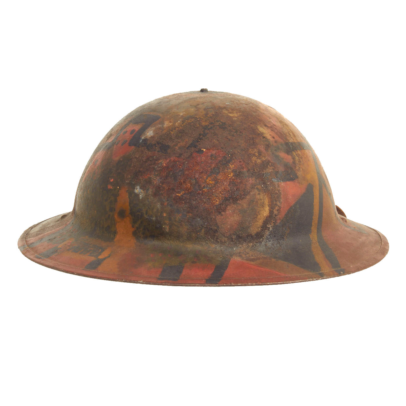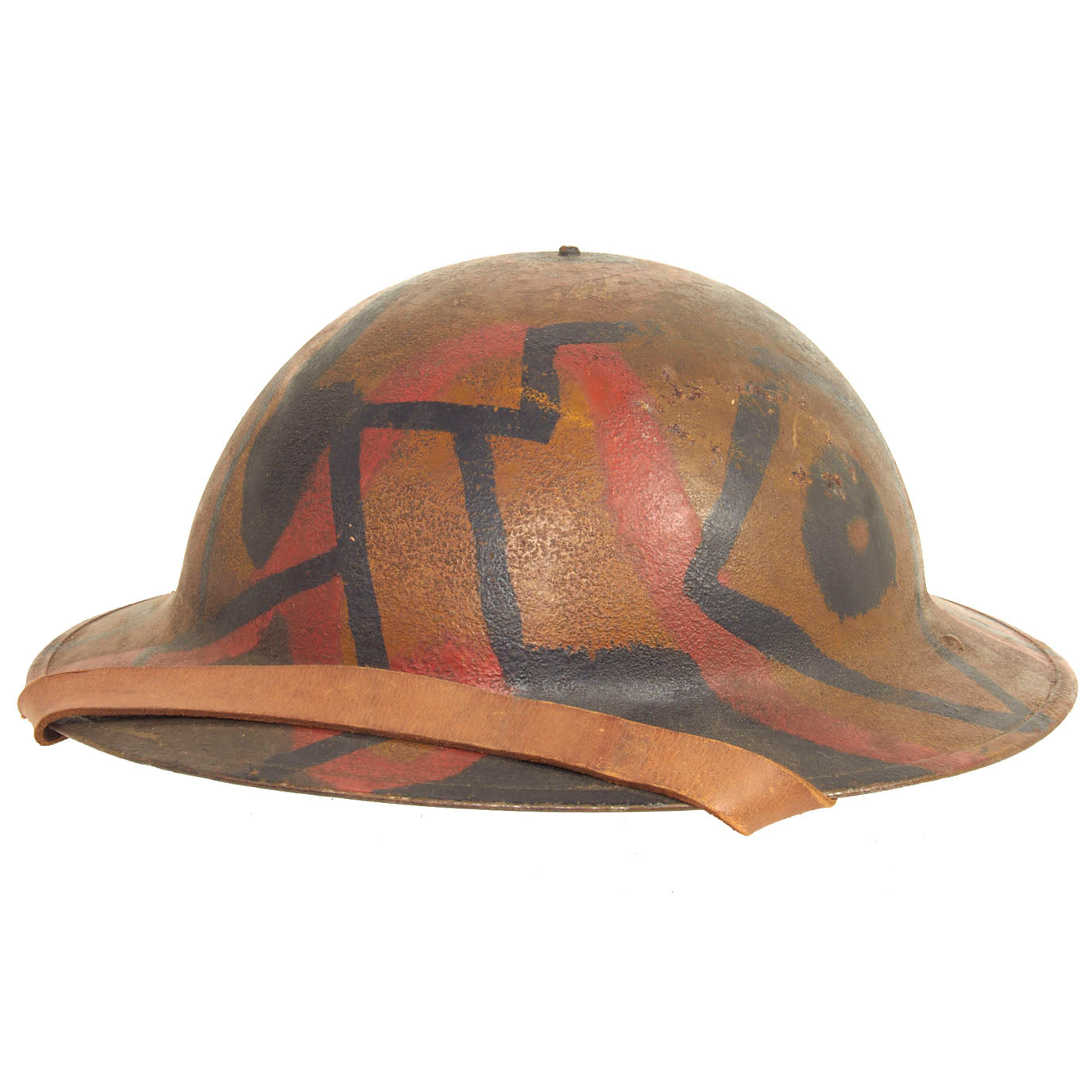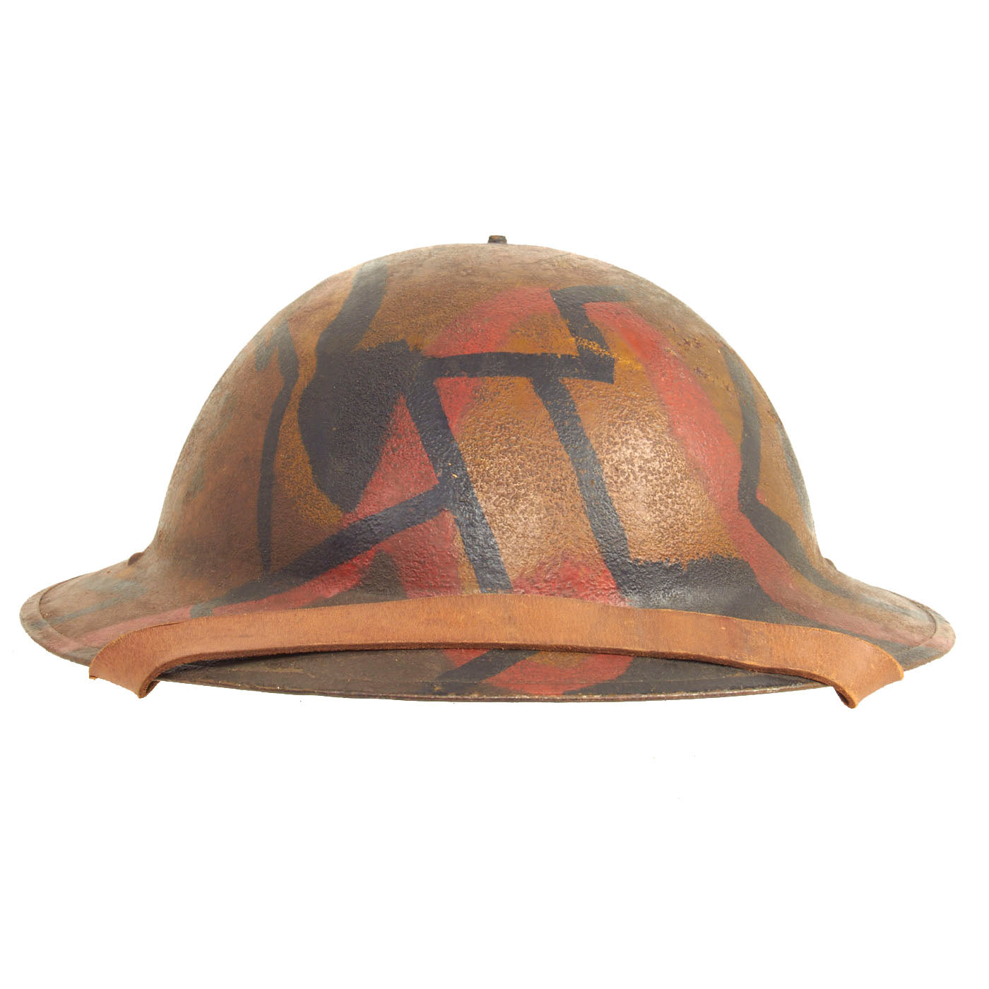 Original Item: One-Of-A-Kind. This is a fantastic genuine Great War hand painted camouflage helmet complete with its original liner and chinstrap. Helmet features original period colored panel camouflage paint in various shades of red, brown, orange and yellow.