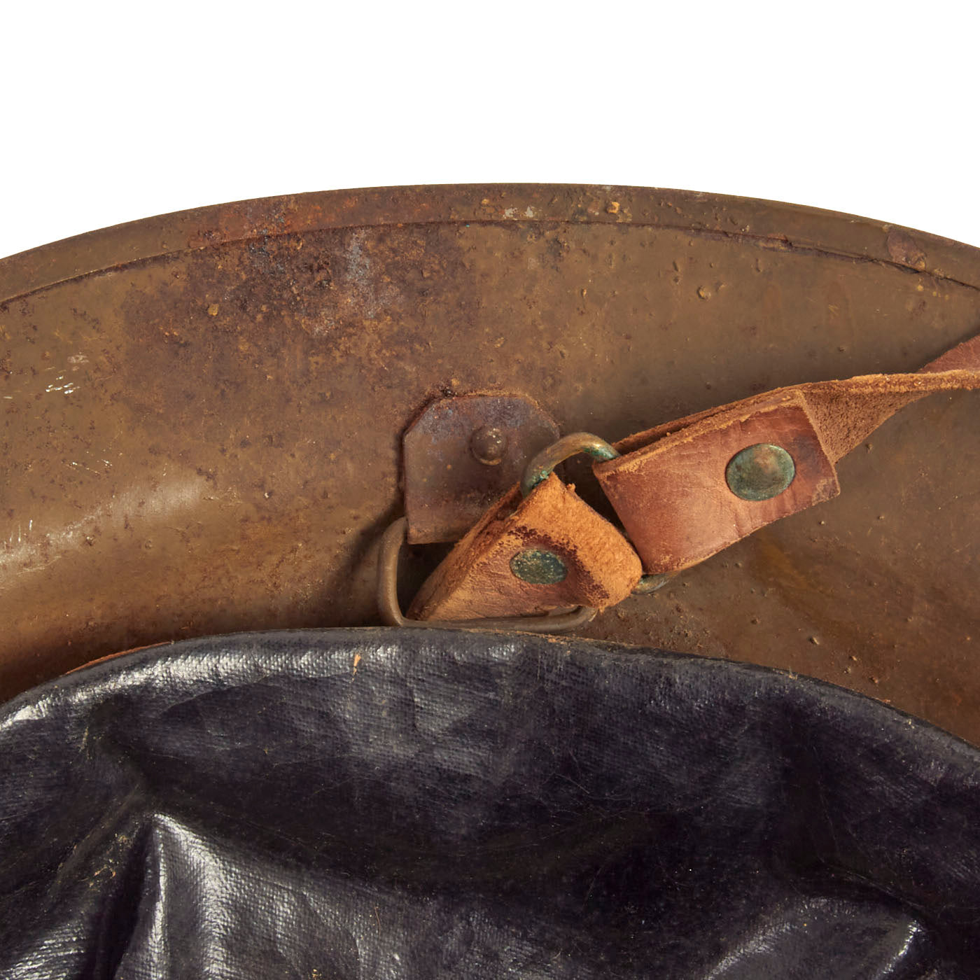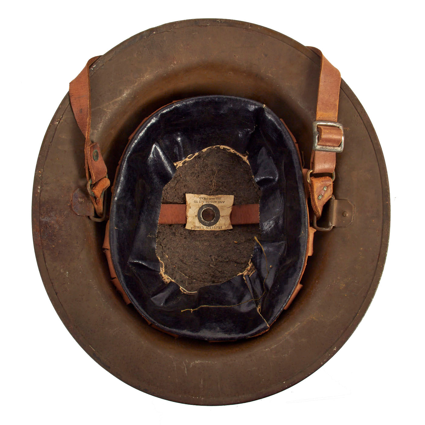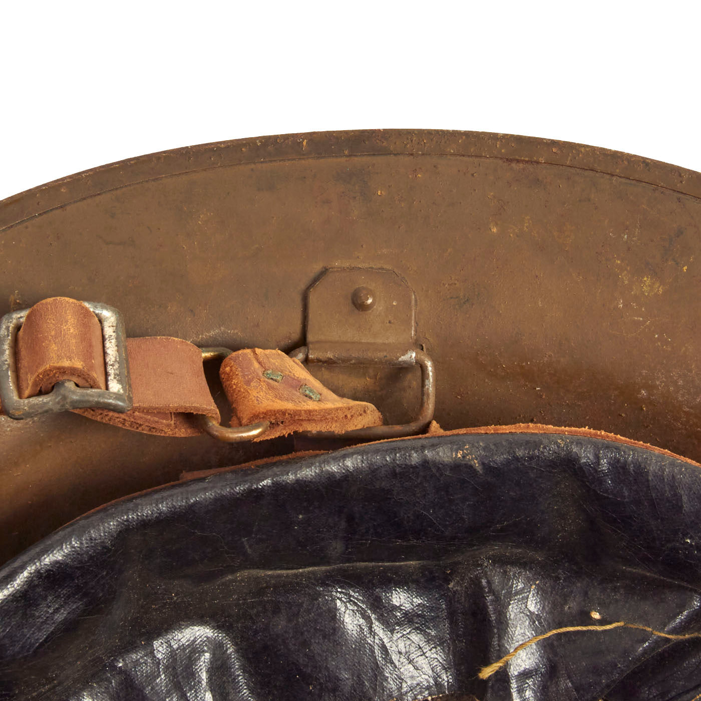 The paint is somewhat worn, and definitely shows use, but it has a great look and the colors are still easily discernible. The interior of the helmet has some of the original paint from when the soldier repainted the helmet. It also has a complete liner with felt top pad and paper label. The liner size stamp is not visible, but the size is approximately a 6 7/8. The liner does show minor age, and the leather is somewhat degraded, but the oil cloth is quite solid, as is the underlying netting.