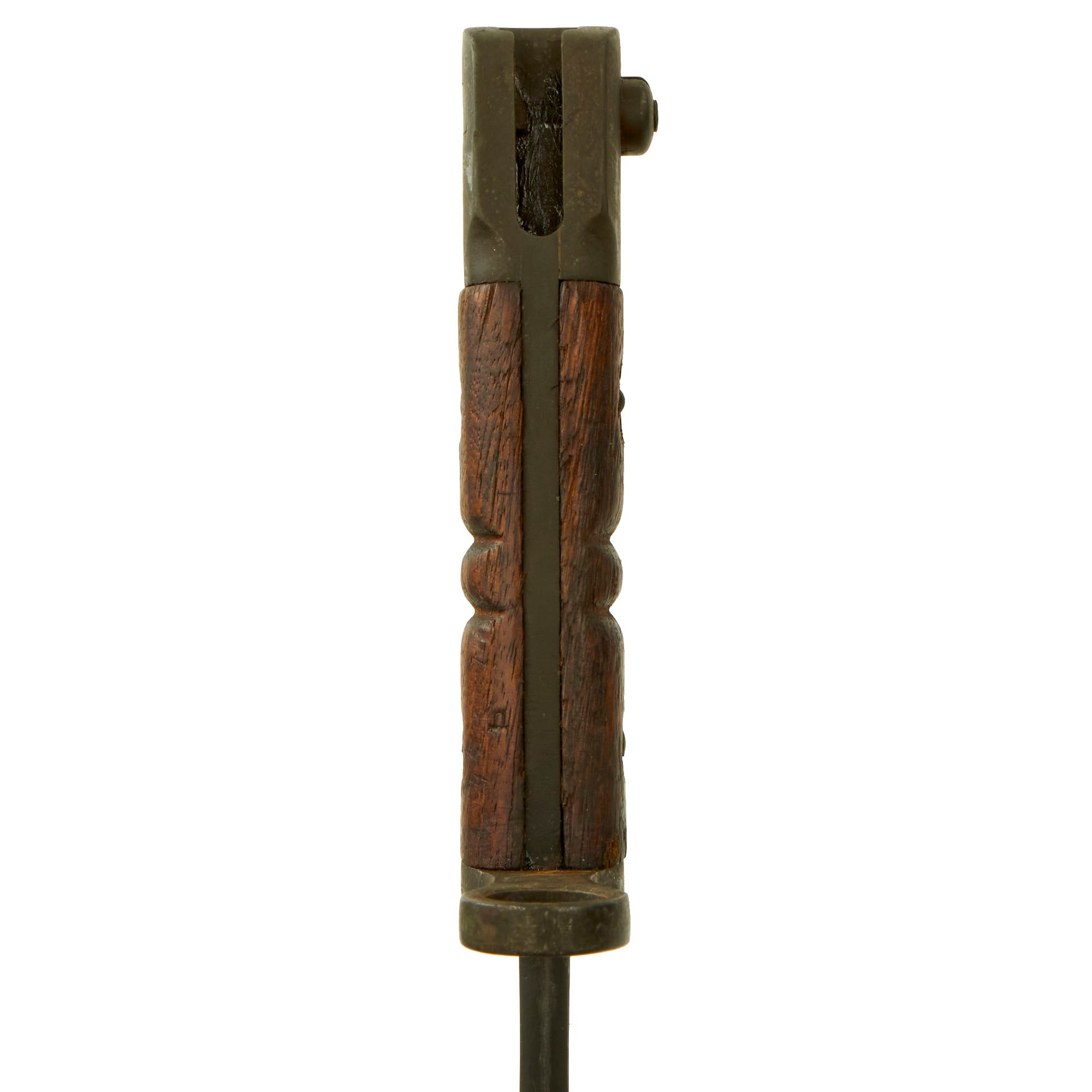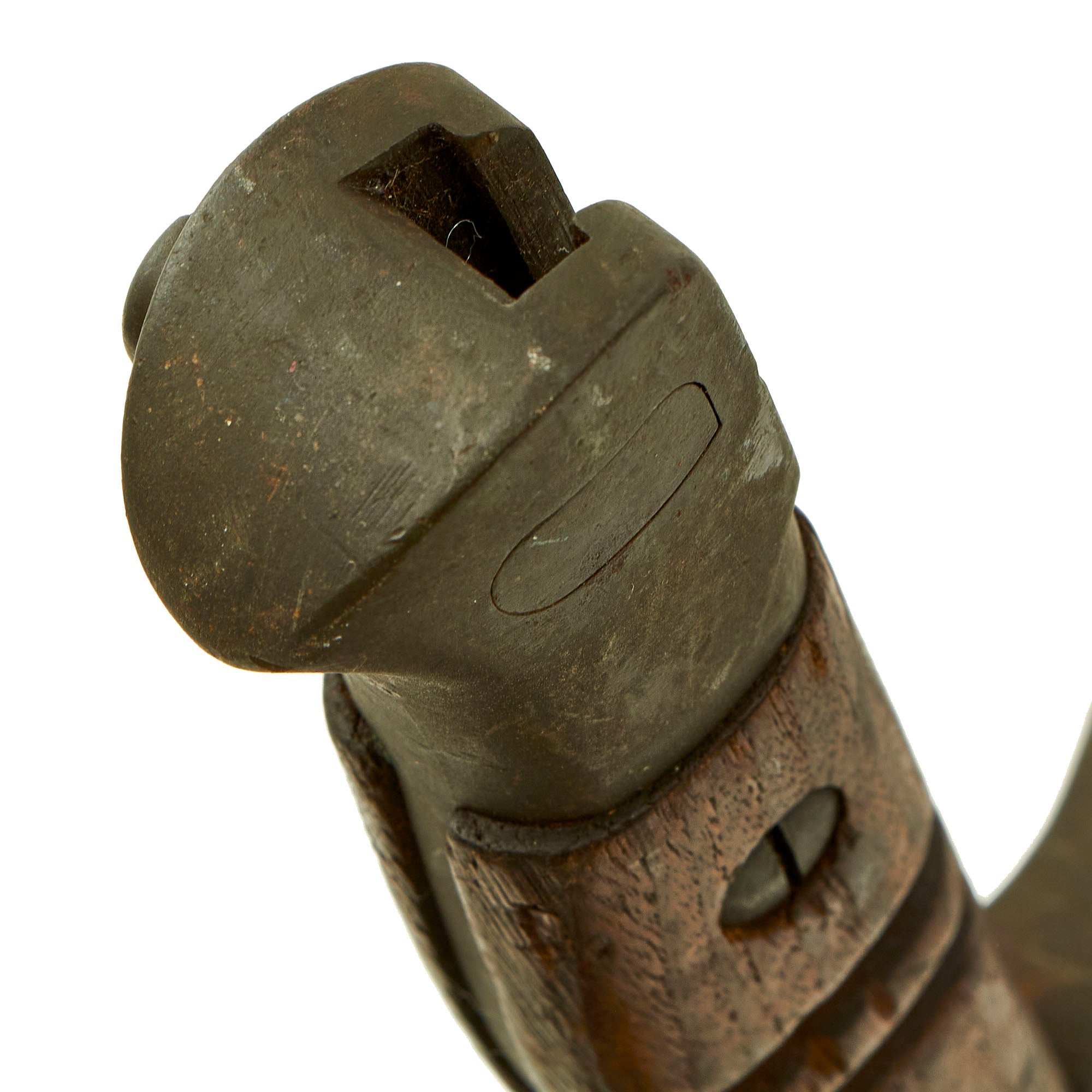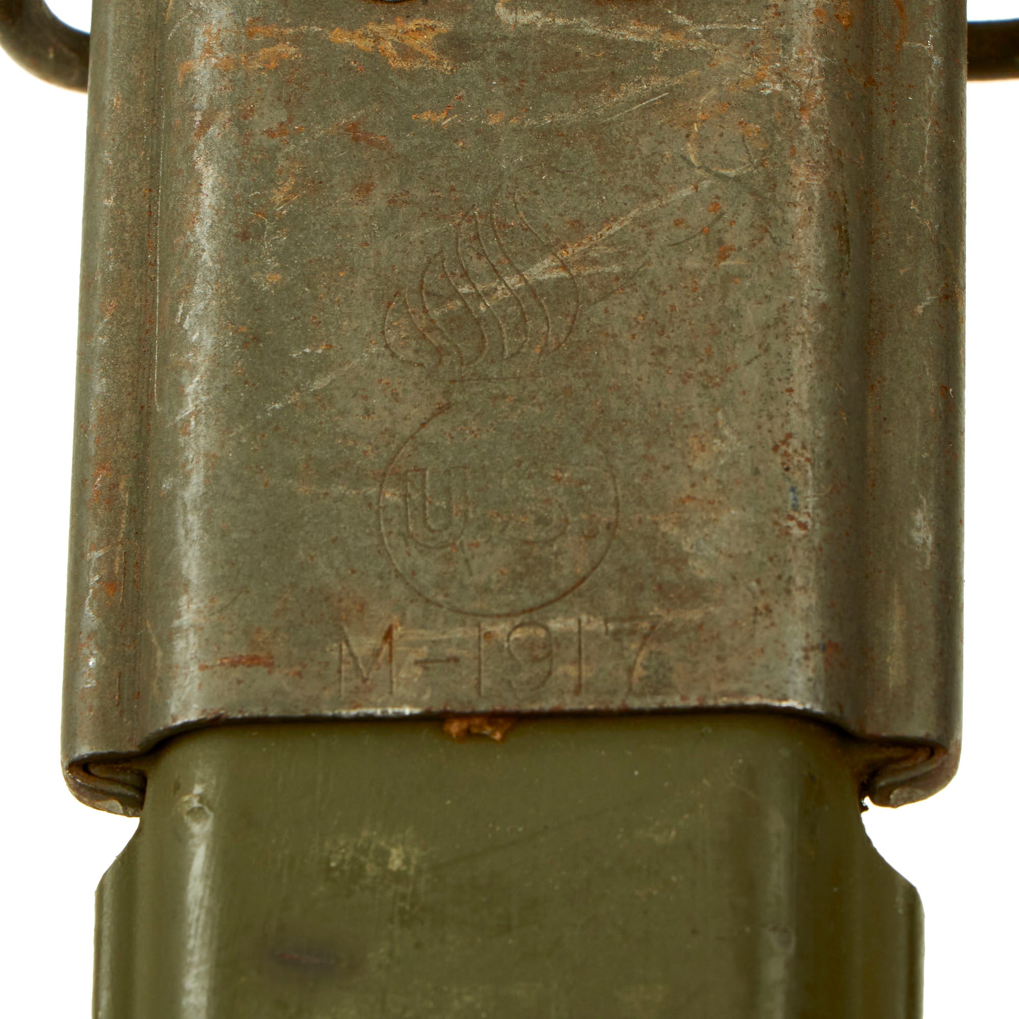 The bayonet comes with a WWII-Issue scabbard, with a fiberglass body and metal throat, which is marked: U.S. - M1917. This model scabbard was based on the M3 scabbard for the M-1942 Garand Bayonet. The slightly longer blade length of the M-1917 bayonet was handled using the same body as the M3 scabbard but with a longer metal throat. These were made by various subsidiaries of Beckwith Manufacturing Company, which made large numbers of fiberglass scabbards for knives and bayonets during the war.