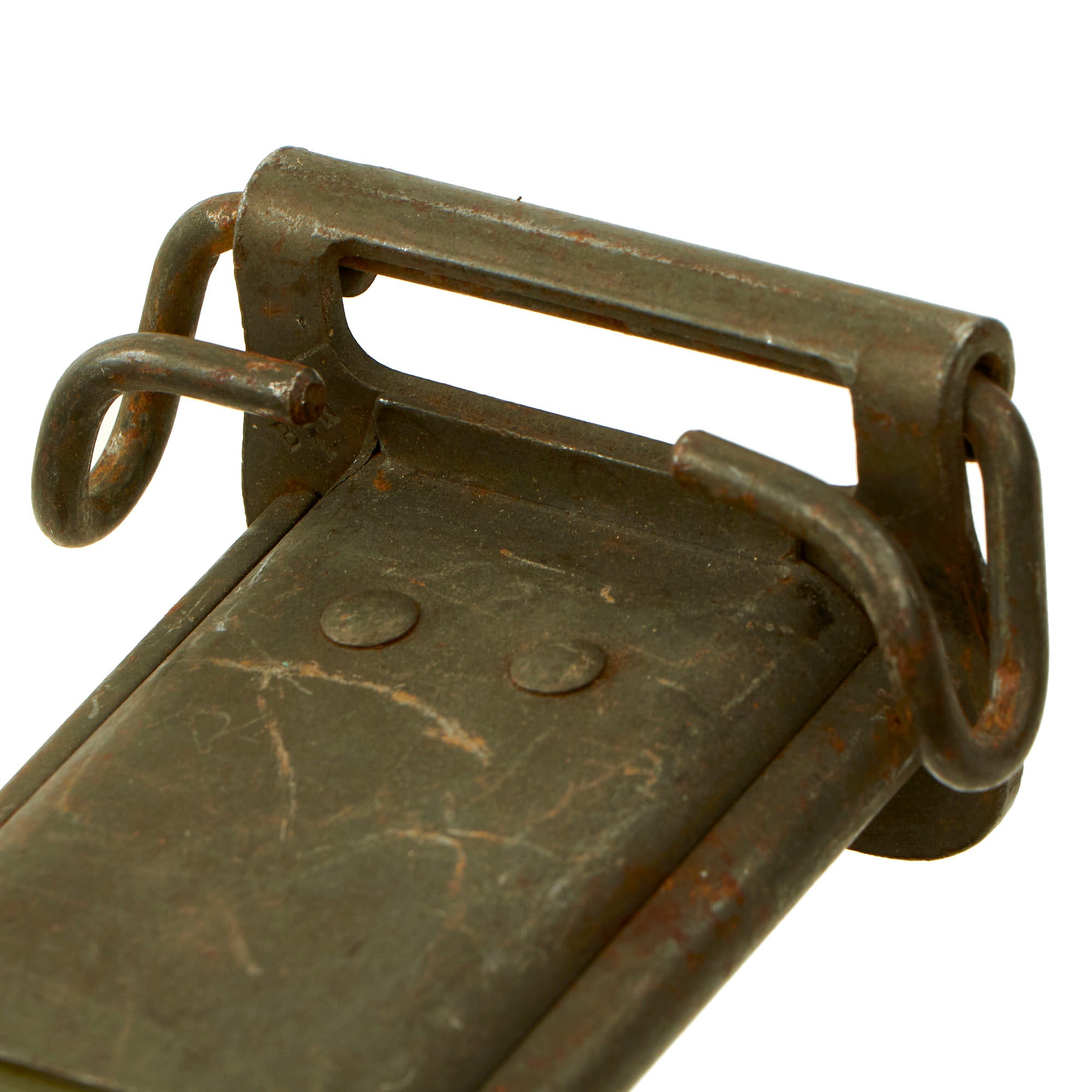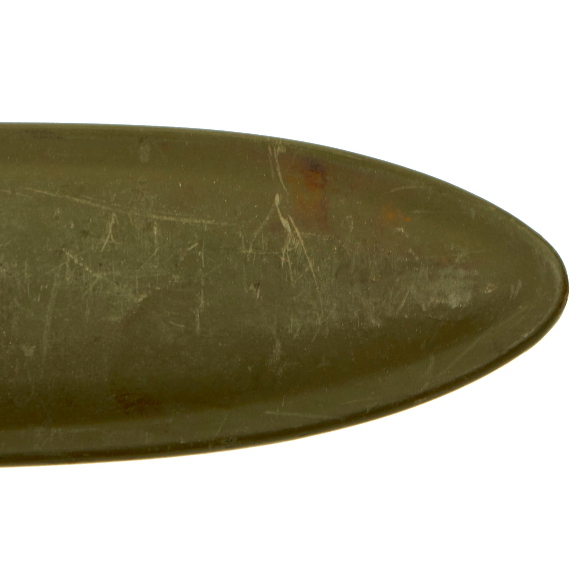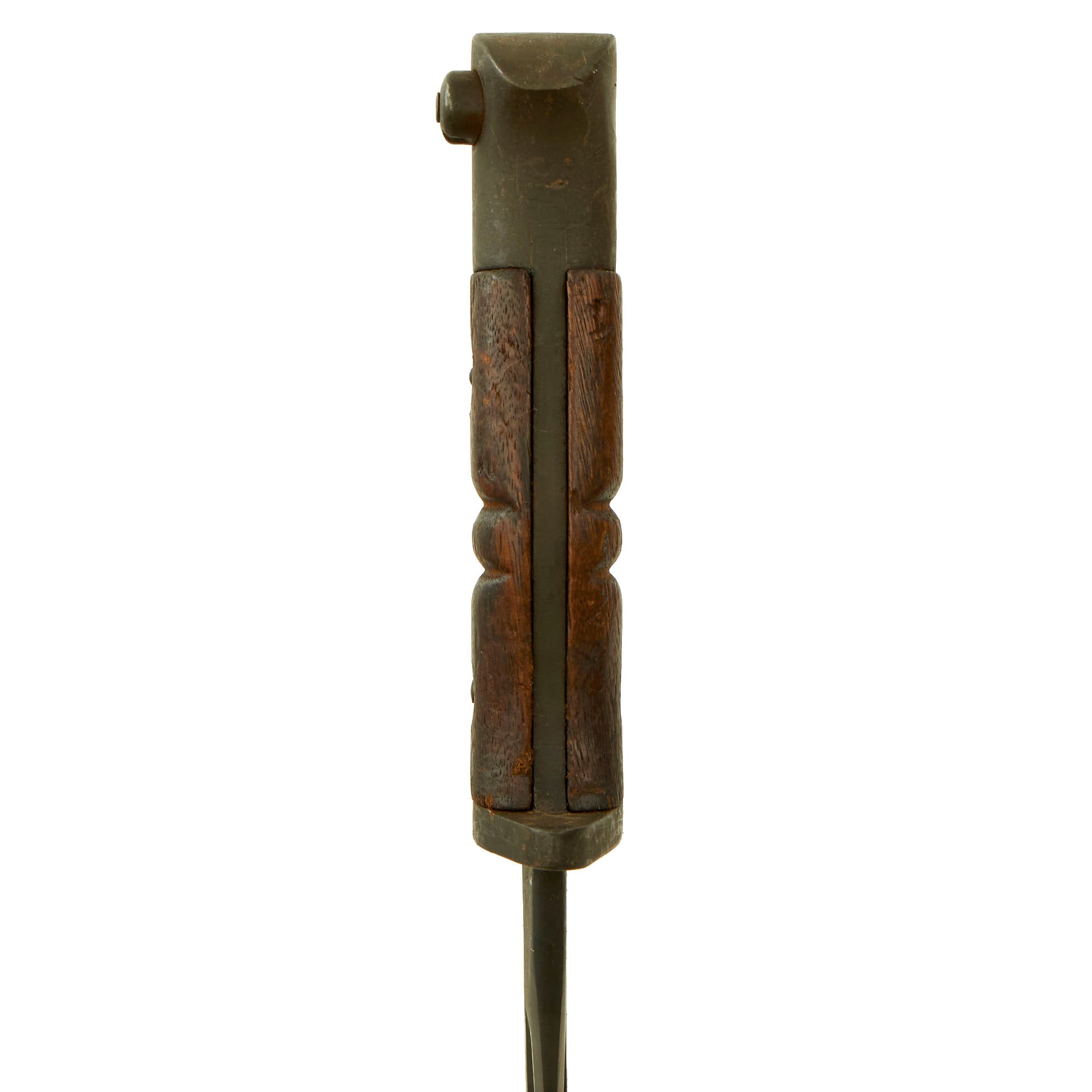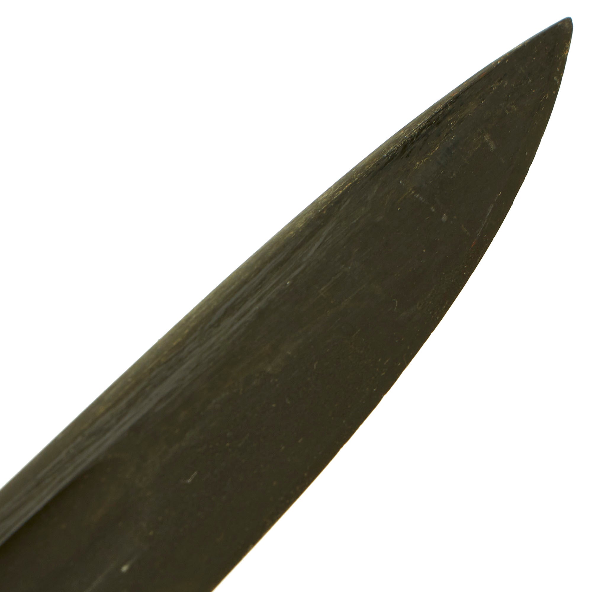 The bayonet comes with a WWII-Issue scabbard, with a fiberglass body and metal throat, which is marked: U.S. - M1917. This model scabbard was based on the M3 scabbard for the M-1942 Garand Bayonet. The slightly longer blade length of the M-1917 bayonet was handled using the same body as the M3 scabbard but with a longer metal throat. These were made by various subsidiaries of Beckwith Manufacturing Company, which made large numbers of fiberglass scabbards for knives and bayonets during the war.