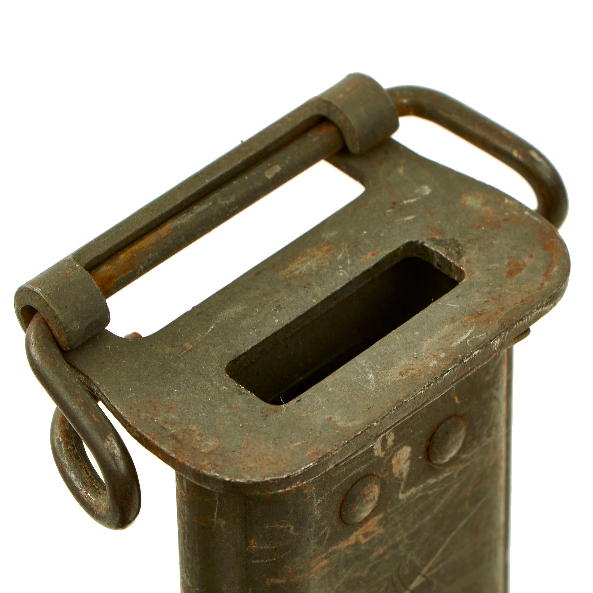 The scabbard is in very good condition, with very little wear to the scabbard body, which still has a great olive drab color. The throat has suffered some light corrosion, but most of the original finish is still present.