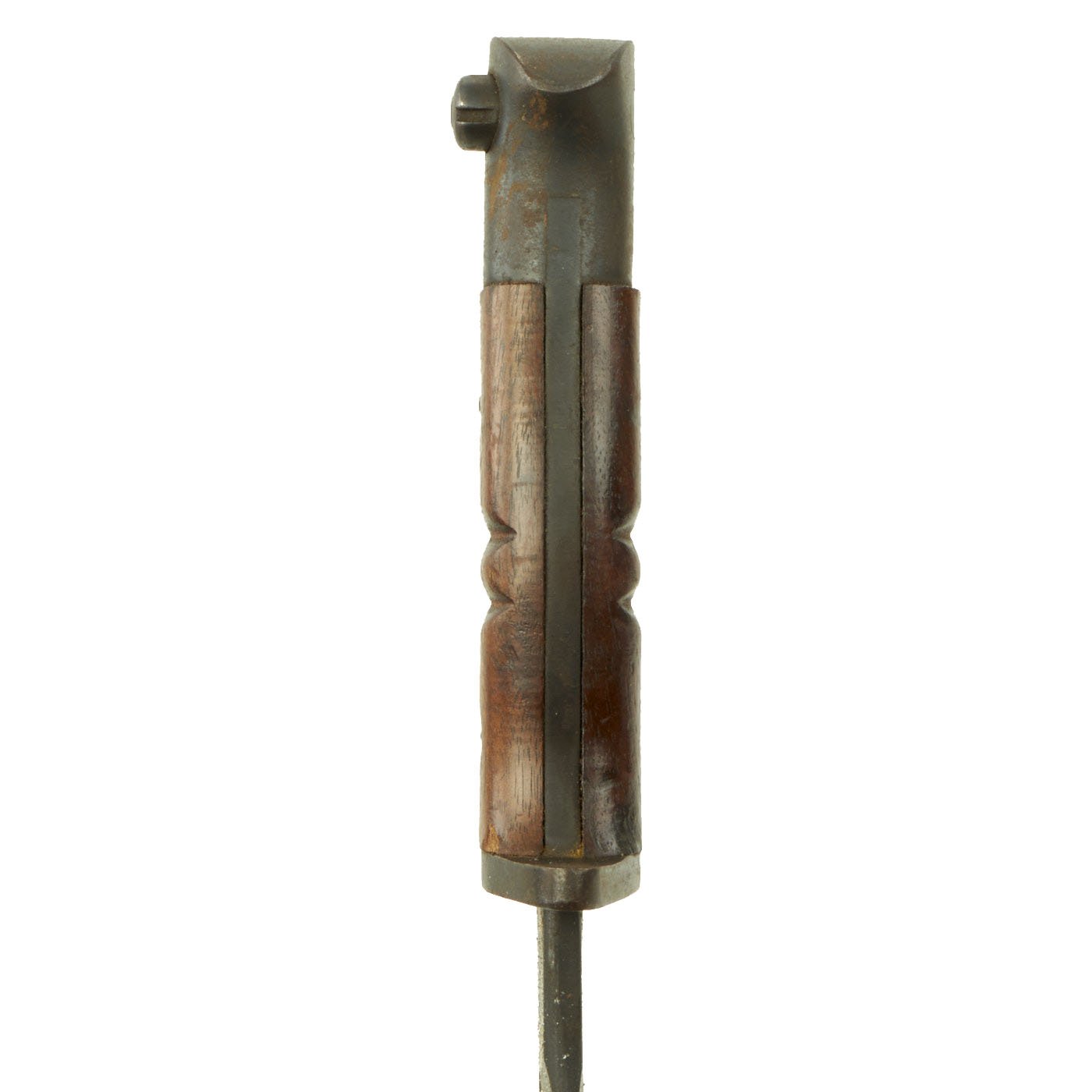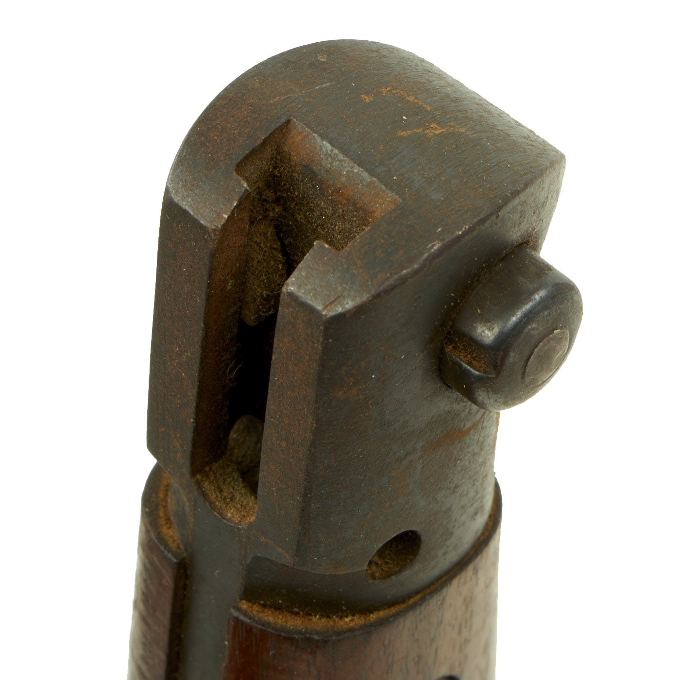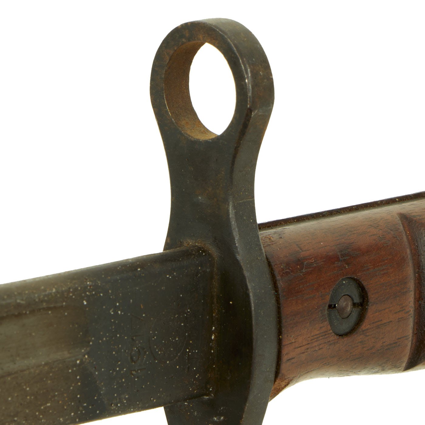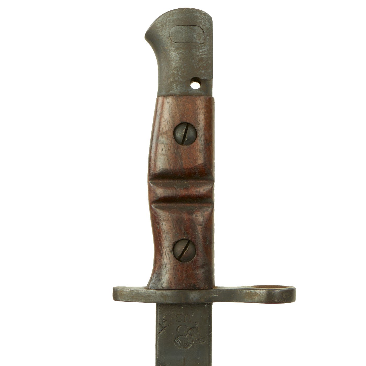 This bayonet is in excellent condition, and is marked on the blade ricasso with date 1917 over the REMINGTON in a circle manufacturer's mark. The reverse ricasso is marked with the ordnance "Flaming Bomb" over U.S., next to an Eagle / 14 proof mark, for acceptance at Frankford Arsenal. The blade is in excellent condition, still sharp with no pitting or major wear we can see, though there is some dried grease on the surface. It has however has been arsenal refinished with a parkerized phosphate finish. This indicates it was almost certainly reissued for WWII to use with Trench Shotguns. The hilt still has a nice blued finish, with a very nice pair of wood grip scales. Aside from a small chip near the crossguard, they almost look unissued.