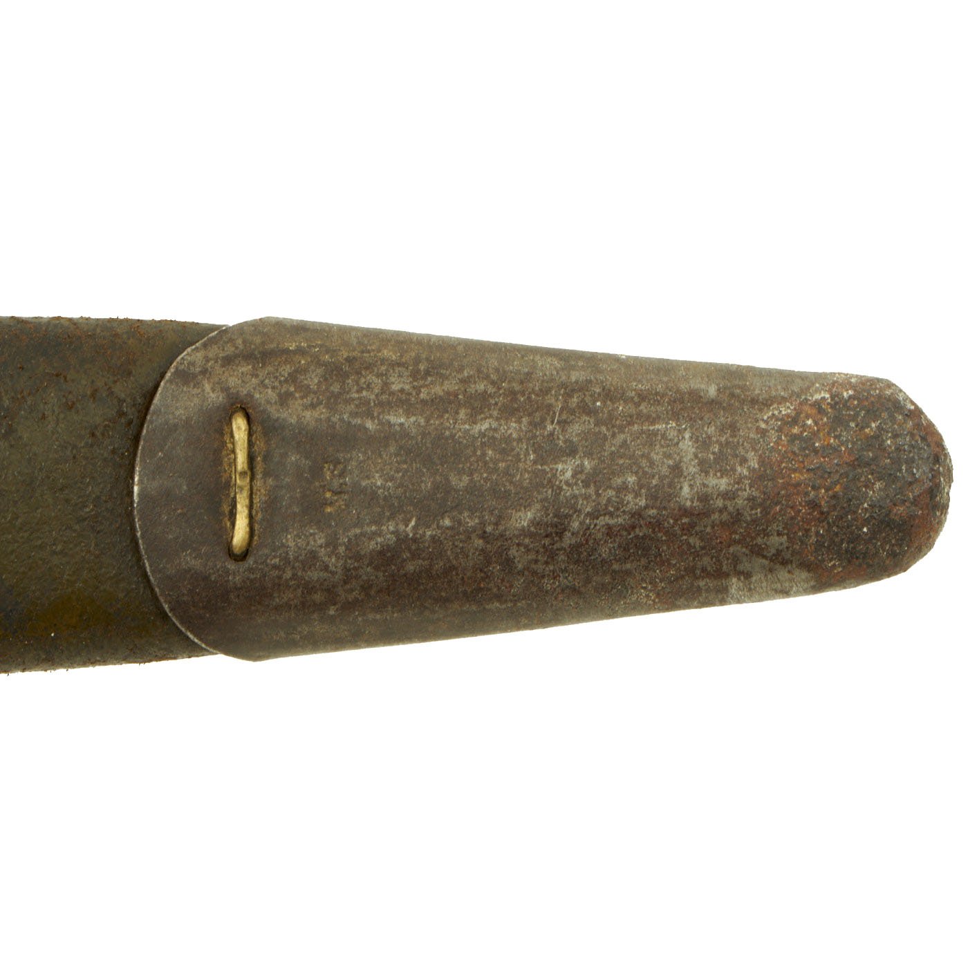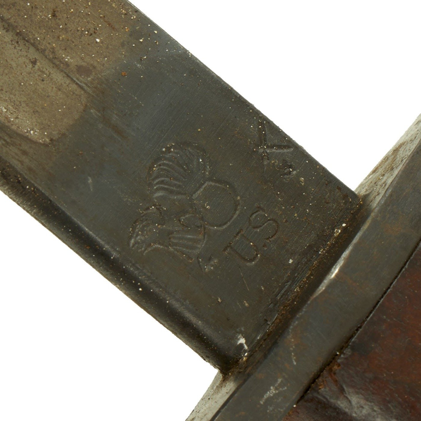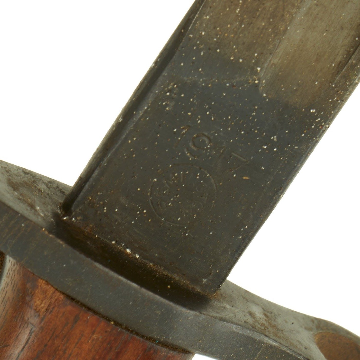 Original items: Only One Available. This is a very good example of the rare and hard to find U.S. M1917 Enfield bayonet, complete with it's original issue leather scabbard. The M1917 bayonet was originally designed to be used with the US M1917 Enfield .30 caliber rifle, as well as with the seven different U.S. trench shotguns. The blade is 17 inches (43.18 cm) long. The M1917 Enfield was the U.S. Version of the British P-14 rifle, and the bayonets used are identical, down to the double groove in the grips, used to differentiate the bayonets from the P-1907 for the SMLE rifle.