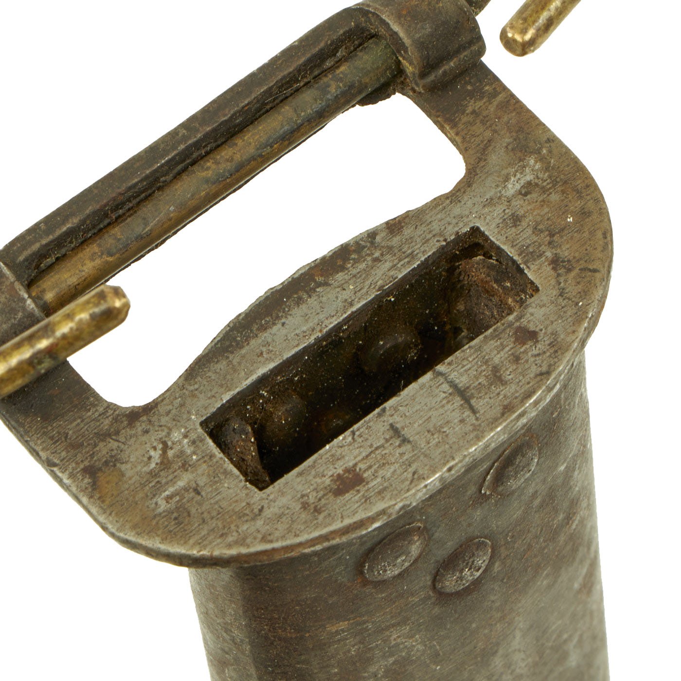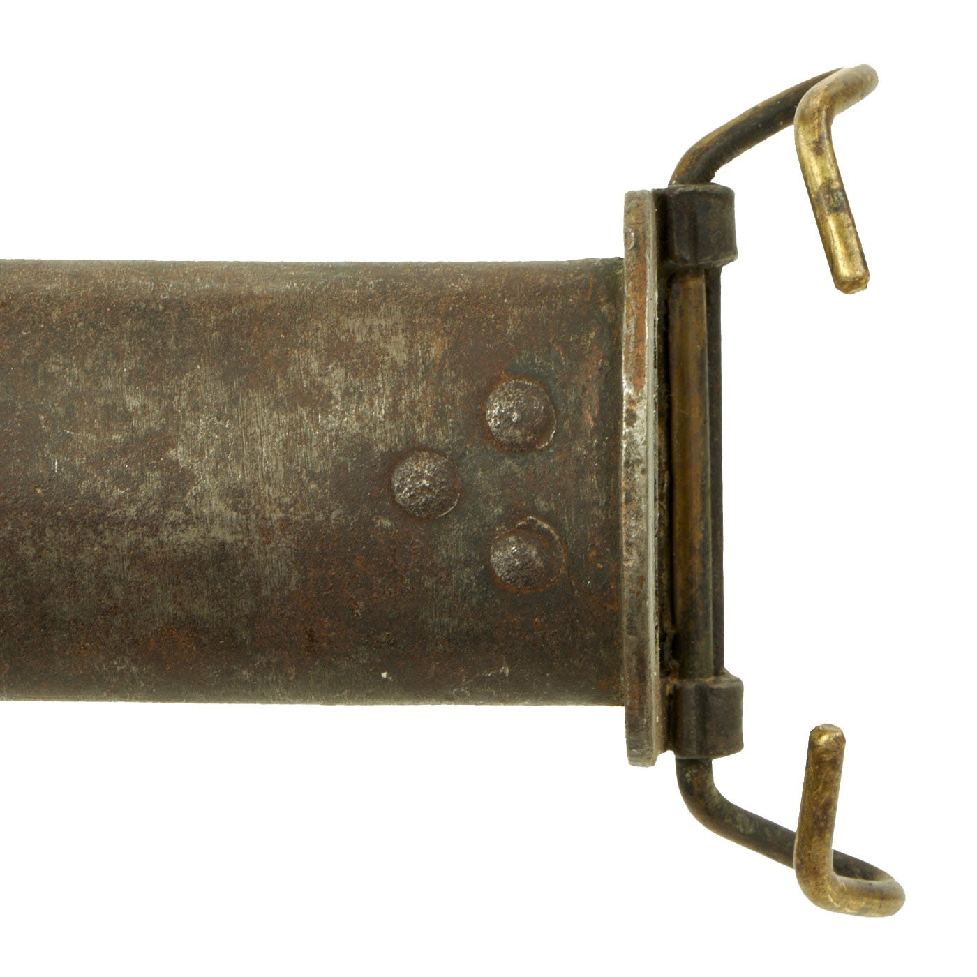 The scabbard is also in good shape, with intact leather, and most of the original green paint. It has not been repainted, like many we see, and maker mark H.E. on the back. The original steel fittings are a bit worn, with a lovely oxidized patina.