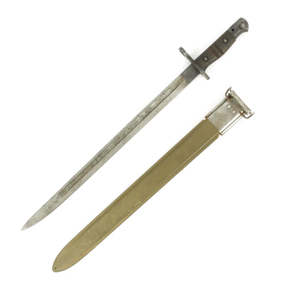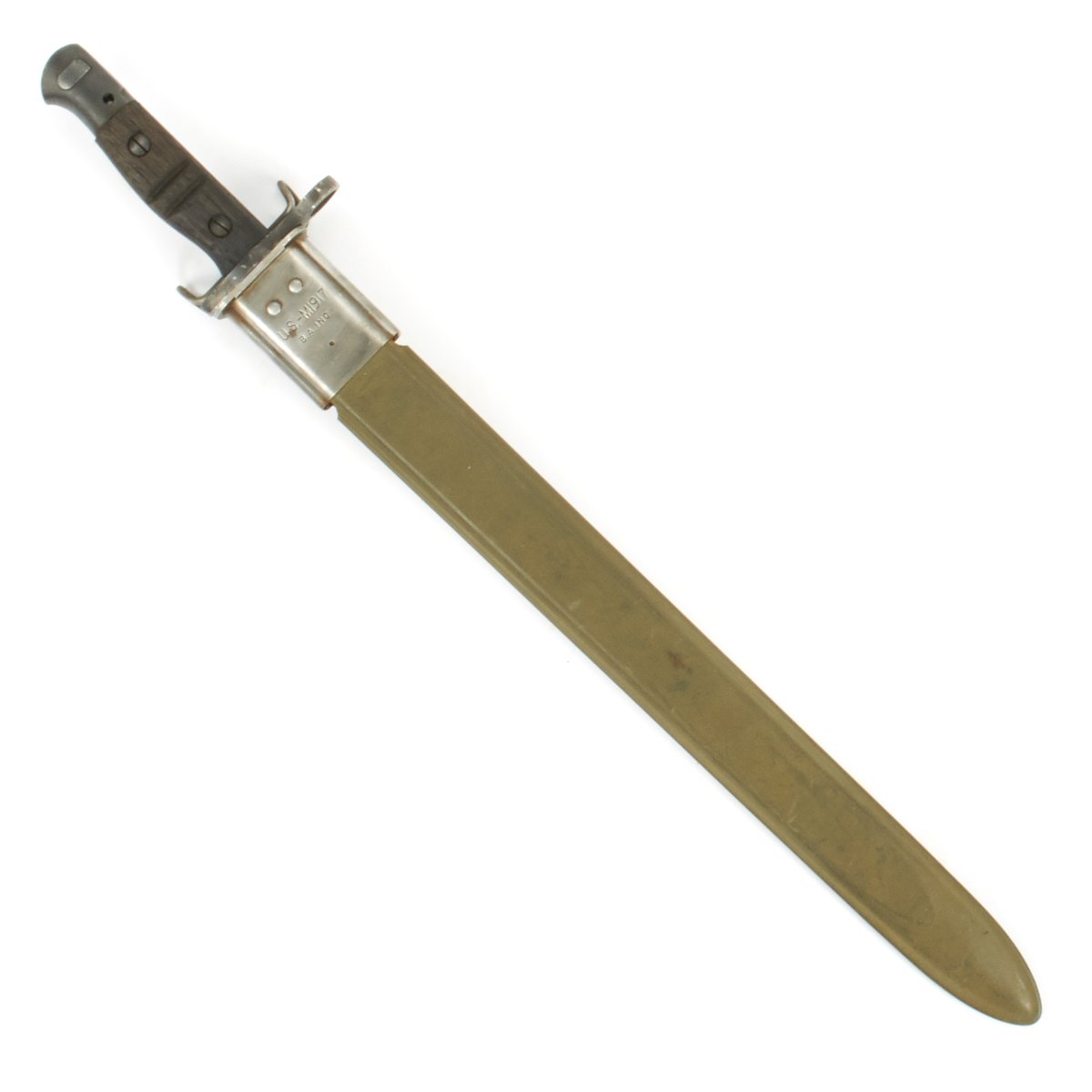 Original Item: Only One Available. The M1917 bayonet was designed to be used with the US M1917 Enfield .30 caliber rifle, as well as with the seven different U.S. trench shotguns. The blade is 17 inches (43.18 cm) long. The M1917 Enfield was the U.S. Version of the British P-14 rifle, and the bayonets used are identical, down to the double groove in the grips, used to differentiate the bayonets from the P-1907 for the SMLE rifle.