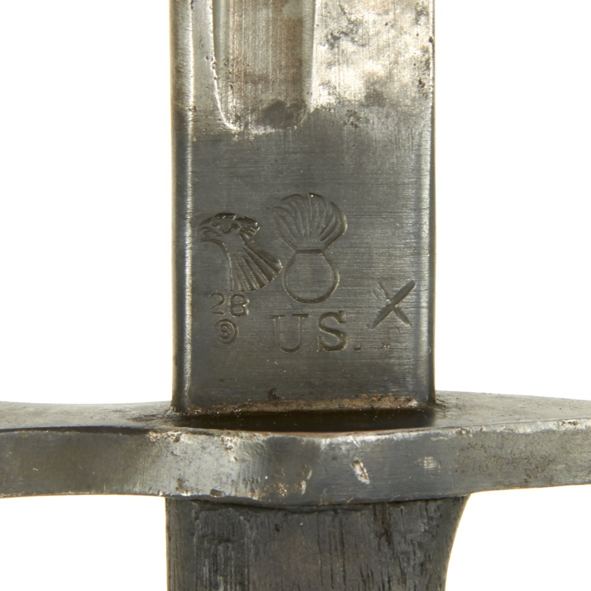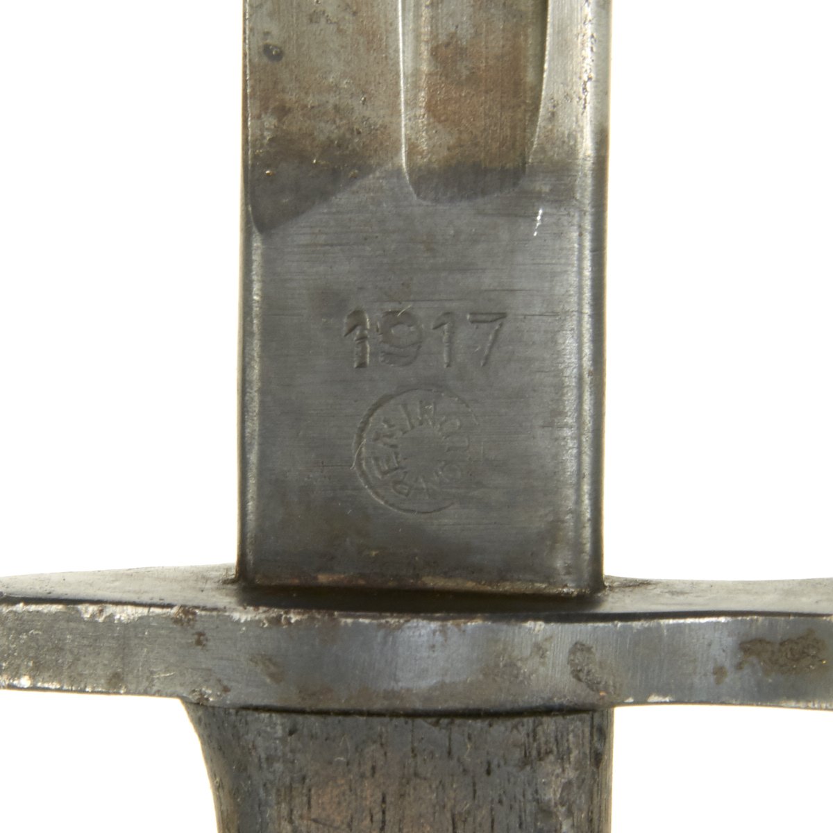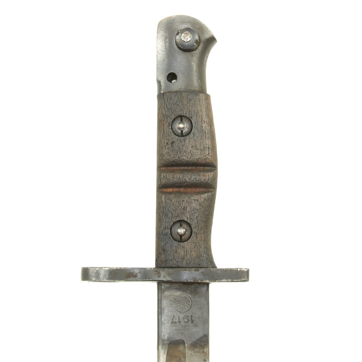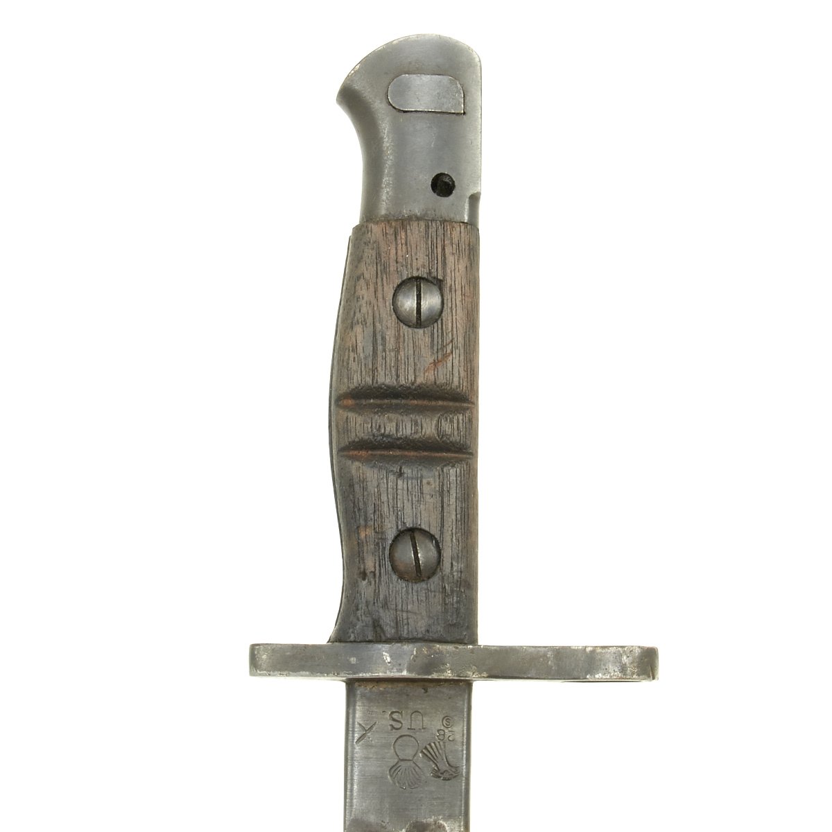 This bayonet is marked 1917 over REMINGTON in a circle on the ricasso. The reverse has the Ordnance "Flaming Bomb" over U.S., along with an Eagle / 28 inspection stamp. The wood grips are in excellent condition, with no chips or cracks we can see. The finish on the blade is worn, with some traces of past pitting, indicating the long service life of a bayonet that may have seen service in two world wars.