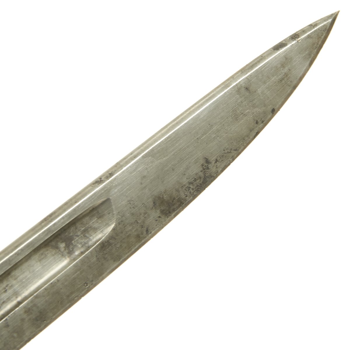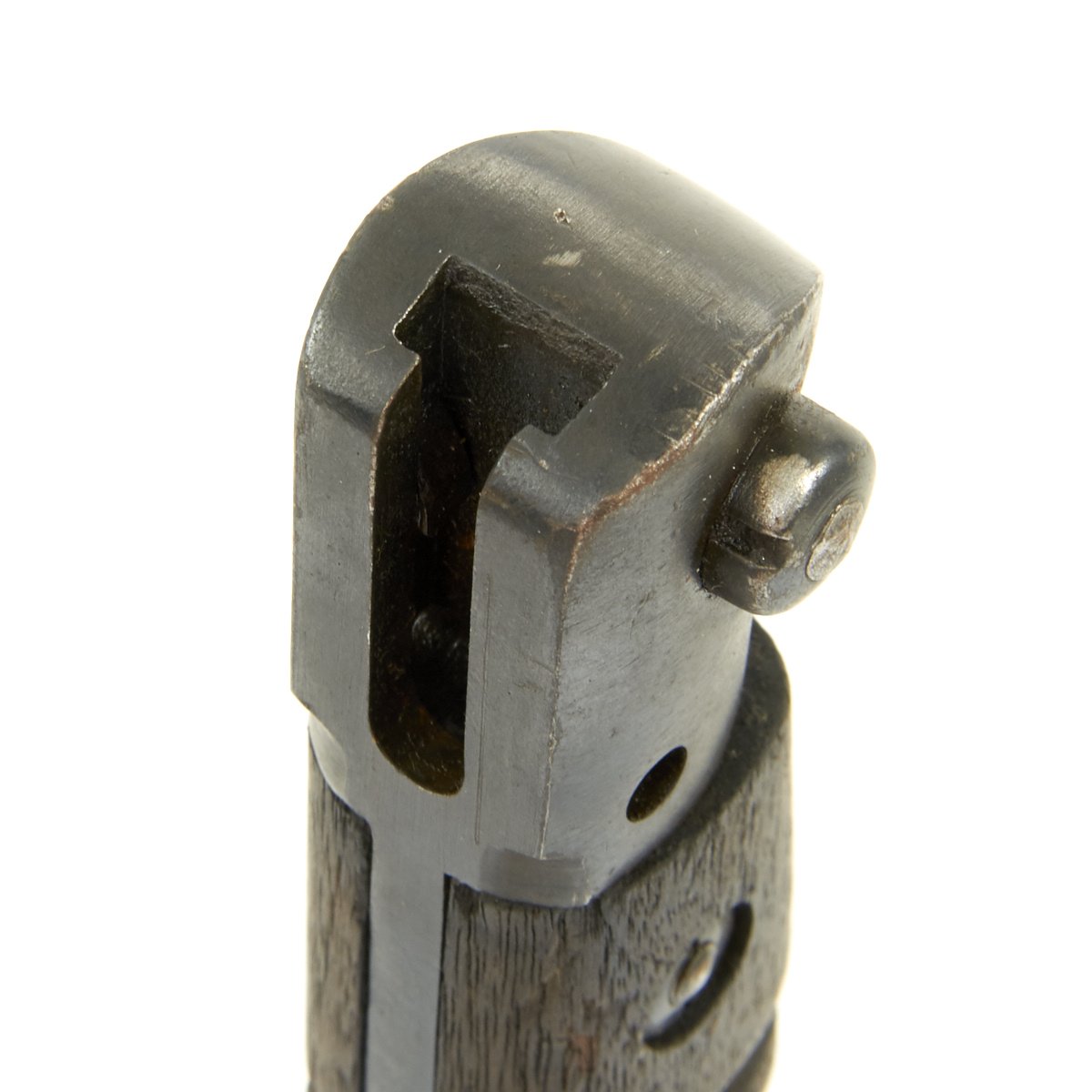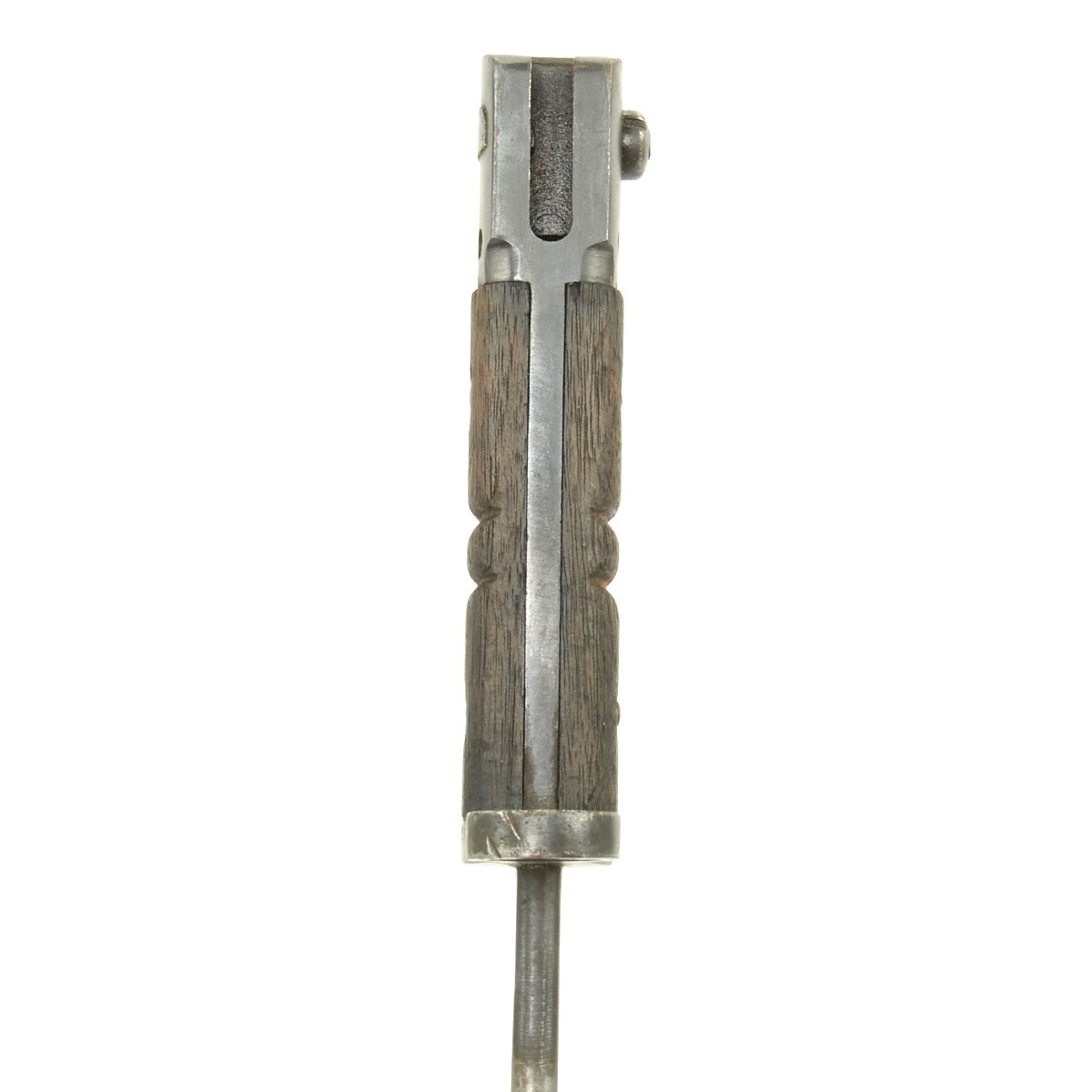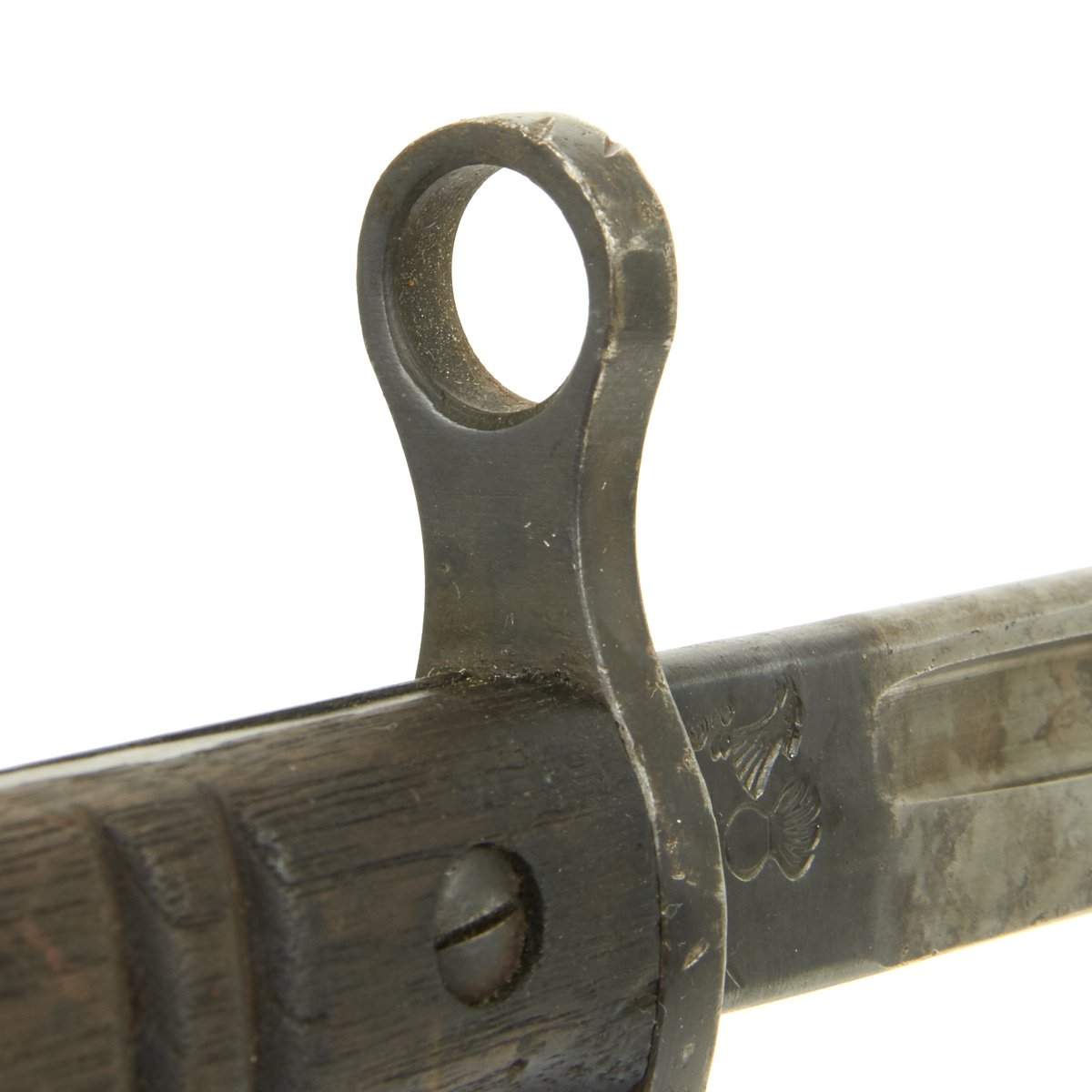 This bayonet is marked 1917 over REMINGTON in a circle on the ricasso. The reverse has the Ordnance "Flaming Bomb" over U.S., along with an Eagle / 28 inspection stamp. The wood grips are in excellent condition, with no chips or cracks we can see. The finish on the blade is worn, with some traces of past pitting, indicating the long service life of a bayonet that may have seen service in two world wars.