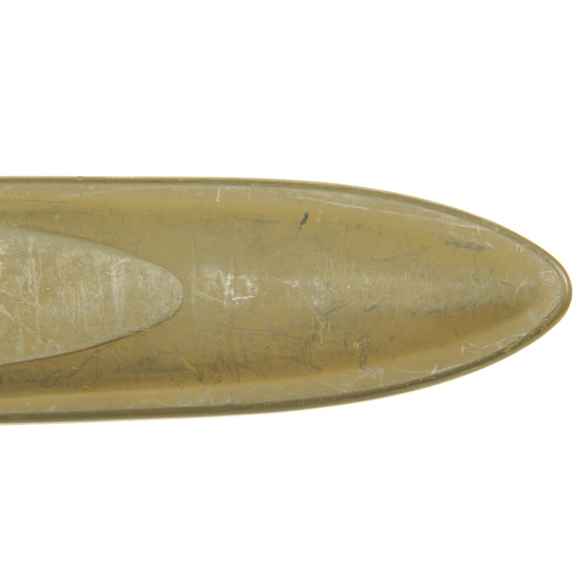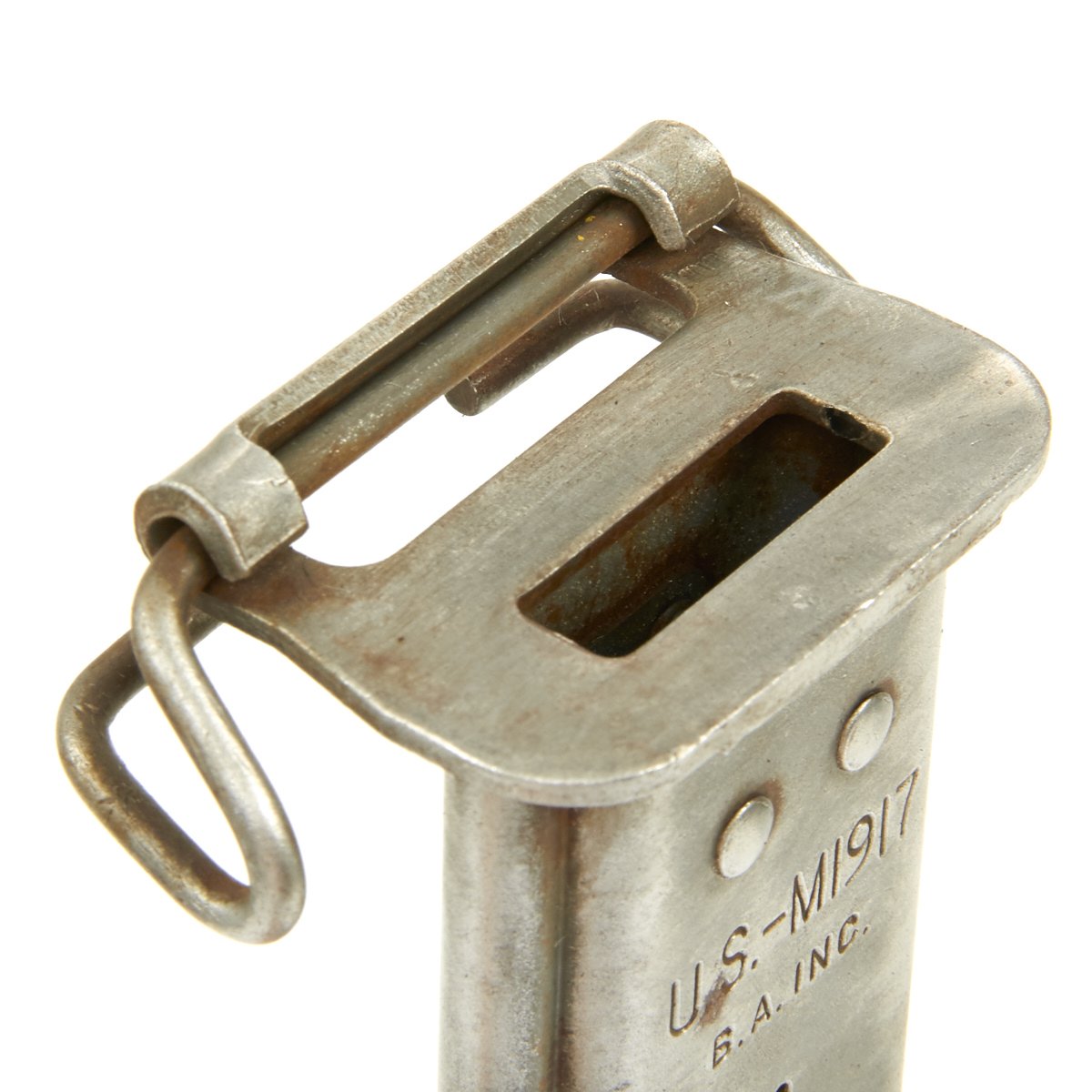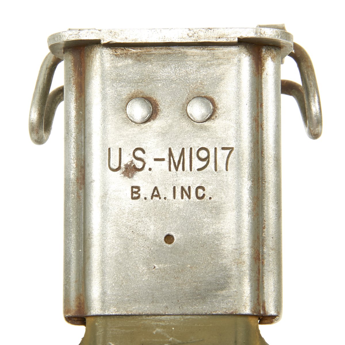 The bayonet comes with a WWII-Issue scabbard, with a fiberglass body and metal throat, which is marked: U.S. - M1917 / B.A. INC.. This model scabbard was based on the M3 scabbard for the M-1942 Garand Bayonet. The slightly longer blade length of the M-1917 bayonet was handled using the same body as the M3 scabbard but with a longer metal throat. These were made by various subsidiaries of Beckwith Manufacturing, which made large numbers of fiberglass scabbards for knives and bayonets during the war. The B.A. marking is for Beckwith-Arden Inc. in Massachusetts. The scabbard is in very good condition, with very little wear to the scabbard body, which still has a great olive drab color. The throat has suffered some light corrosion, which has resulted in the loss of most of the finish.