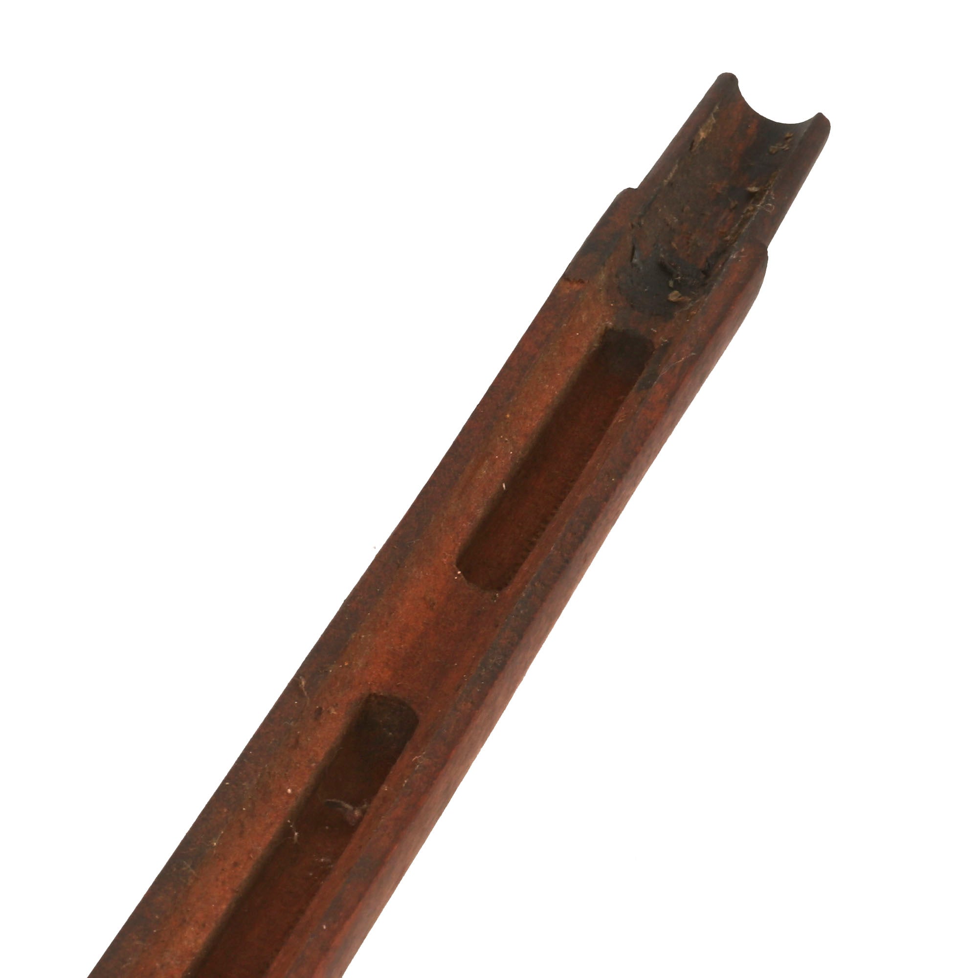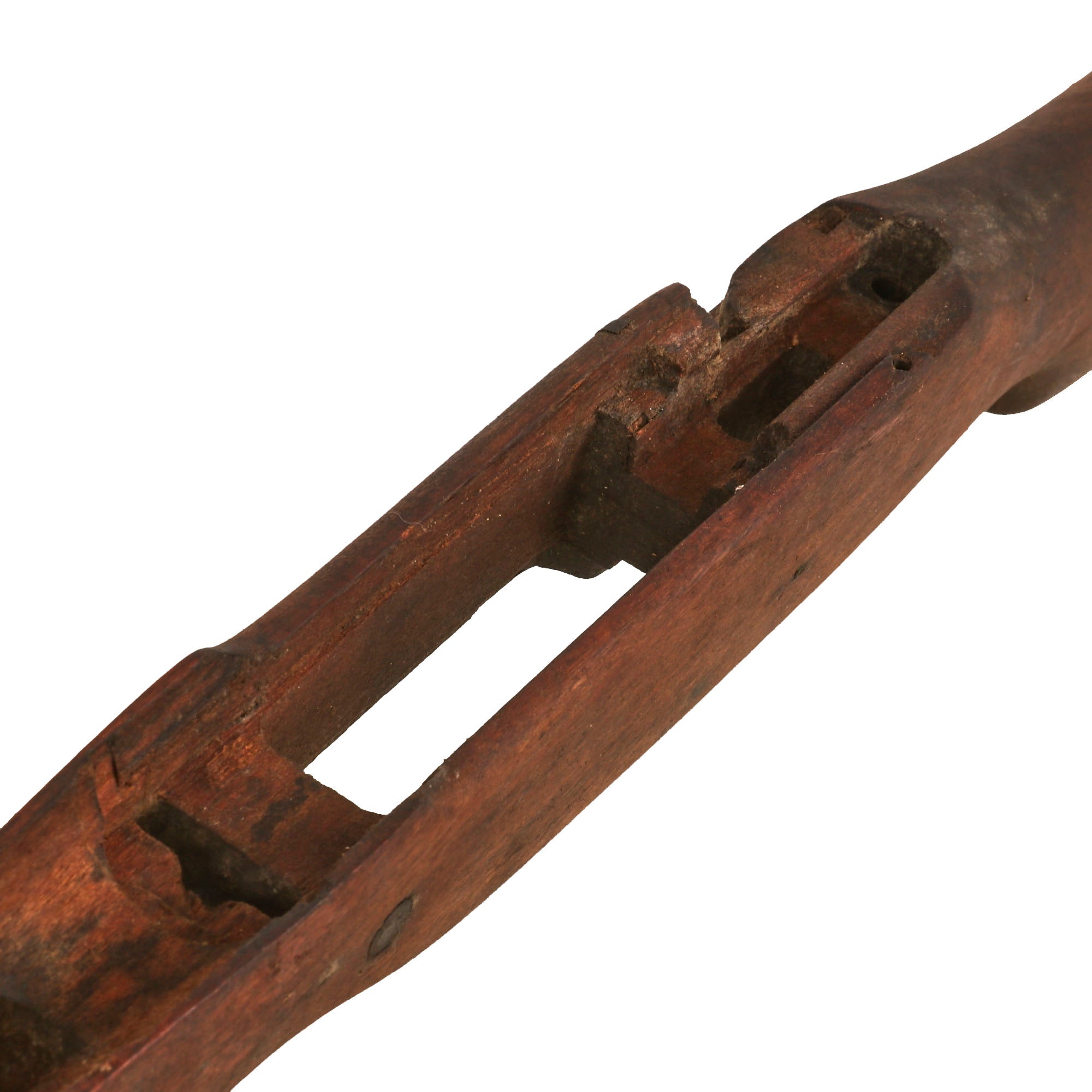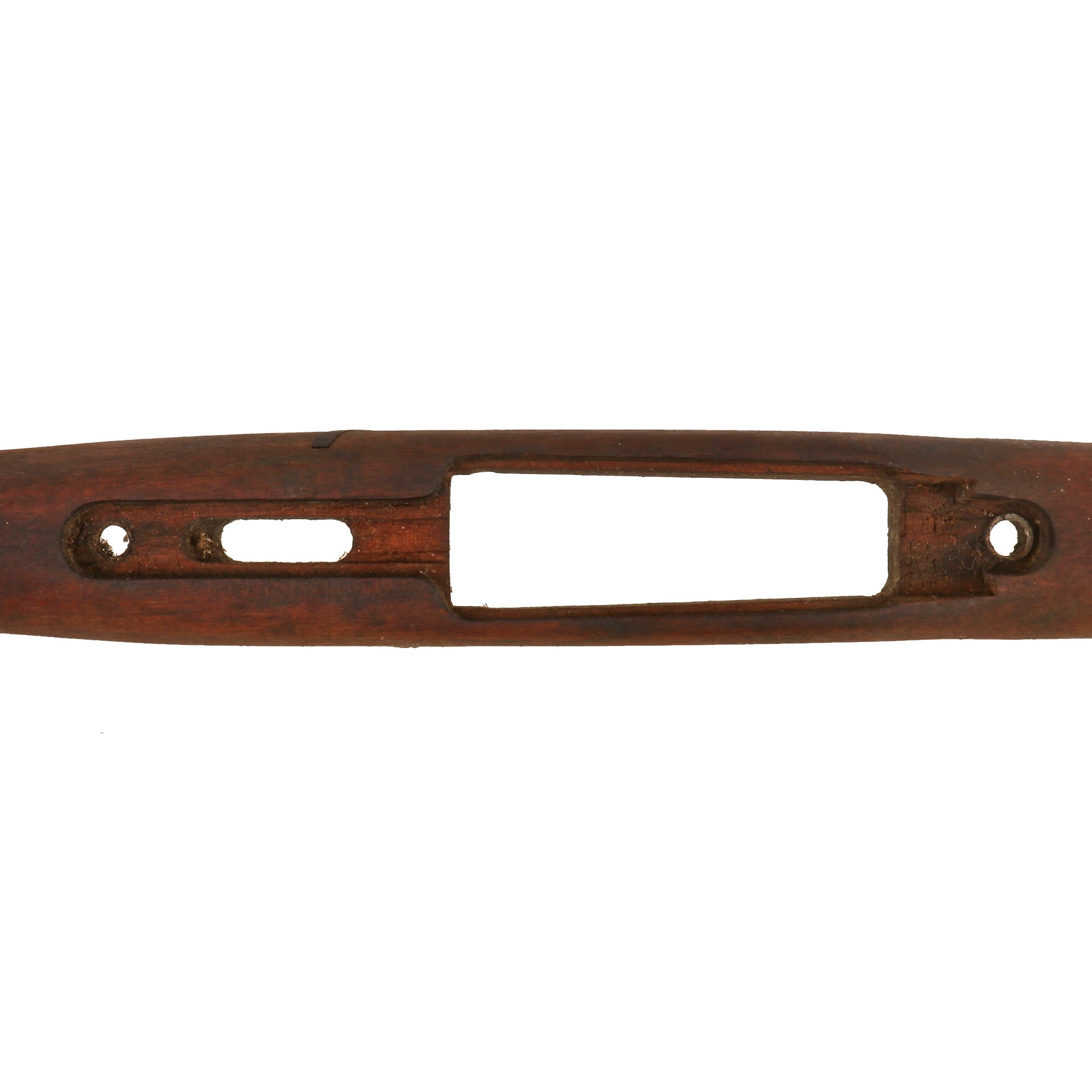 This is a very nice lower stock for a U.S. M1917 Enfield rifle, offered in very good surplus condition. It has been stripped of all metal components and fittings except for the trigger guard screw sleeves, cross screw and slotted nut in front of the receiver, and the two cross pins, one by the barrel band, and one at the rear of the receiver area. The only marking we can see is what appears to be a letter G on the front of the nose.