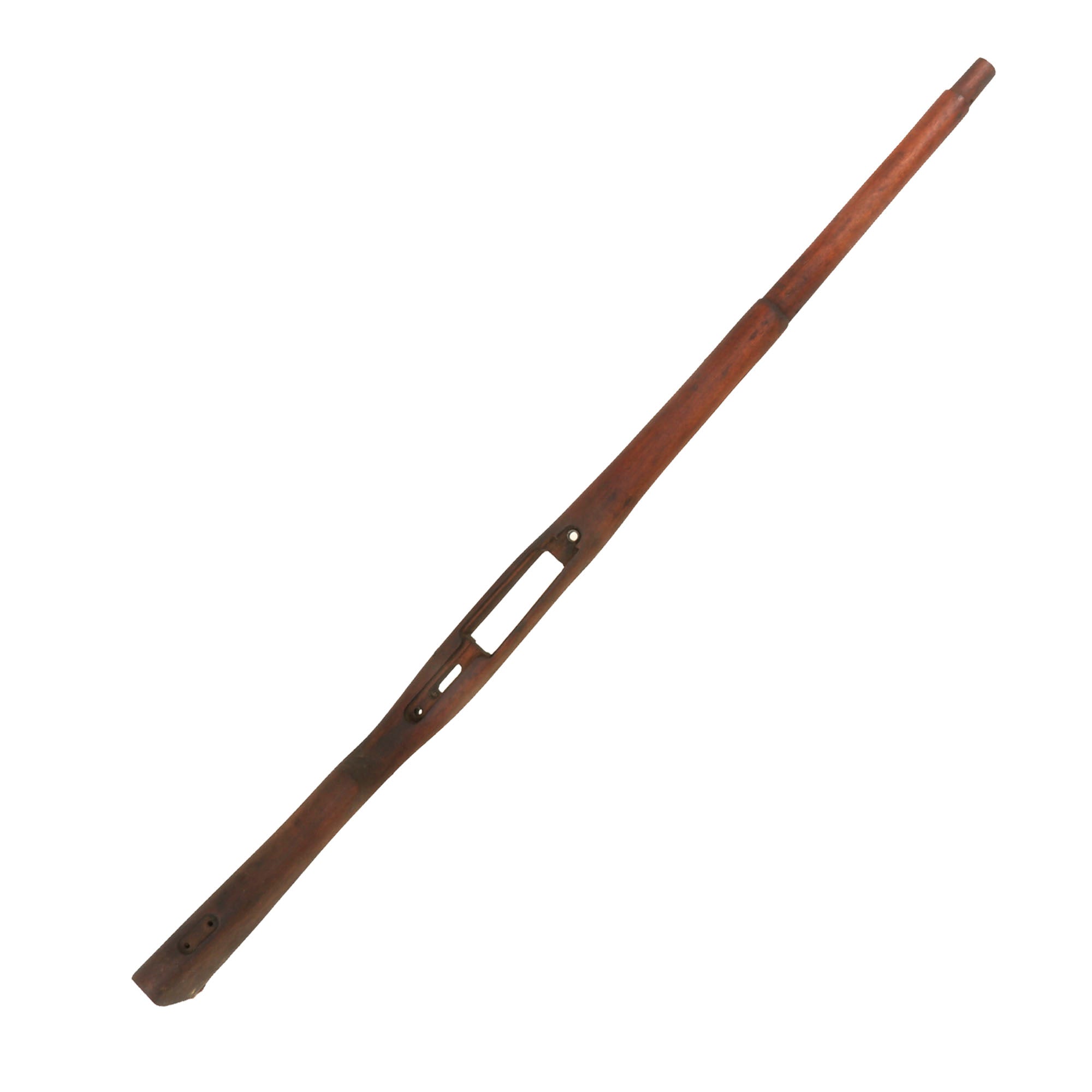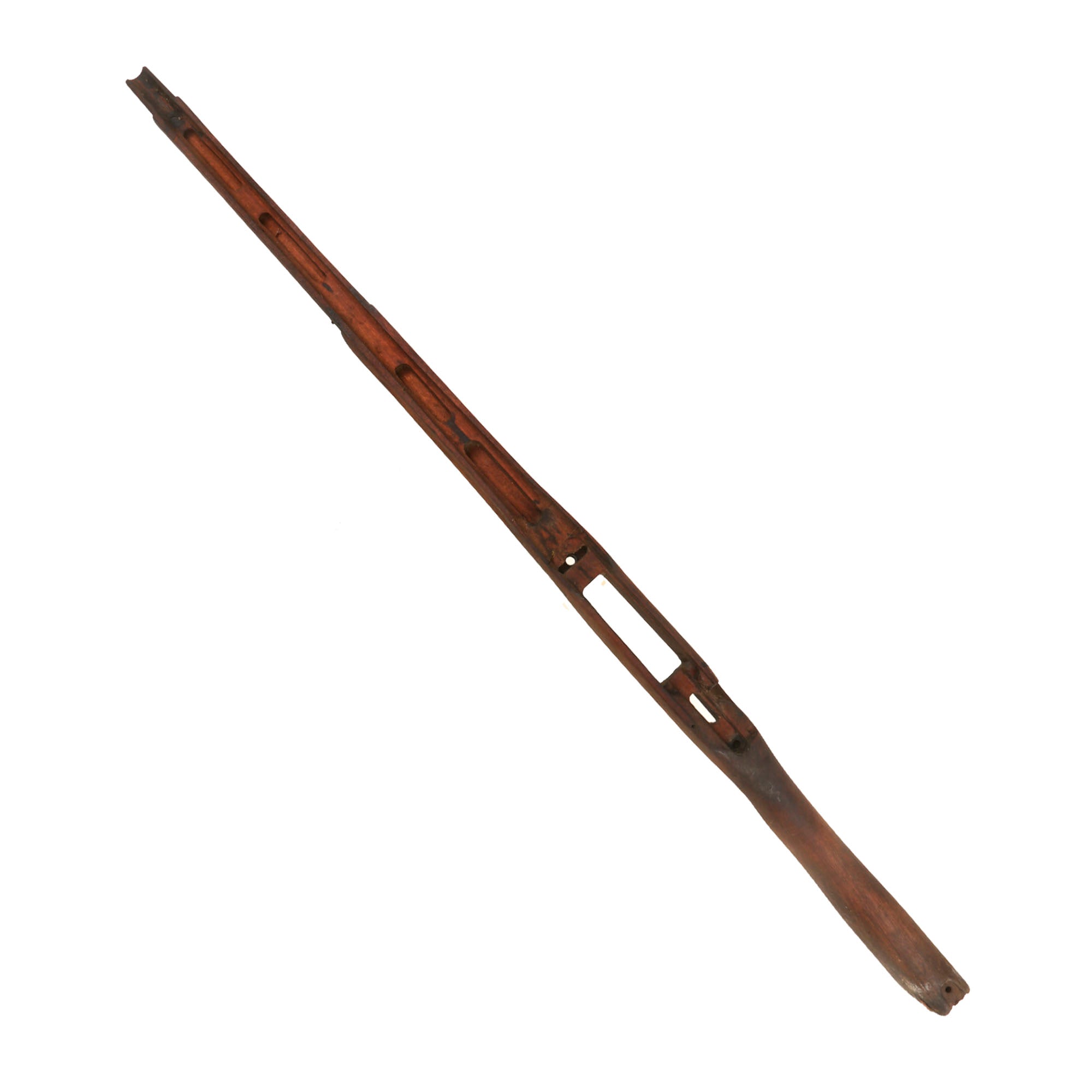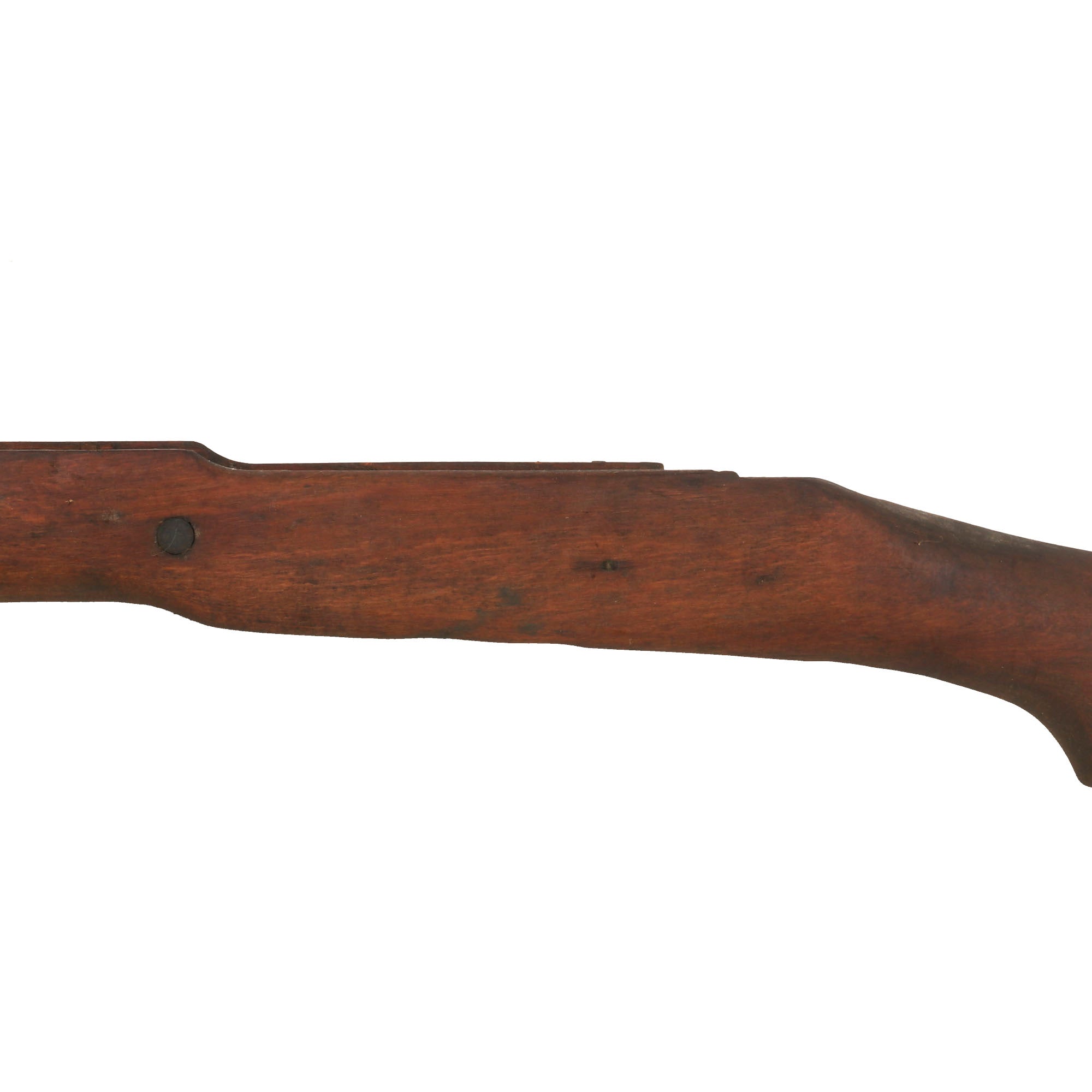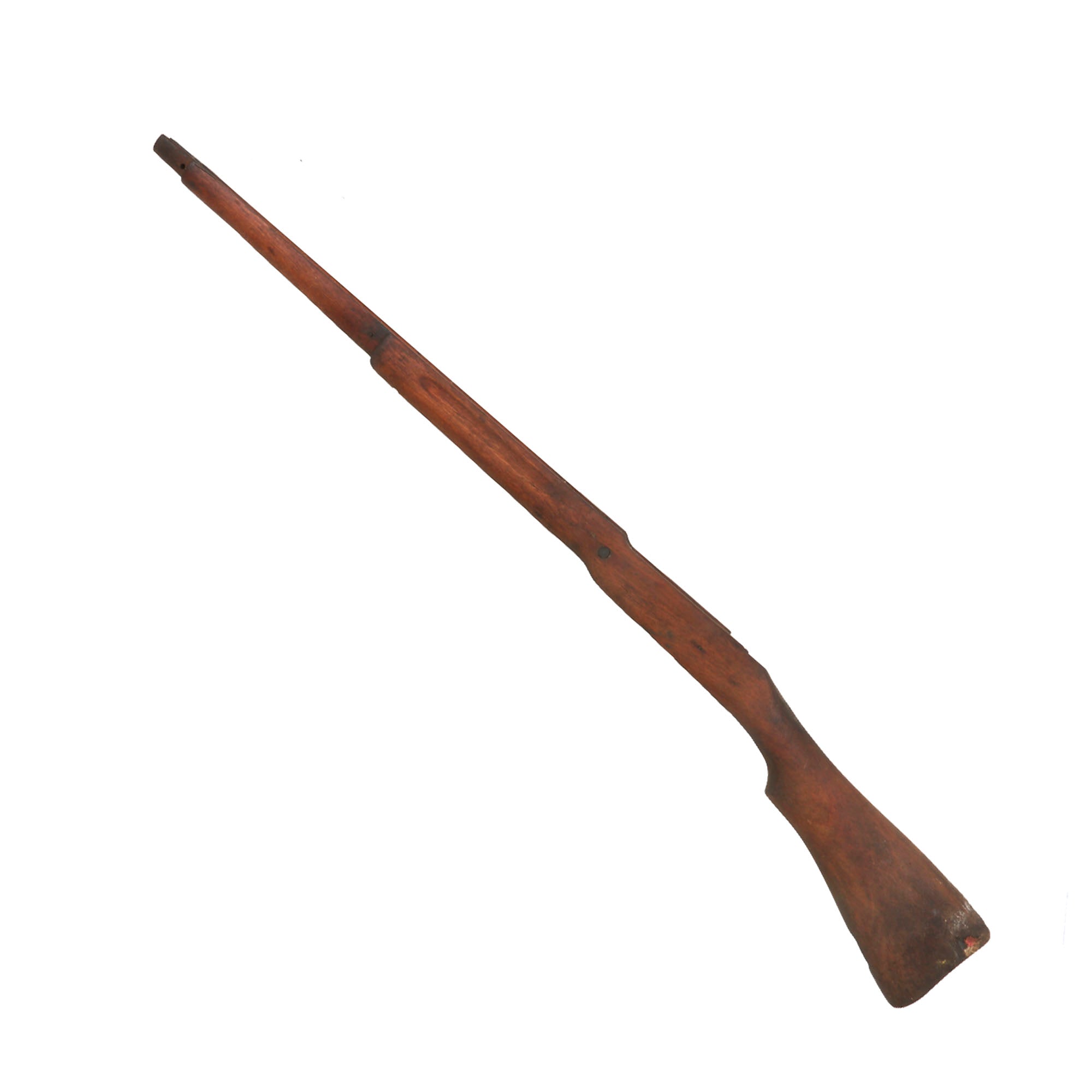 This is a very nice lower stock for a U.S. M1917 Enfield rifle, offered in very good surplus condition. It has been stripped of all metal components and fittings except for the trigger guard screw sleeves, cross screw and slotted nut in front of the receiver, and the two cross pins, one by the barrel band, and one at the rear of the receiver area. The only marking we can see is what appears to be a letter G on the front of the nose.