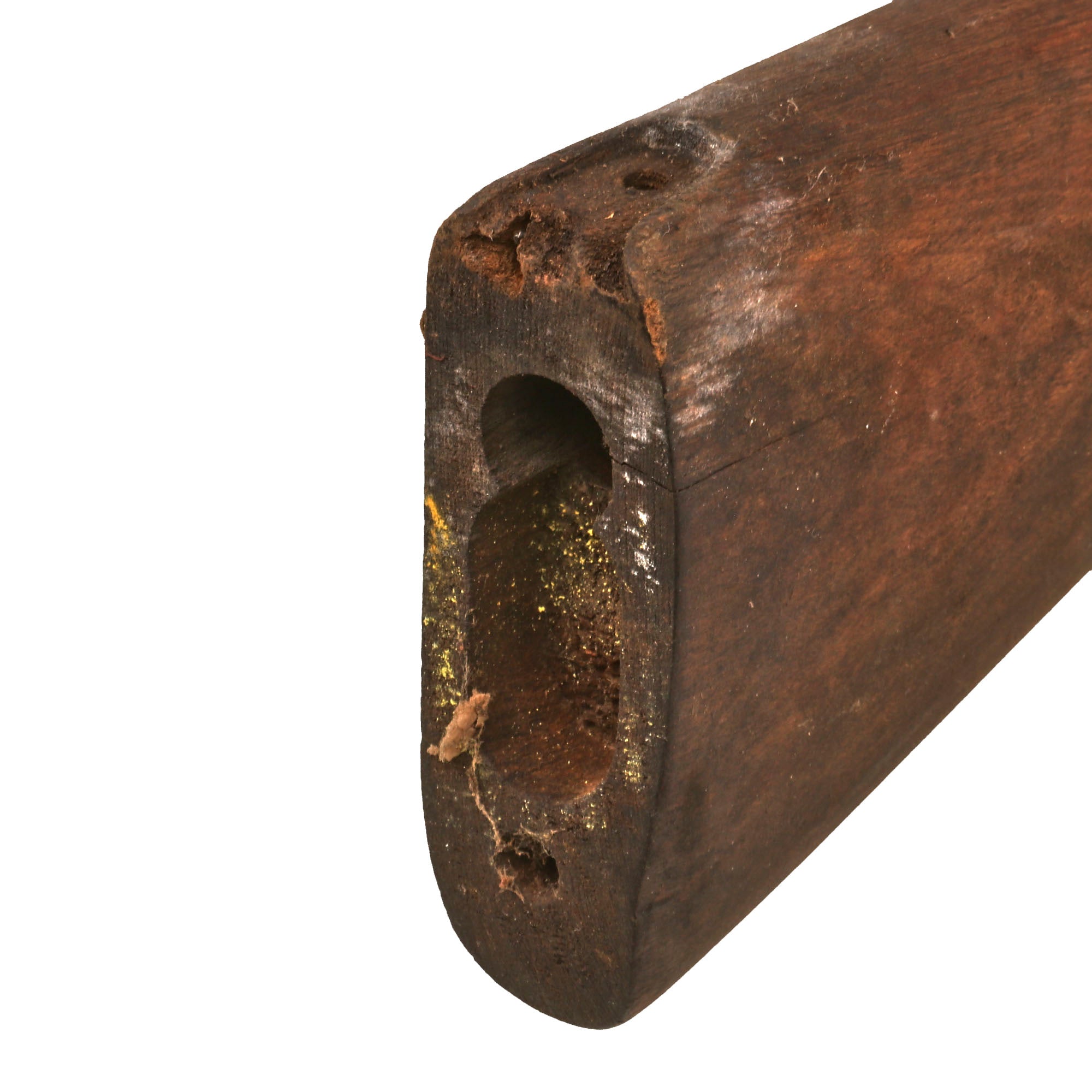 It is as we received it, out of long storage, and does show some staining from use, as well as some cracks. There is a "dutchman" style repair on the right side of the receiver area, and there is a crack on the right side of the butt stock by where the butt plate would be. Measures about 42 1/2 inches in length.