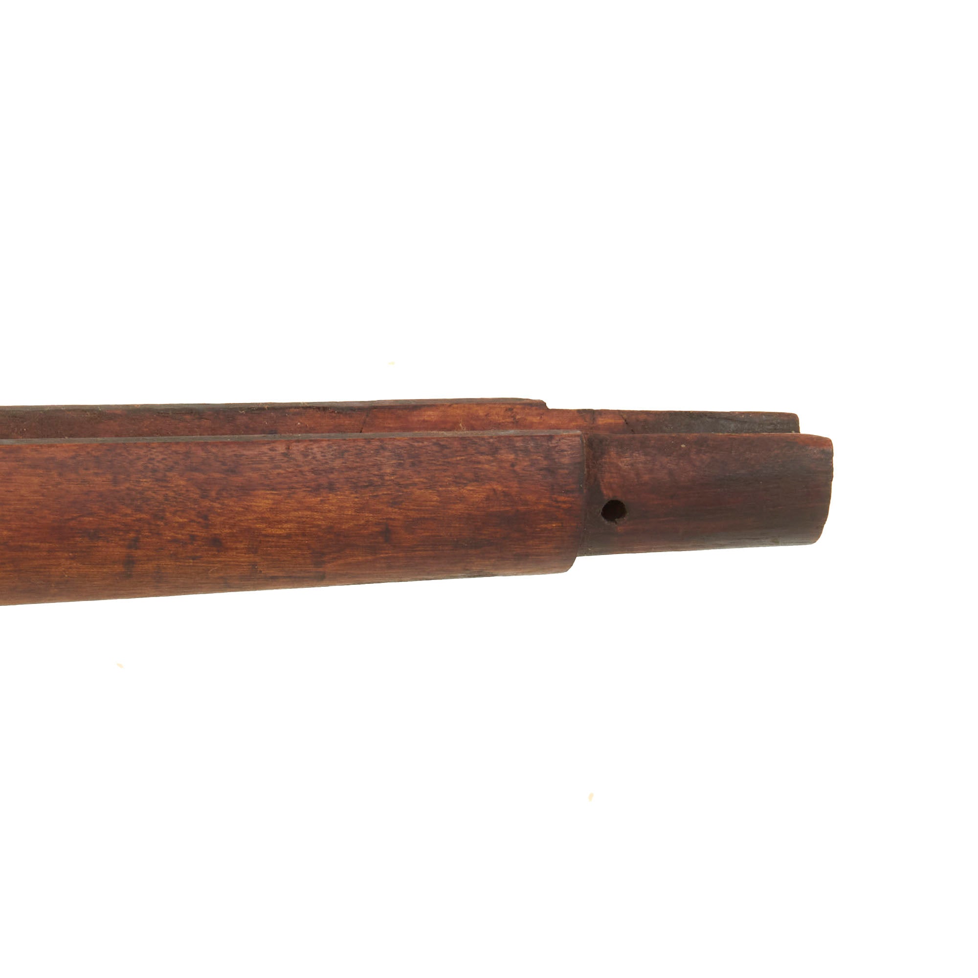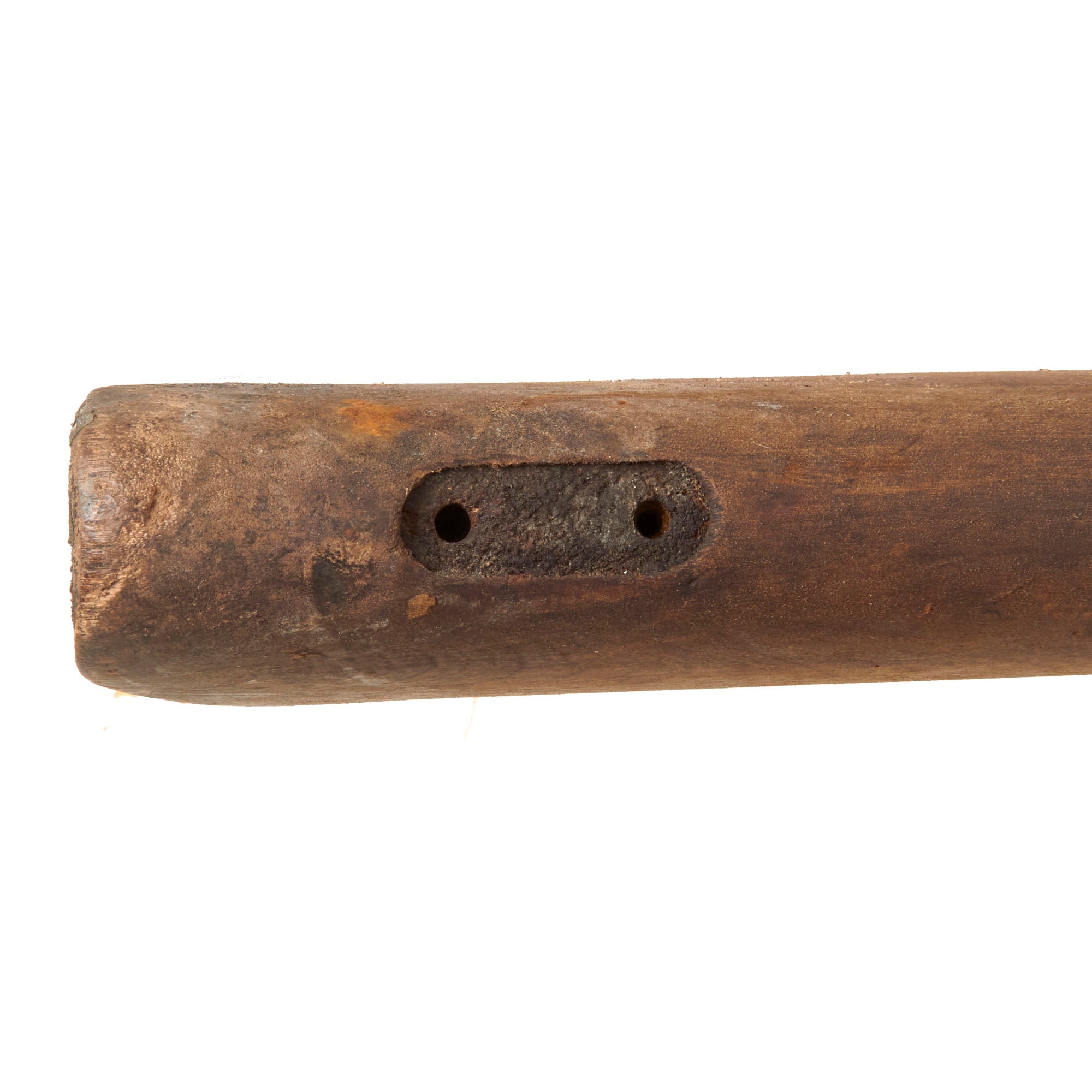 It is as we received it, out of long storage, and does show some staining from use, as well as some chips. There are some nicks and chips in the material but no cracks we can see. Measures about 42 1/2 inches in length. There is heavy darkening of the material in spots.