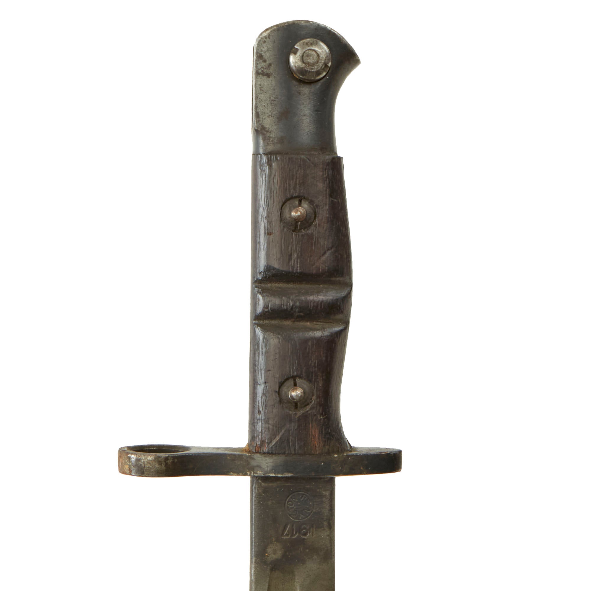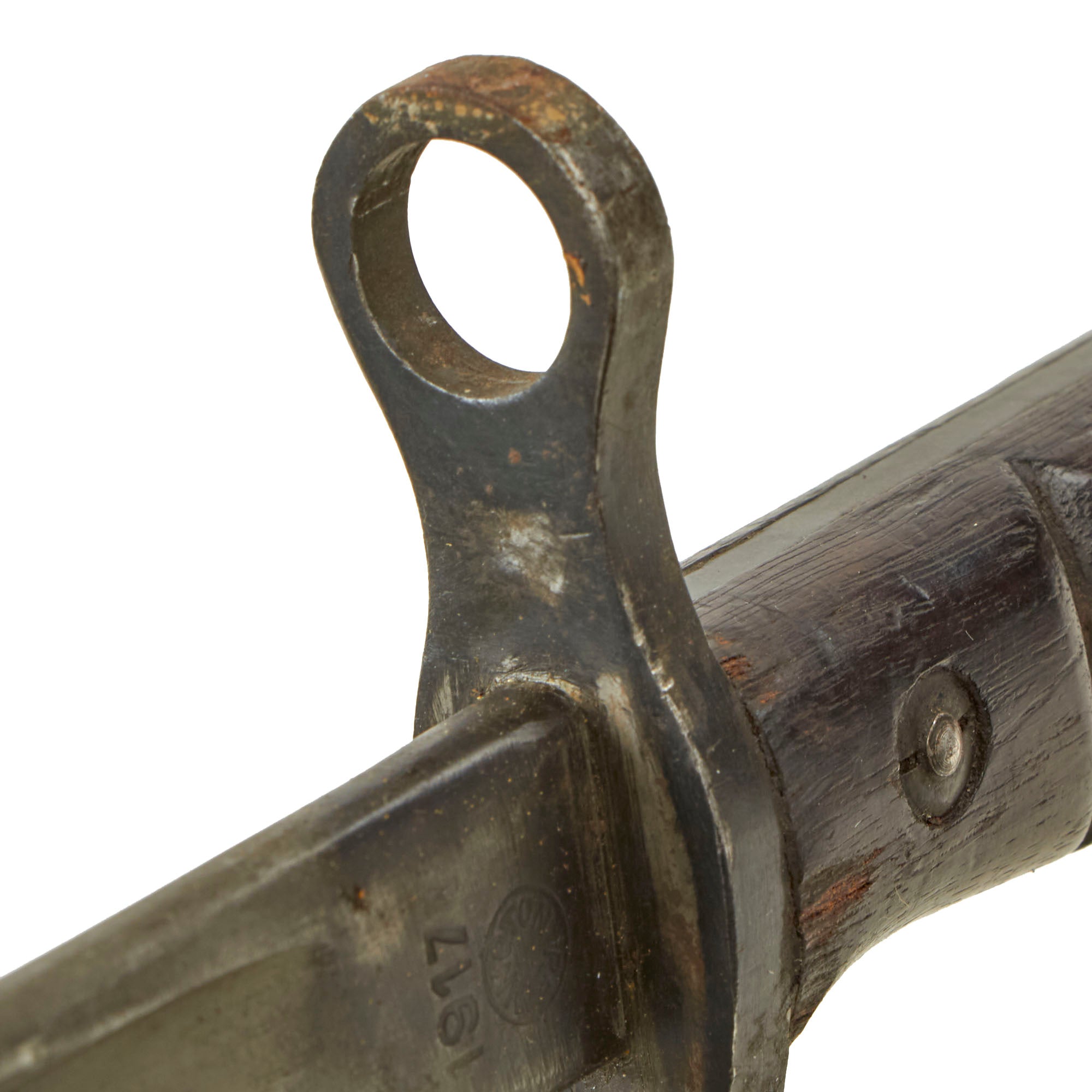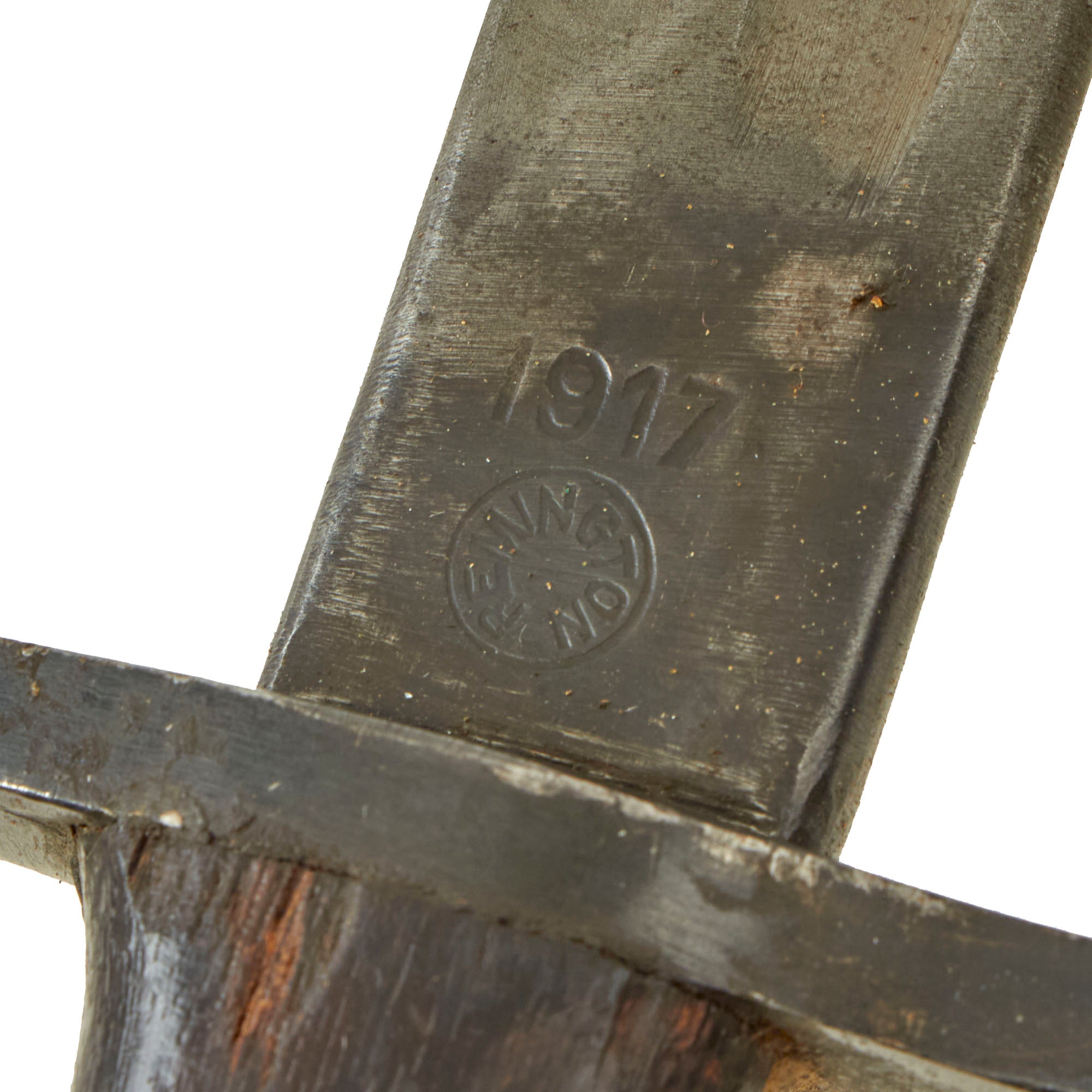 Original items: Only One Available. This is a great example of the rare and hard to find U.S. M1917 Enfield bayonet, in good condition. It comes complete with its original issue leather scabbard, which is also in very good condition. Bayonets by Remington are particularly hard to find, and therefore more desirable.