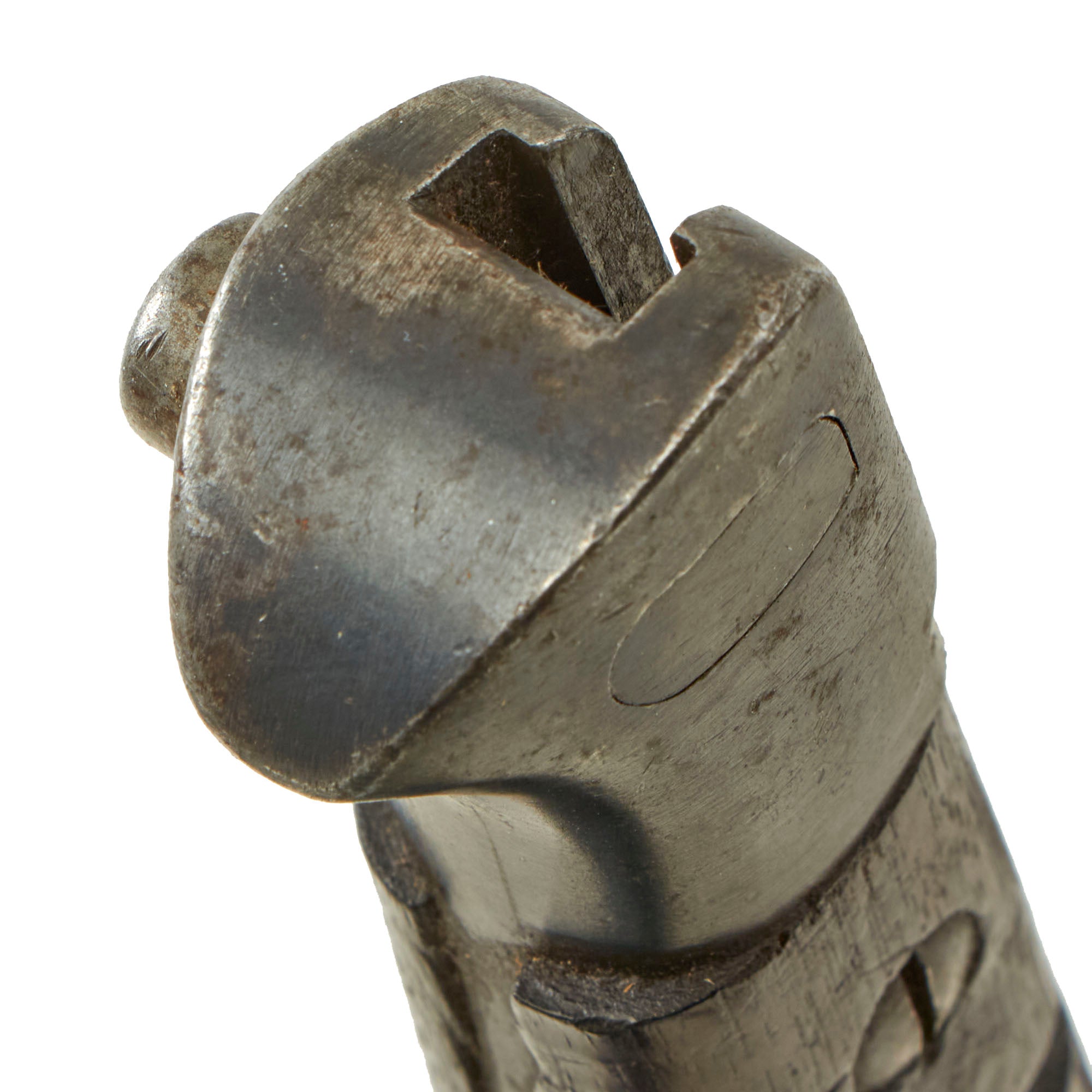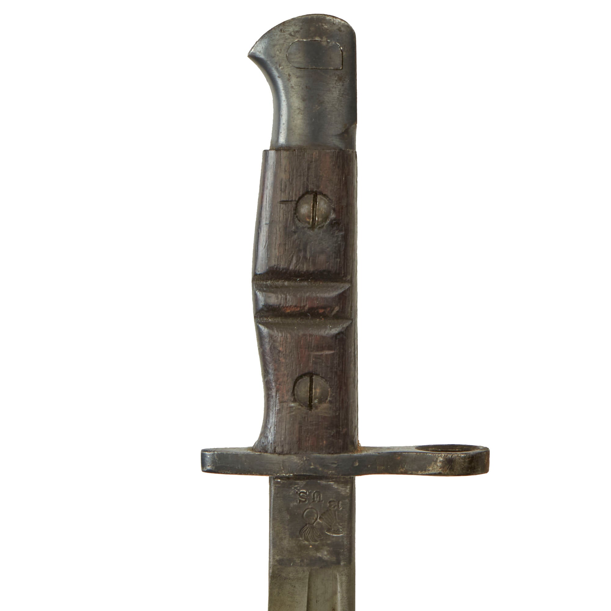 This bayonet is in good condition, and is marked on the blade ricasso with date 1917 over the Remington logo. The reverse ricasso is marked with the ordnance "Flaming Bomb" over U.S., next to an Eagle proof mark. The blade is good, without much oxidation or discoloration as shown, and was sharpened at arsenal once or twice. The edge does not have any nicks or damage, and the ricasso still has the original bluing. The handle finish has been worn almost bright from cleaning, and the wood of the grip is a bit service worn. The grip scales are excellent, with a great color.