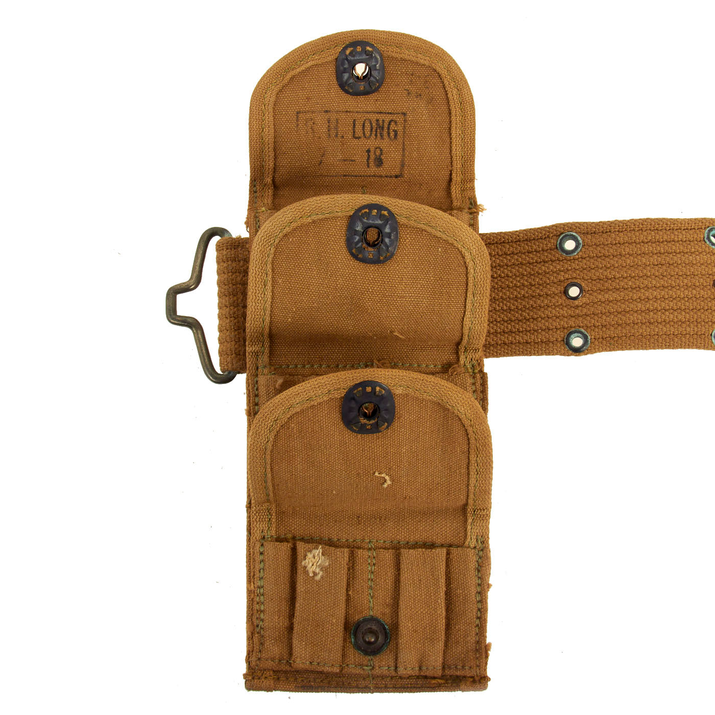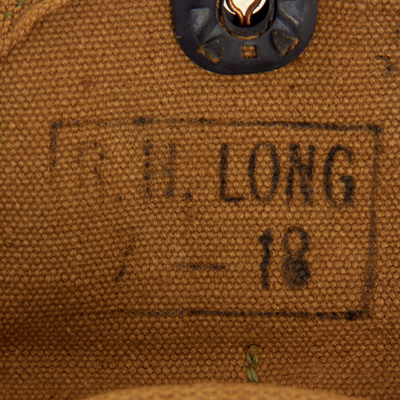 - “Half Moon” Revolver Clips Ammunition Pouch: The half moon pouch would hold two 3 round half moon clips in each pouch, totaling 6 clips, 18 rounds in total. The pouch is marked on the inside top pouch with R.H. LONG / 7-18 and it does show signs of field use and wear, but free of any extensive damage.
