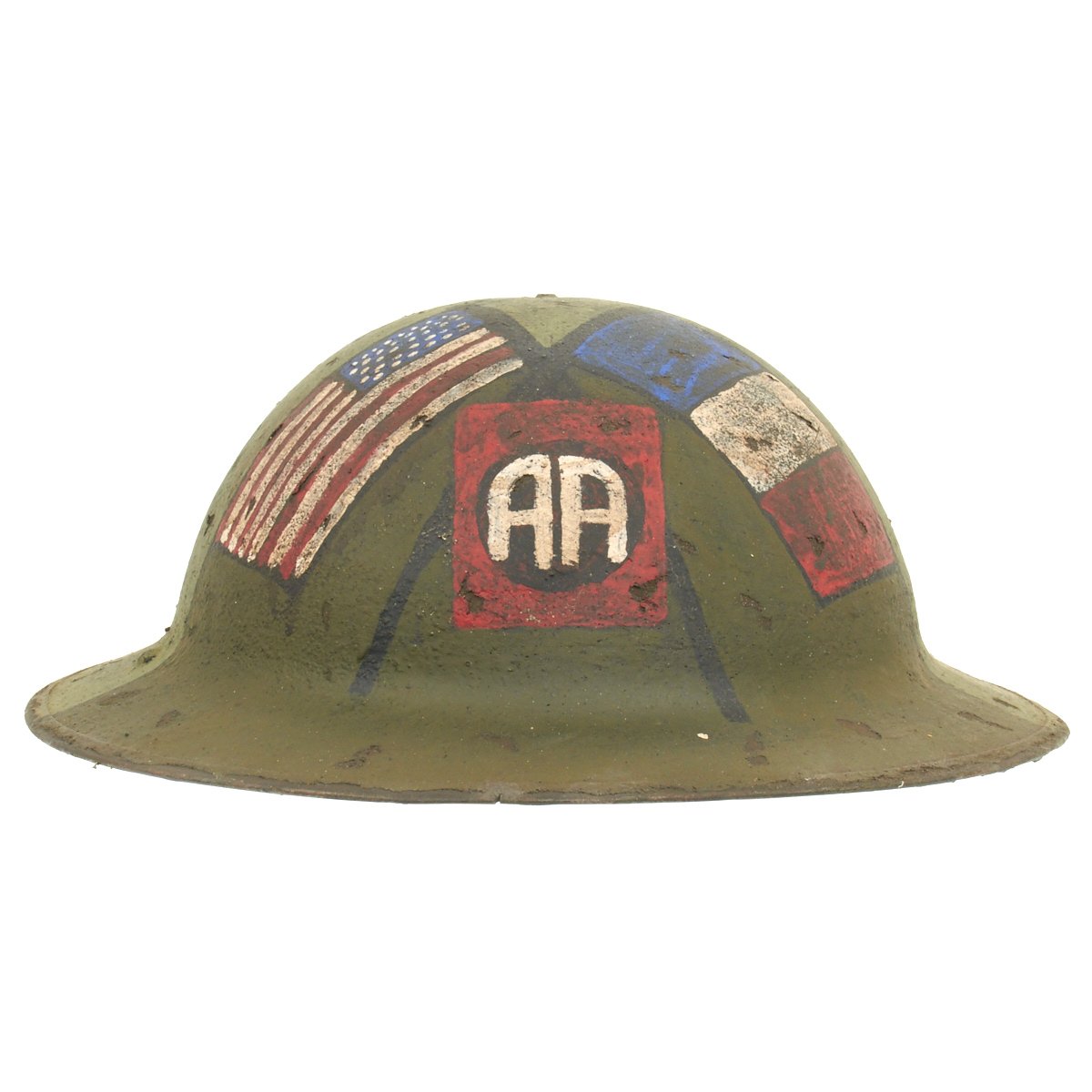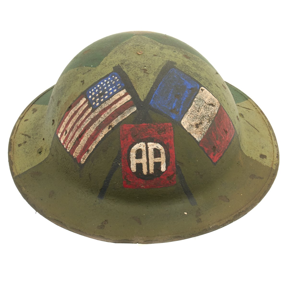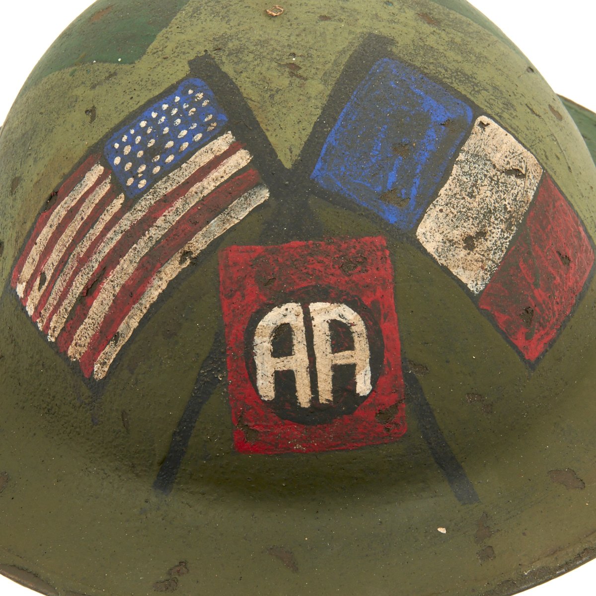 This fine example has been restored with new paint by a master helmet restoration expert. It is a fantastic camouflage design featuring the insignia of the 82nd Infantry Division, the opposed letter "A"s for "All American Division" along with American and French flags.