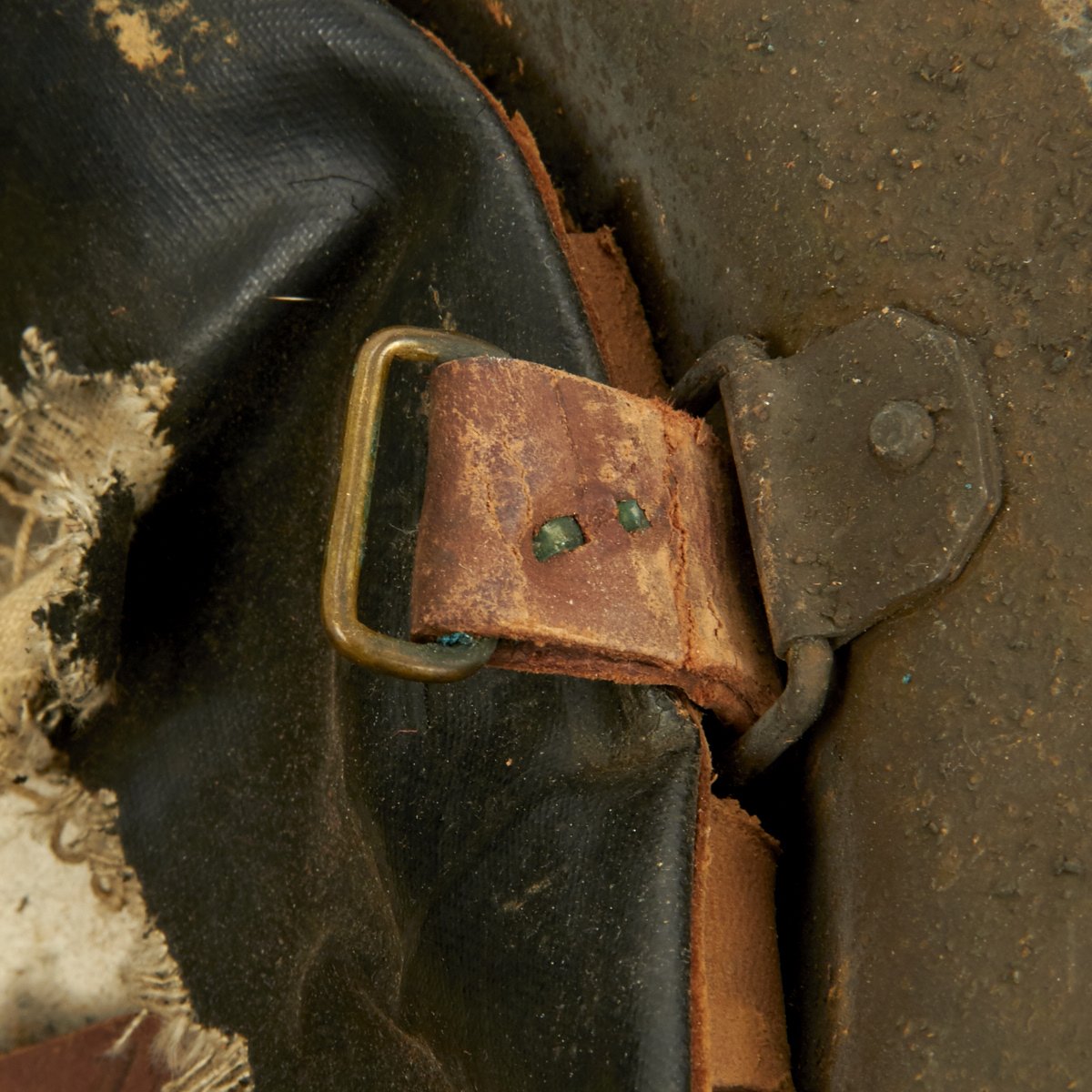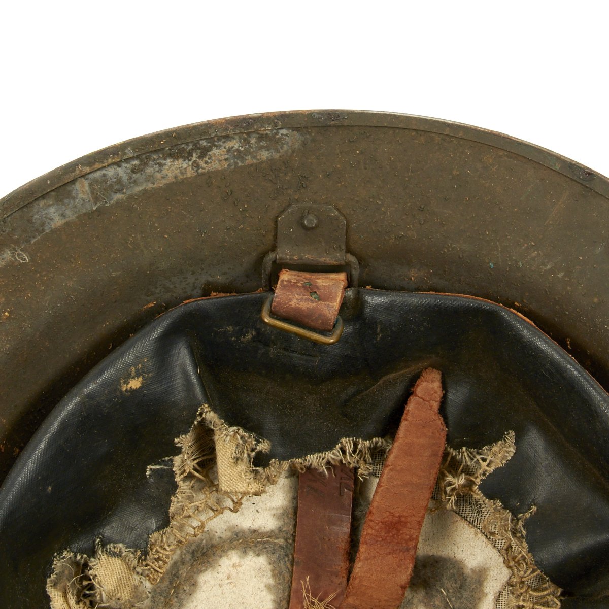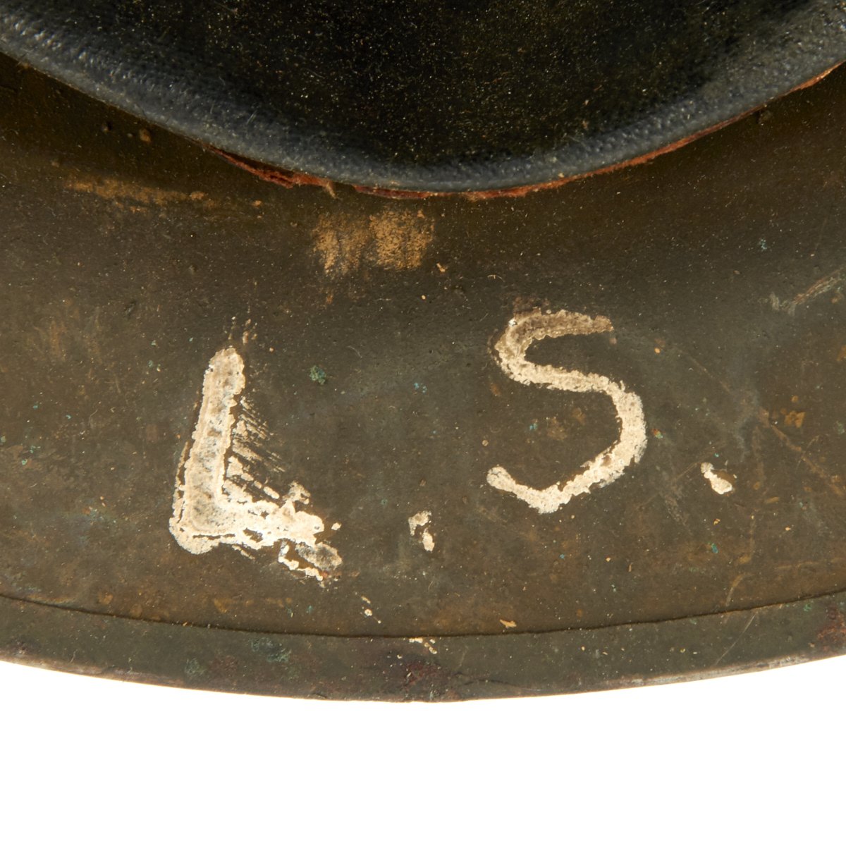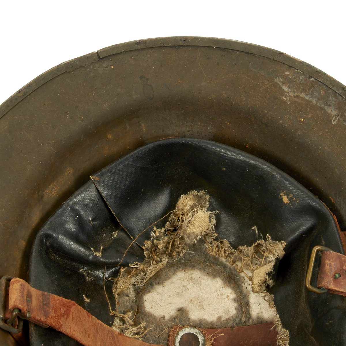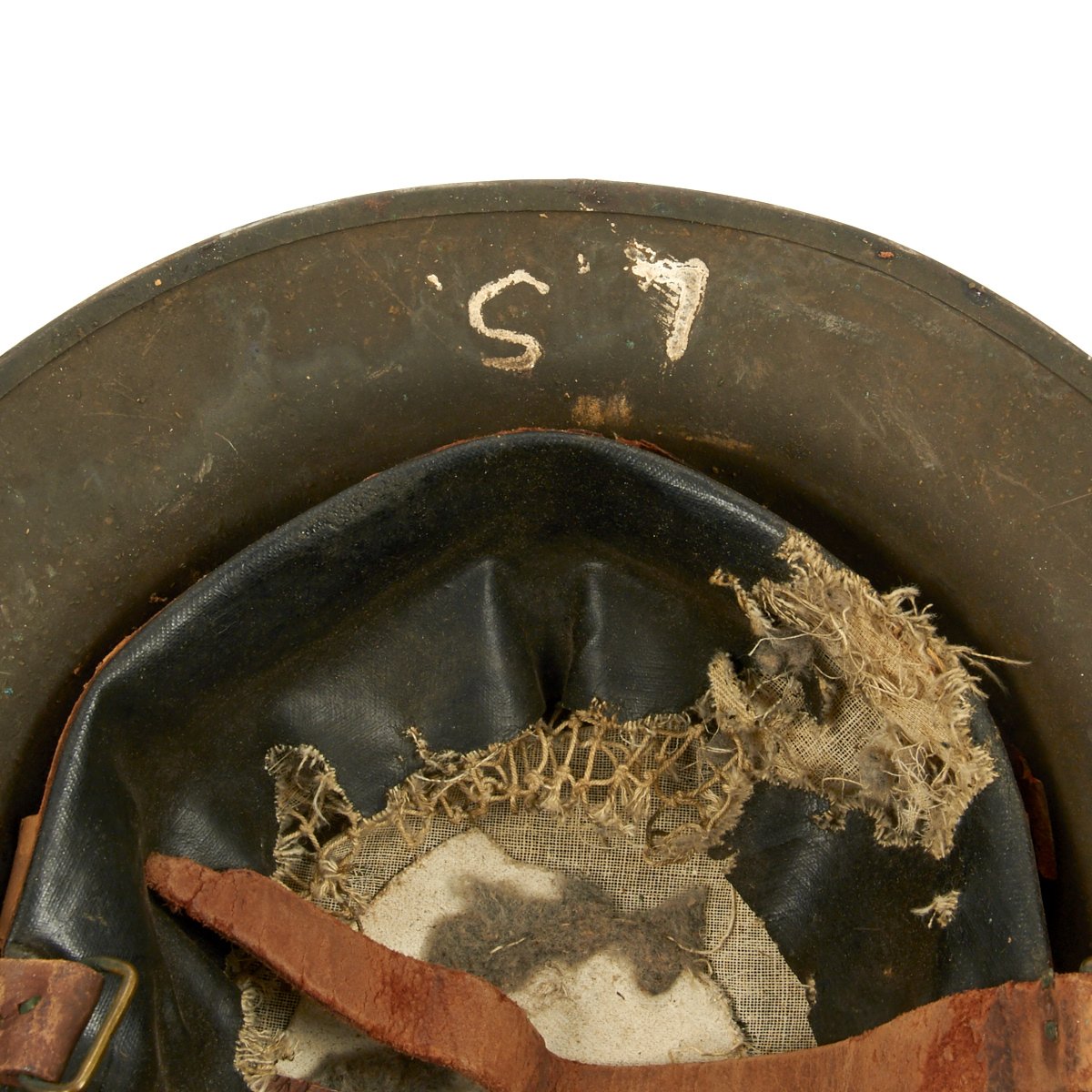 Helmet has a good portion of the original oil cloth liner, though it is somewhat deteriorated from age, and fragile. The instruction label at the top has long been removed. The shell is maker marked with the stamping on the underside of the rim TC 819, which along with the standard rivets for the chin strap bales, indicates that this is an American production helmet. The underside is also painted with initials L.S. to add to the impression.