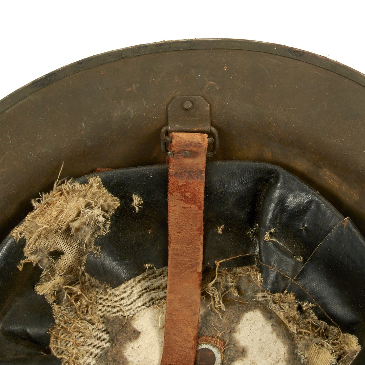 M1917 helmet liners typically show a paper label at the crown and the dome rivet head. The liner is set up as on the British versions, with an oilcloth band and net configuration, attached to a leather strap, riveted to the shell. The chinstrap is leather with steel buckle.