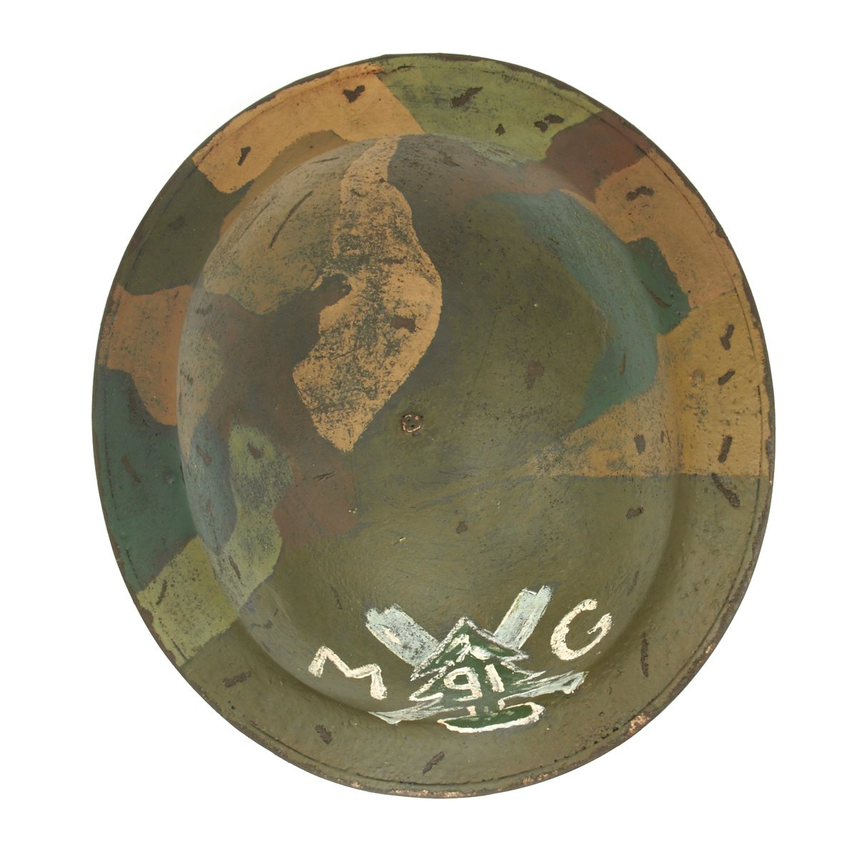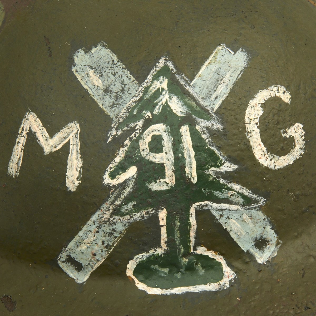 This fine example has been restored with new paint by a master helmet restoration expert. It is a fantastic camouflage design featuring the insignia of a Machine Gunner in the famous 91st Infantry Division known as the Wild West Division.