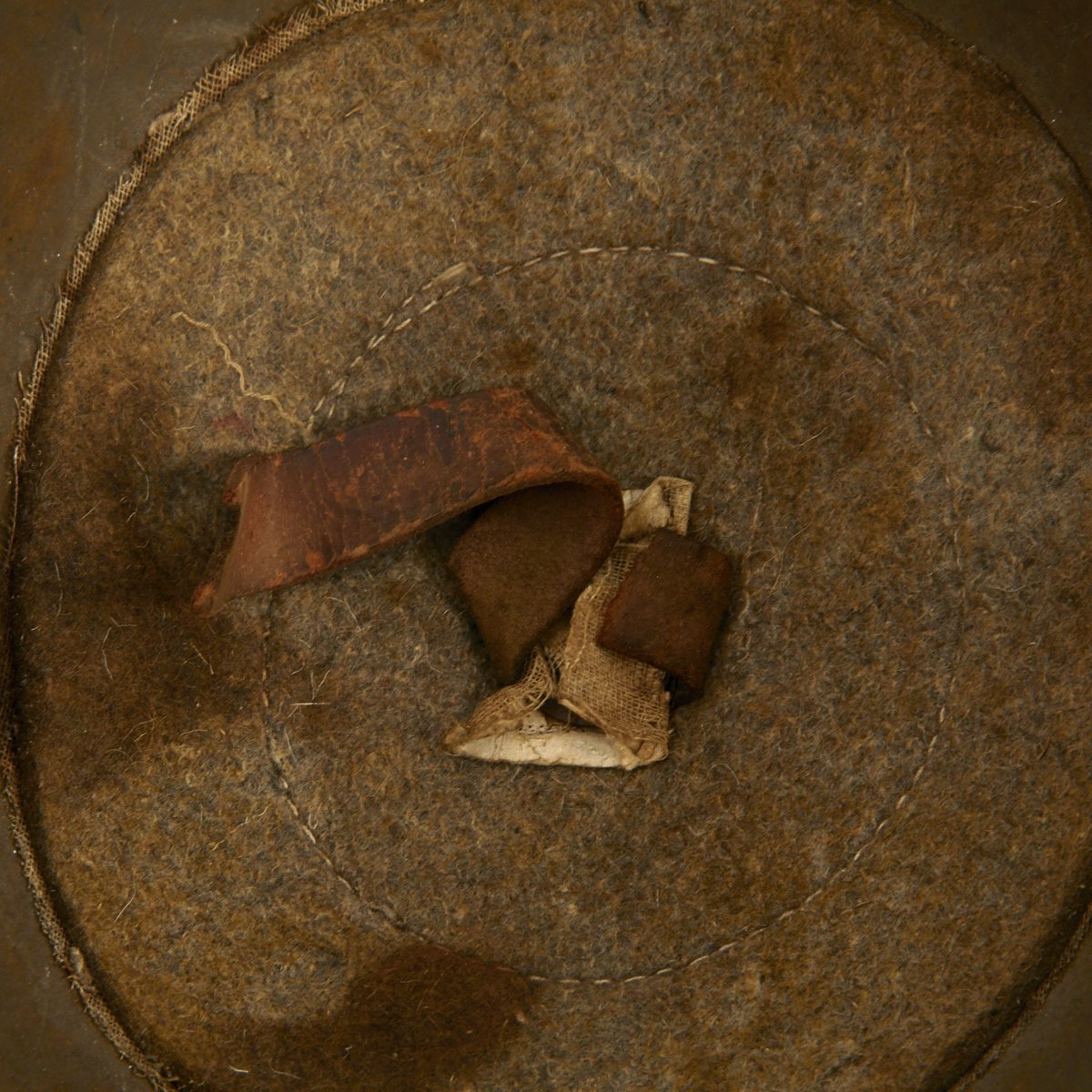 M1917 helmet liners typically show a paper label at the crown and the dome rivet head. The liner is set up as on the British versions, with an oilcloth band and net configuration, attached to a leather strap, riveted to the shell. The chinstrap is leather with steel buckle.